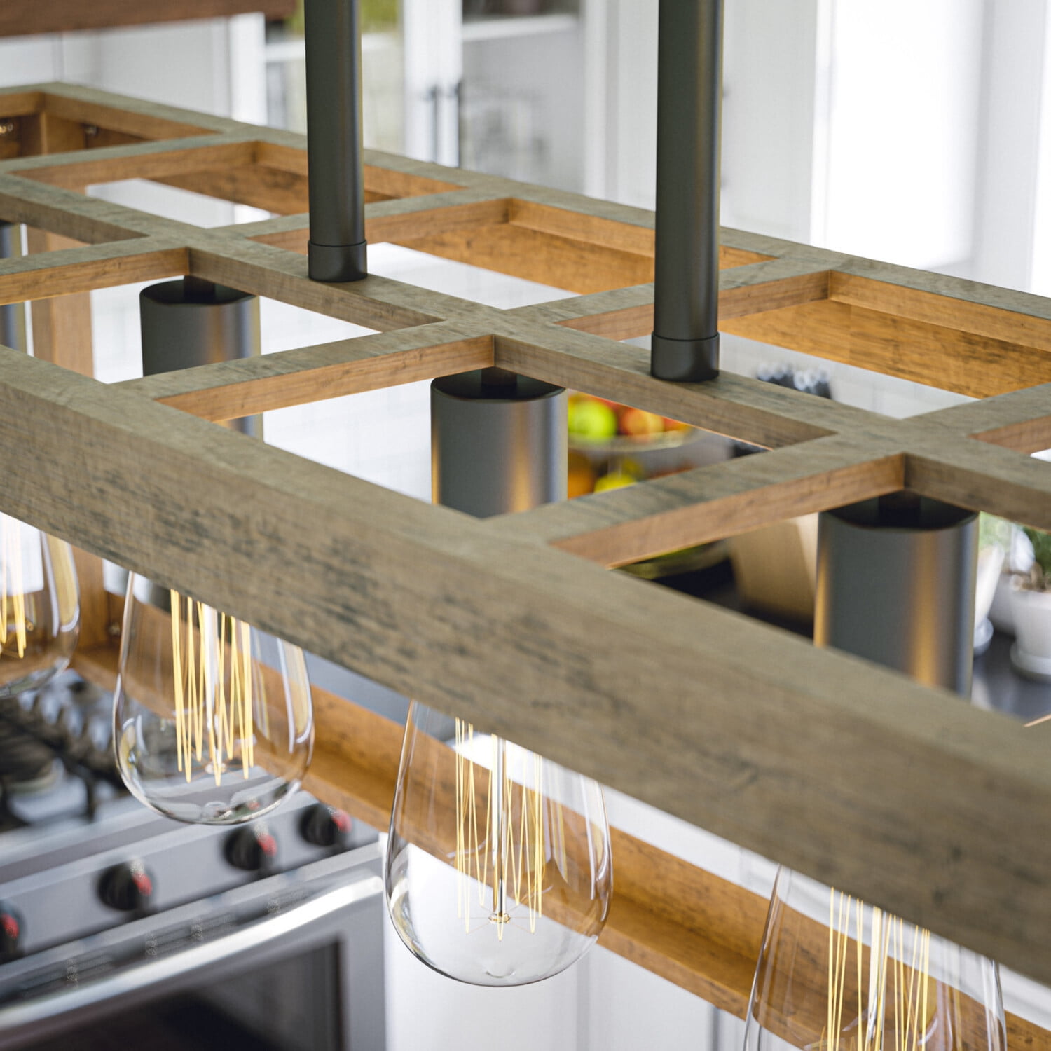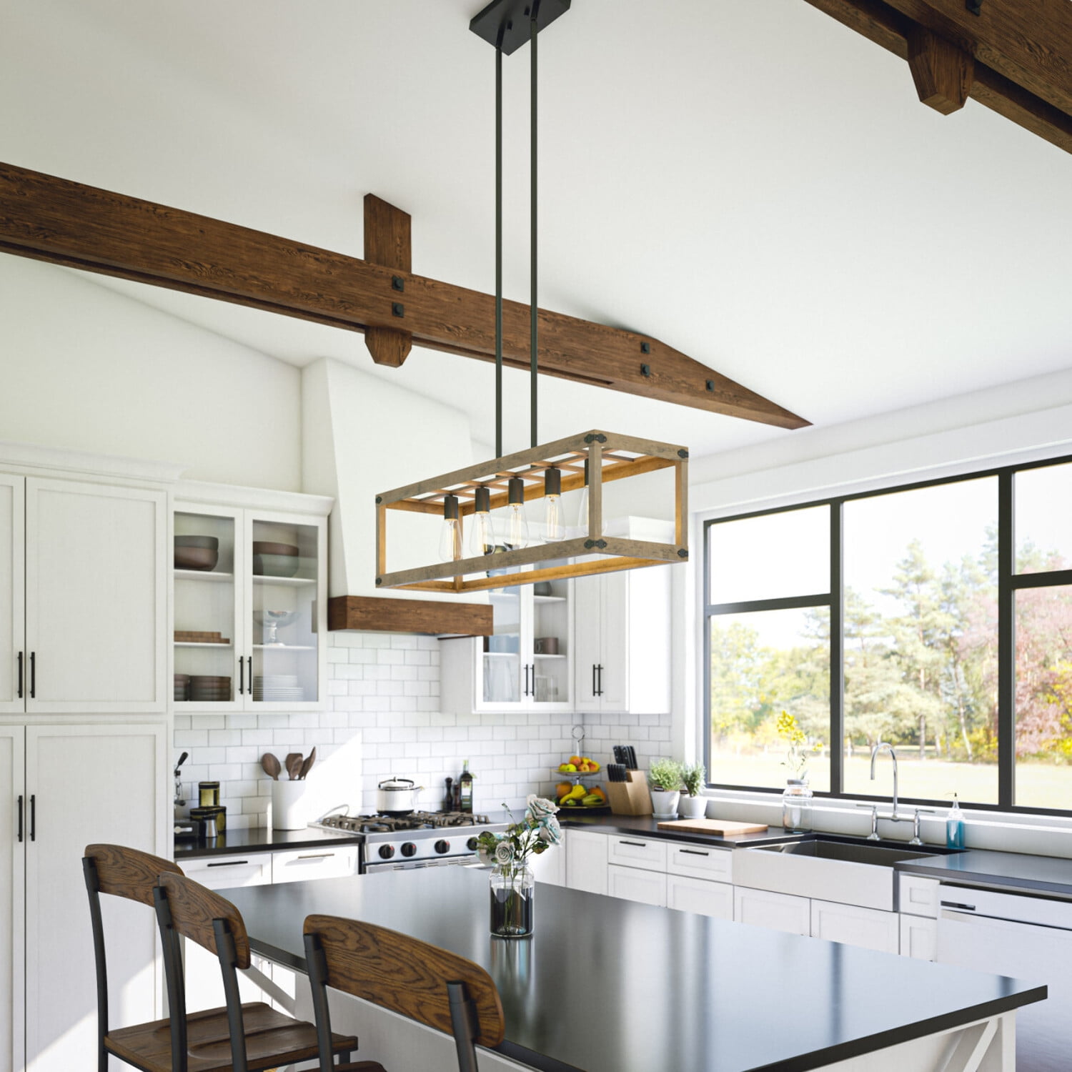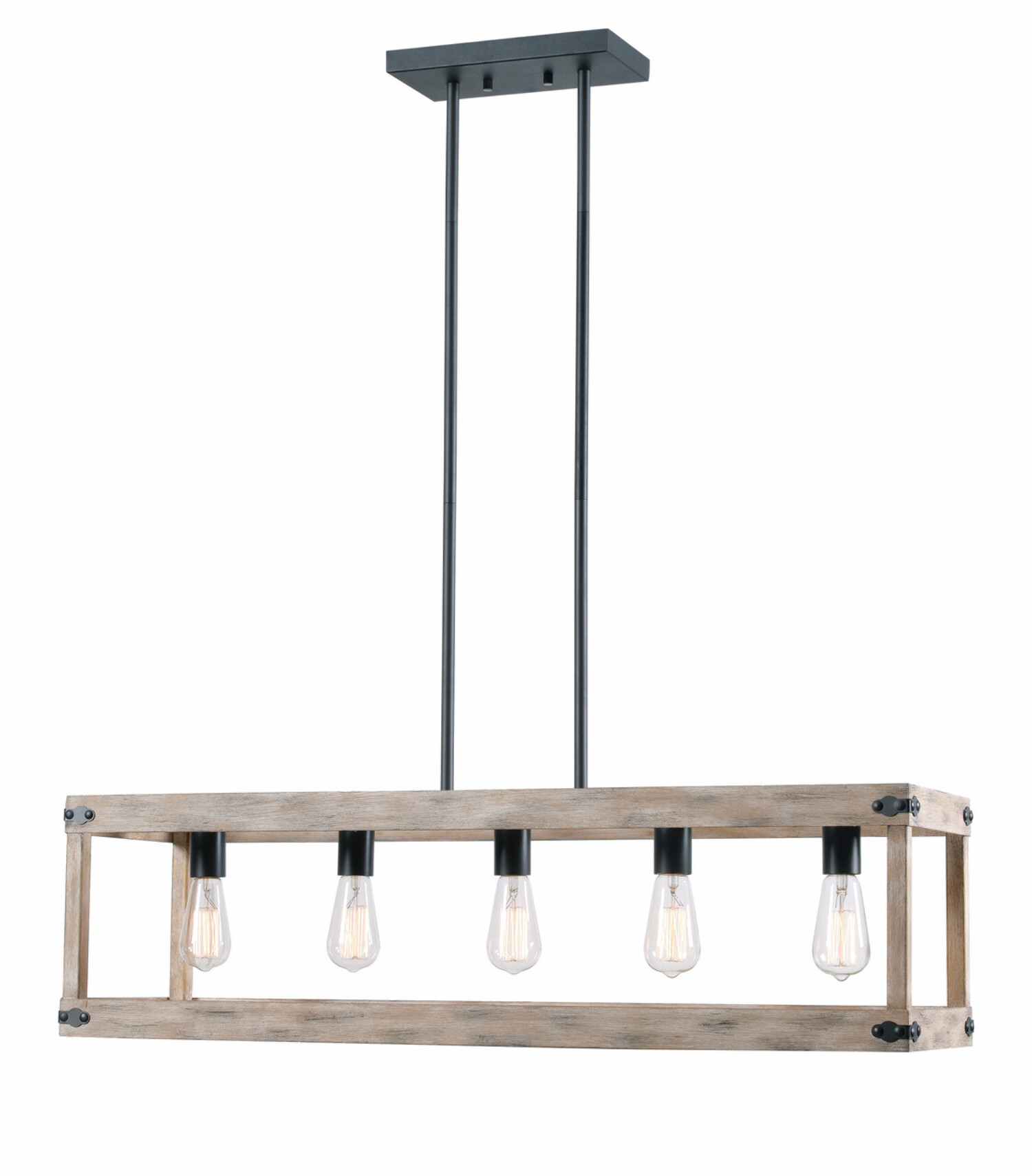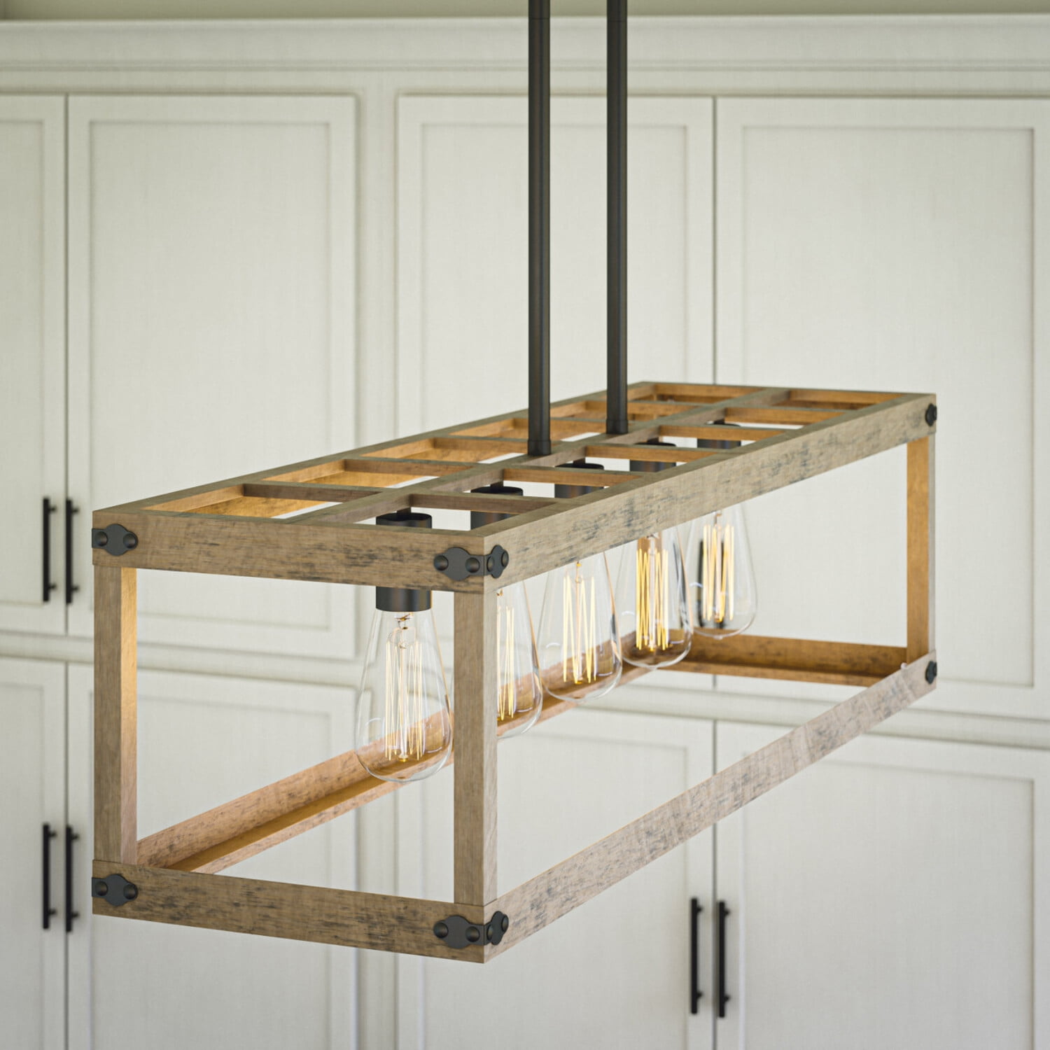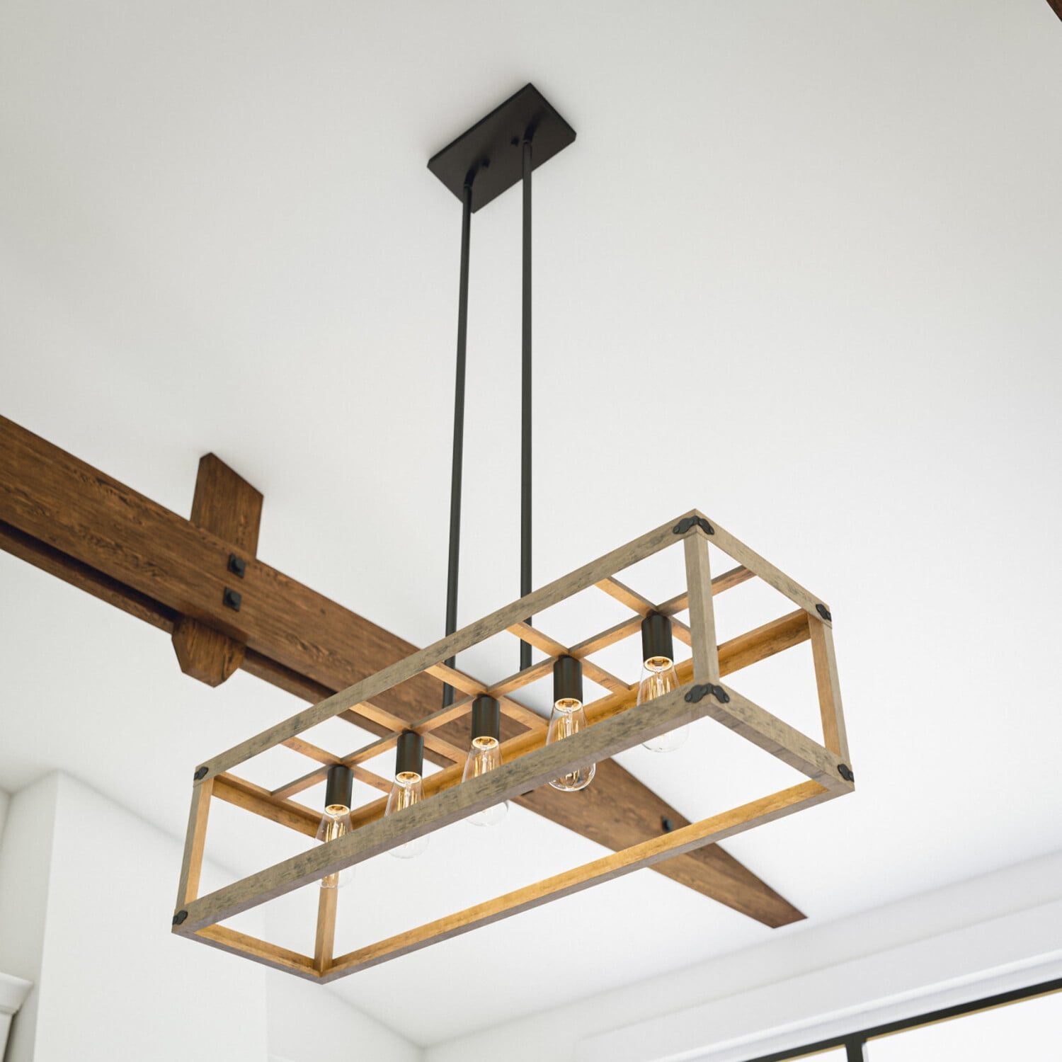 Modern Farmhouse Charm: Modern clean lines and a distressed woodgrain finish add plenty of casual rustic charm to this kitchen island light. Comprised of an open wood frame and five exposed Edison style bulbs, this kitchen island fixture fills your kitchen and dining room with plenty of atmospheric, warm light while accenting your modern farmhouse home décor. Dimensions: 10 Inch Height, 36 Inch Width, 11 Inch Ext; Includes 5-60 Watt Antique Style Vintage Edison Bulbs Lighting Profile: Exposed bulb profile creates a bright, area-filling atmospheric glow that provides plenty of light for meal prepping, cooking and crafting Edison Bulb Included: This island light includes 5 LED antique-style Edison bulbs so you can add a warm, atmospheric light with vintage charm to your living space