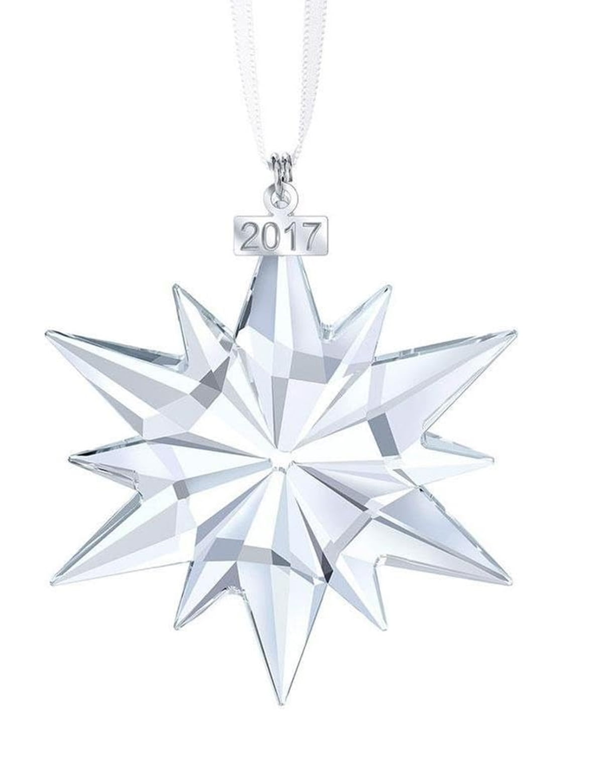 The Swarvoski Annual Edition Ornament 2017 5257589 is only available during the holiday season. This elegantly designed item can make a wonderful addition to a collection or can also make a memorable gift. The 2017 Christmas ornament can be given to mark special occasions such as births, weddings, anniversaries and more. It is shaped like a fancy star and is crystal clear in color. This allows for it to reflect and shine near Christmas trees, making it a beautiful display. This ornament also comes with a white satin ribbon that is durable enough to hang safely on real or artificial branches.