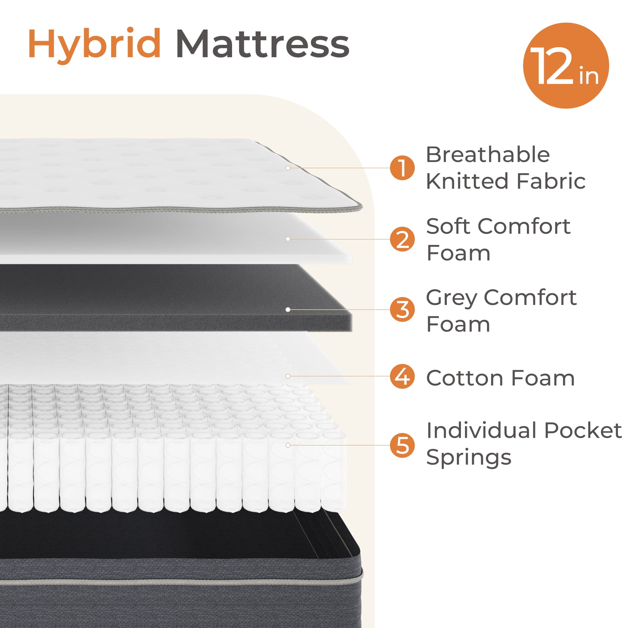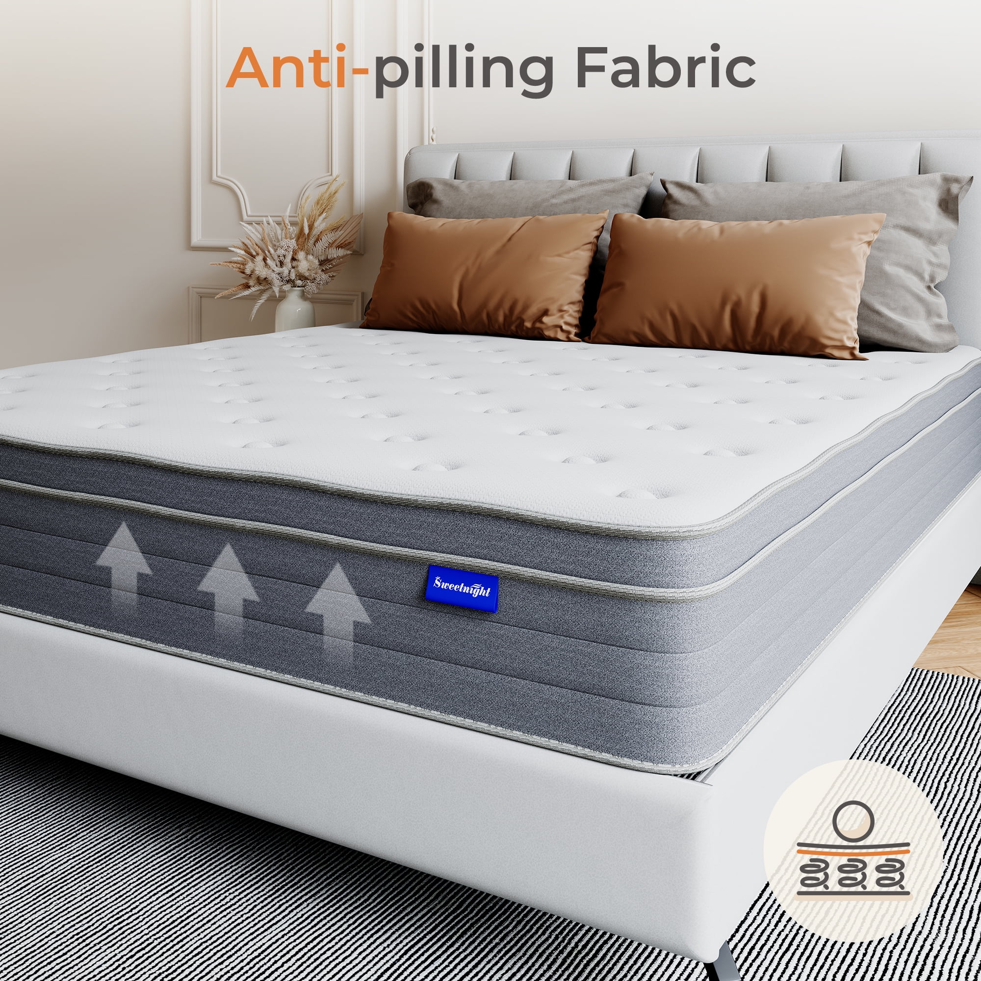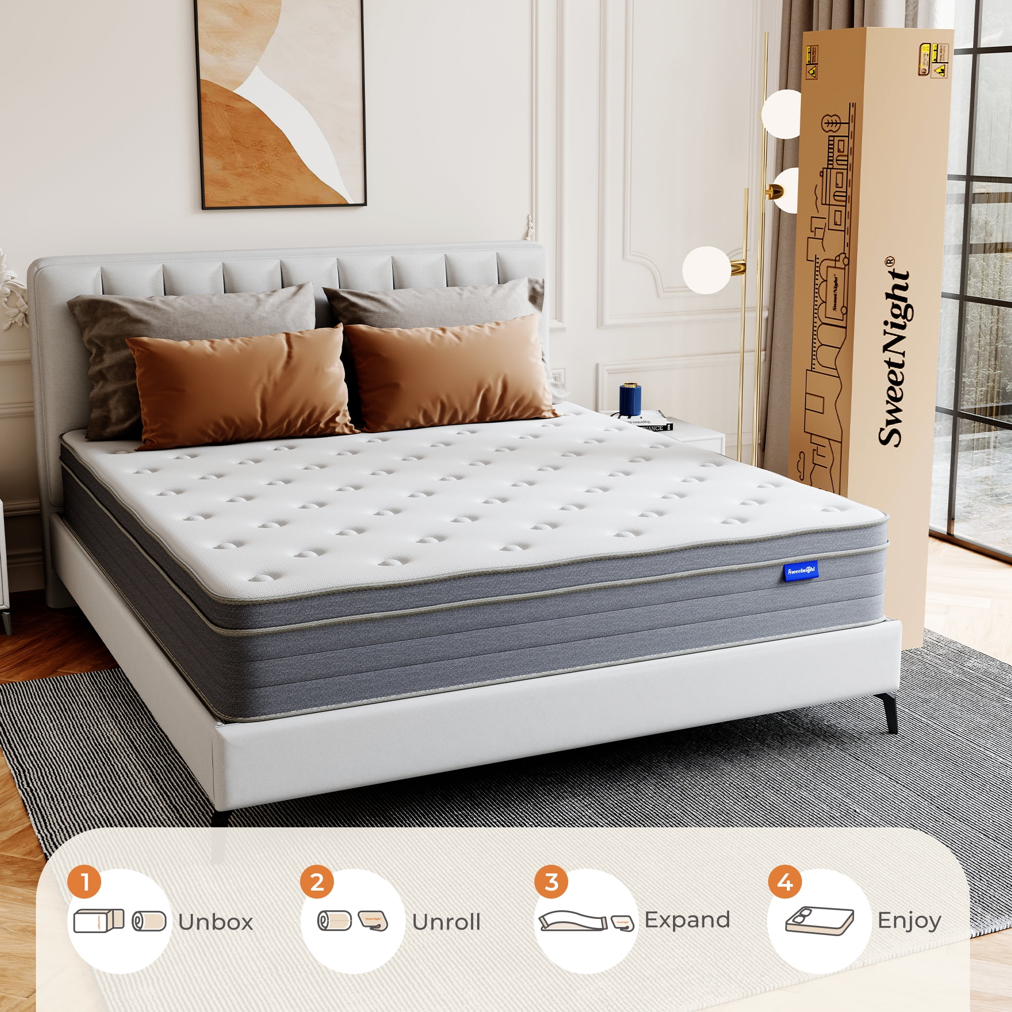 Ergonomic support of gel memory foam and comfort foam layers reduce pressure points between shoulders,neck and back Our foam is infused with cooling gel that draws heat away from your body and keeps a steady temperature while you sleep Sweetnight 3-layer foam perfectly fits your body curve and provides good and even support for your body King size mattresses have firm edge support, so you can sleep to the edge without feeling like you might roll off King mattresses’ gel memory foam meets CertiPUR-US program standards for performance, emissions, and durability Hybrid mattress’s breathable cover certified by OEKO-TEX is hypoallergenic & friendly-skin, which makes you comfort Cool gel memory foam mattresses are motion isolation so that your partner can’t feel it on the other side of the bed if you move Sweetnight mattresses can be used on platform bed/spring bed/adjustable bed frame/slatted base/RVs, even on the floor King mattress in a box is compressed and rolled, which is easy for setup and delivery please place 12 inch hybrid mattress in a ventilated room and wait 72 hours to allow it to fully expand