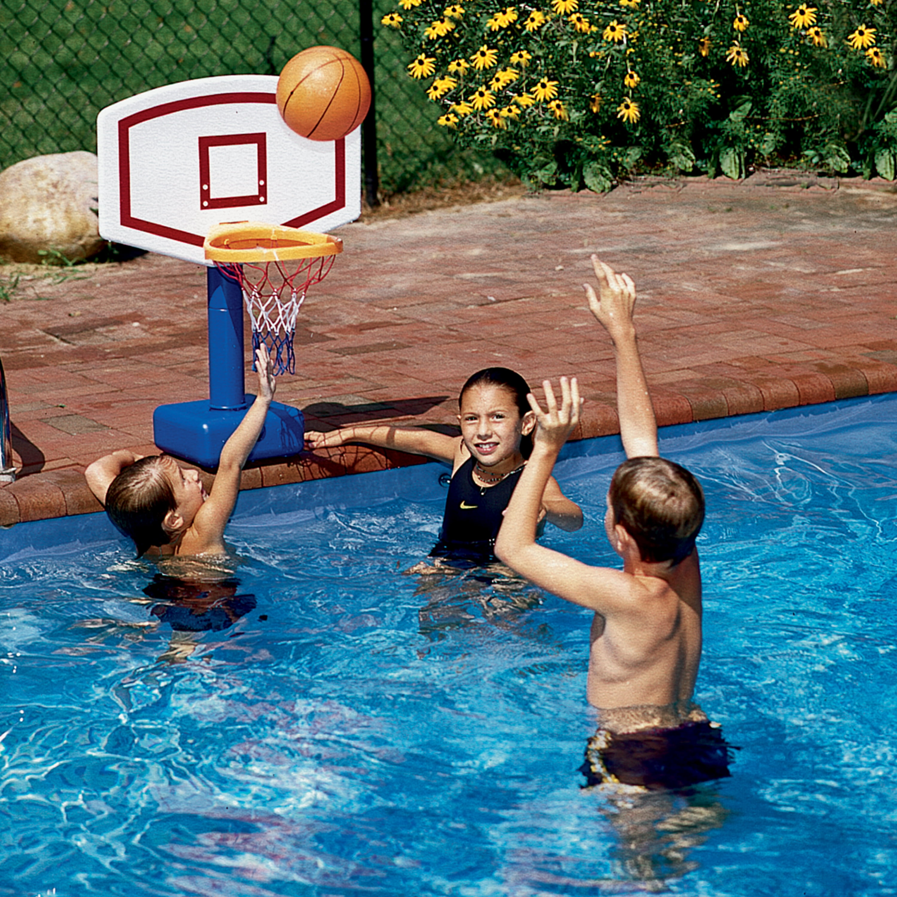 One of the most fun things to do in a backyard swimming pool is to have a basketball game in the water. Playing a game in the pool is also great exercise for the kids and adults also will enjoy the fun. Whether getting competitive or just fooling around, pool basketball game is fun for swimmers of all ages. This set has a durable basketball backboard that is blow molded plastic with adjustable height. This particular pool game set also includes one basketball and is for inground pools only. Just fill the Base with water or sand to weigh down for hours of fun! Recommended for ages 4 years and up. WARNING: CHOKING HAZARD — Small parts. Not for children under 3 yrs.