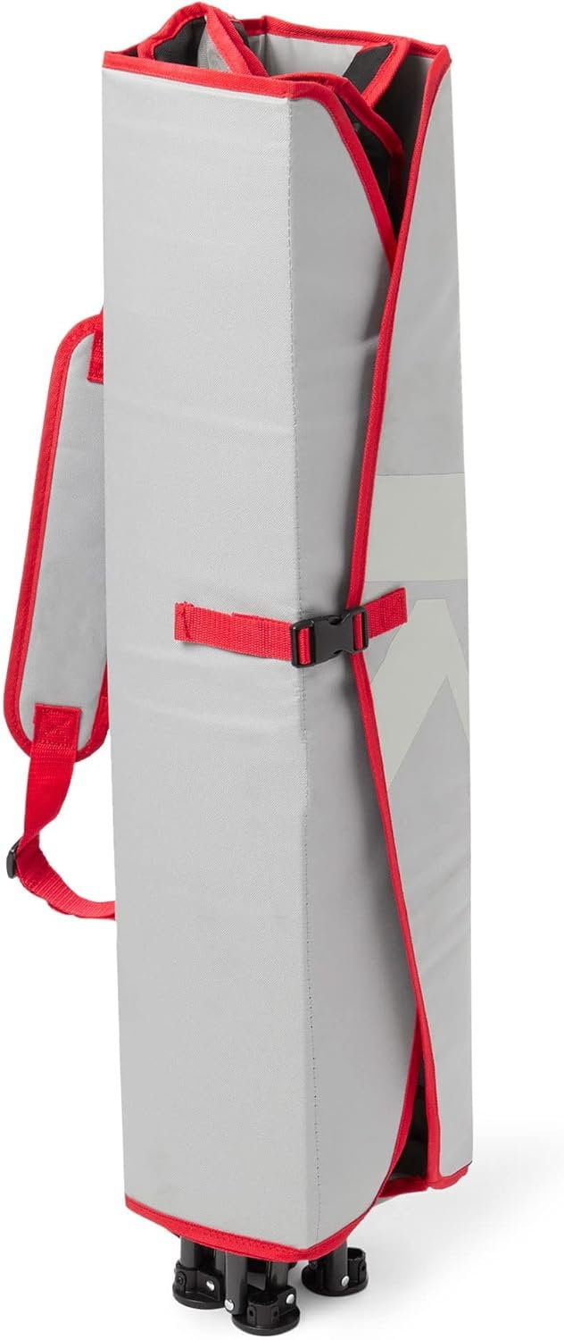 SwimWays Foldable Camping Chair with Canopy, Red/White/Gray Outdoor canopy chair that converts from a quadstyle camp chair into a personal canopycovered oasis Retractable sun canopy offers 50+ UPF sun protection and can be lowered behind the chair while seated Portable design with the canopy serving as the carry case when folded, secured by a durable snaplock buckle Attached shoulder strap provides handsfree portability—no carrying bag needed! Versatile for family camping trips, tailgating, and watching kids from the sidelines