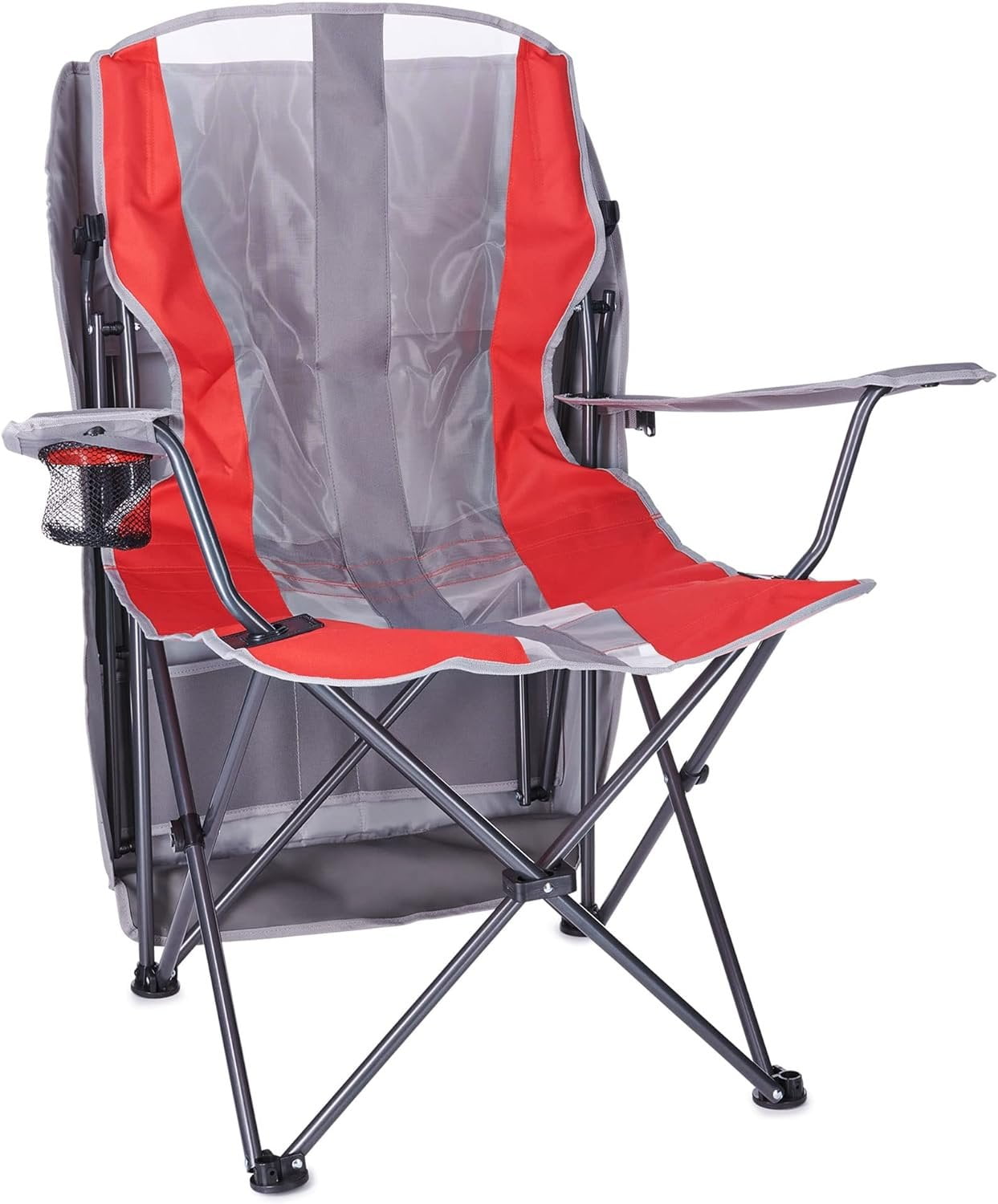 Protect yourself from the elements with the Kelsyus Original Foldable Canopy Chair. This portable camping chair converts from a familiar quad-style camp chair into your own personal canopy-covered outdoor oasis. The retractable sun canopy protects you from the elements with 50+ UPF sun protection, and it can be lowered behind the chair while you are still seated when you want to catch some rays. The large cup holder with o-ring provides stability and convenient access to your favorite drink, while the oversized arm rests offer added comfort. The canopy becomes the carry case when folded secured by a durable snap-lock buckle, and the attached shoulder strap provides hands-free portability – no carrying bag needed! Additional premium features make it the leader of the pack, such as an oversized seat with a rounded front edge for more ergonomic comfort and breathable mesh fabric to keep you cool. The sturdy powder-coated steel frame provides long-lasting durability and can support kids and adults up to 250 lbs. The Kelsyus Original Canopy Chair is the perfect companion for your family camping trips, tailgating, and for watching the kids from the sidelines! One grey and red chair is included measuring 37″L x 24″W x 58″H.