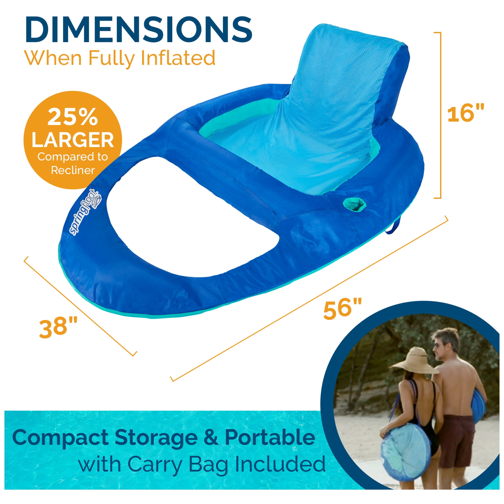 INFLATE & DEFLATE 3X FASTER – Unique patent pending Hyper-Flate Valve takes the stress of setting up and putting away your hammock faster than ever, no pump needed, so there’s more time to relax and have fun INFLATABLE RECLINER XL POOL FLOAT: Features a patented inner spring and a built-in head rest, back rest, foot rest, and cupholder for comfortable and convenient lounging COMFORTABLE DESIGN: Fabric-covered inflation and a soft cooling mesh bed that cradles your body just below the surface of the water, and the foldable construction allows for easy storage FOLDABLE PORTABLE DESIGN – Folds flat into three compact circles for portability and storage (carry bag included) – great for travel to any destination! DIMENSIONS: Measures (when fully inflated) 56″L x 38″W x 16.9″H and supports most adults up to 300 lbs. Recommended for ages 15 and up Includes: 1 SwimWays Spring Float Recliner XL WARNING: CHOKING HAZARD – Small parts. Not for children under 3 years. Covered by the Spin Master Care Commitment. If you have a problem with a Spin Master product that you purchased from an authorized seller, we’ll resolve it! Because Spin Master is unable to control the quality of products sold by unauthorized sellers, unless otherwise prohibited by law, the Care Commitment is not available for products purchased from unauthorized sellers. The Care Commitment is limited to the original end-user purchaser. You may also be required to provide proof of purchase and/or a picture of your product to Spin Master to verify eligibility. Spin Master reserves the right to verify information, require a valid proof of purchase, and to deny request in its discretion