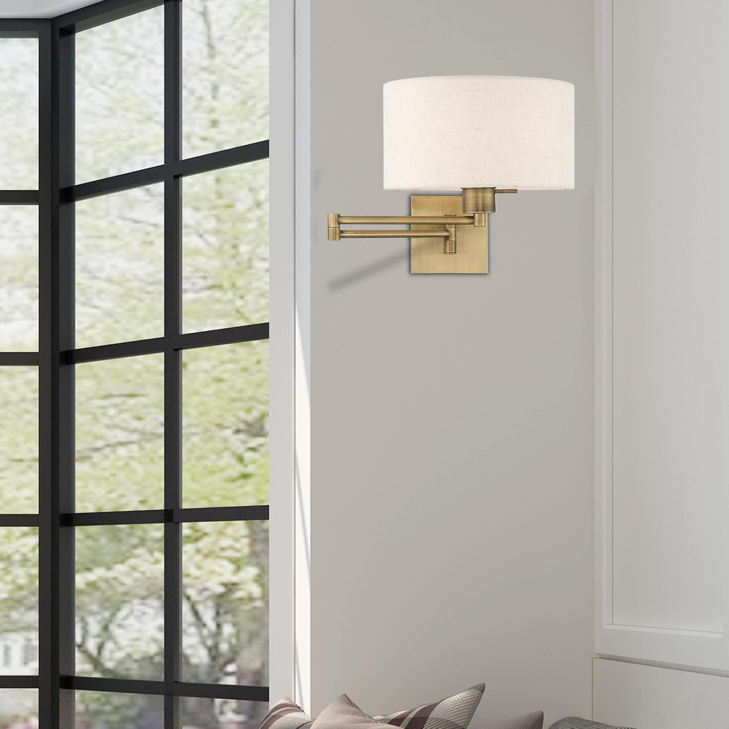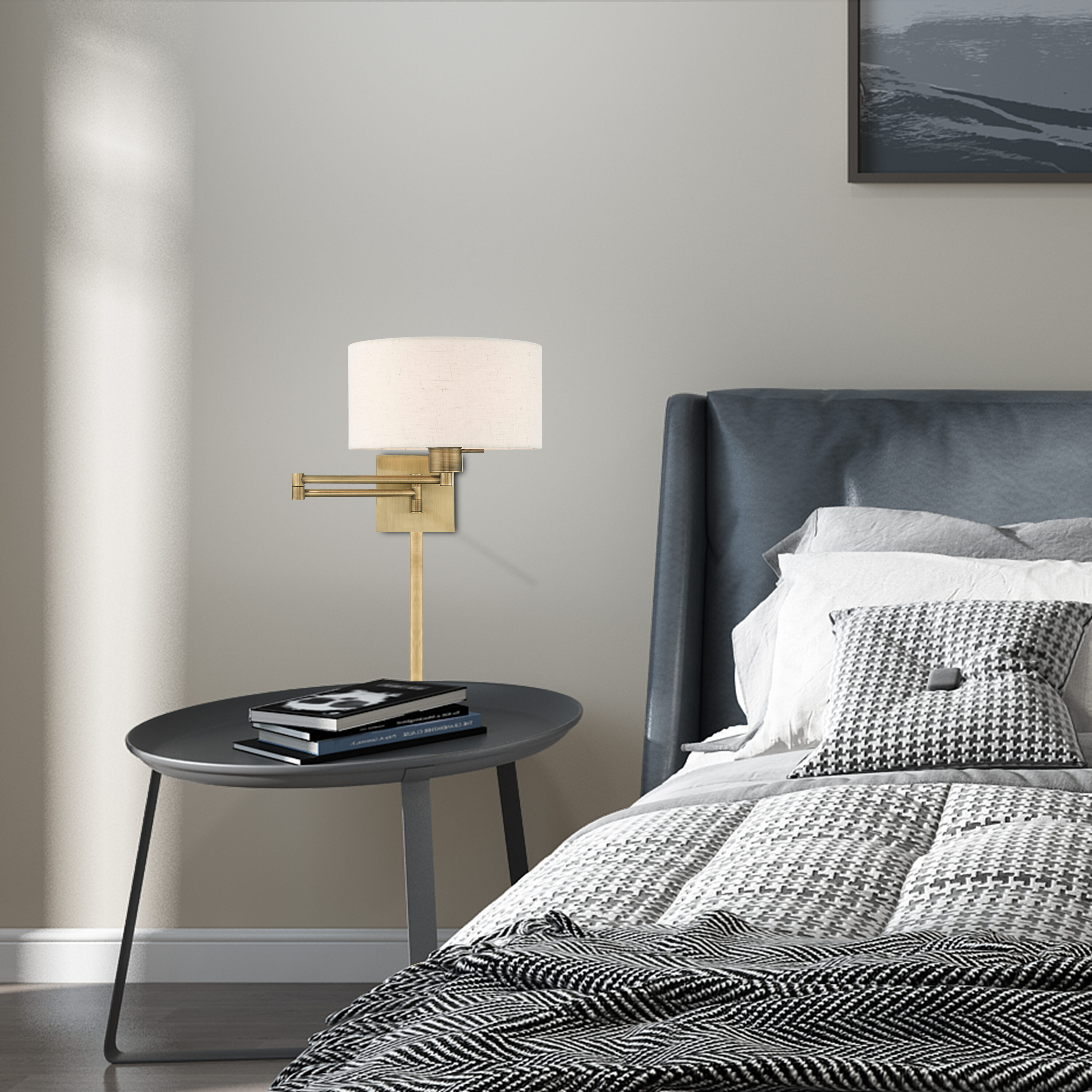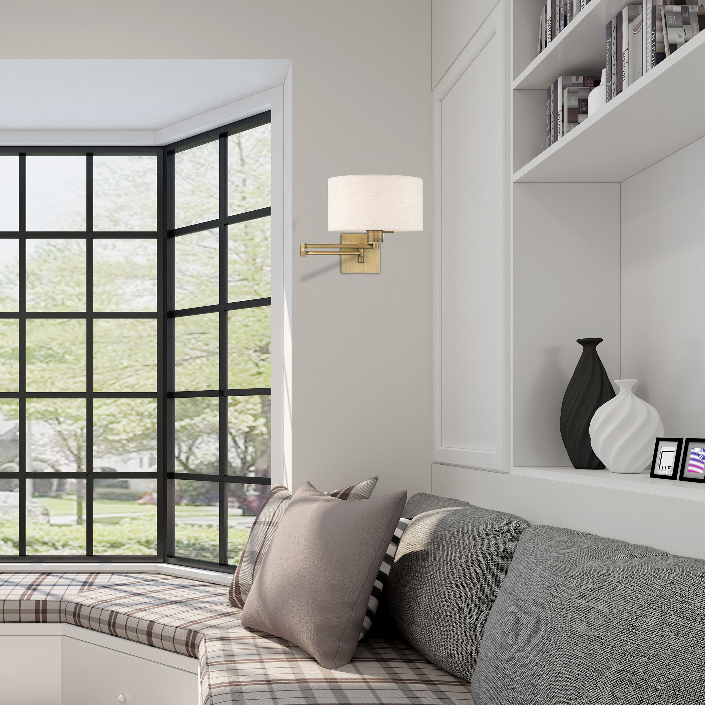 Add this versatile swing arm wall lamp bedside or above a favorite reading chair to enjoy more light where you need it. The antique brass finish is transitional while the oatmeal fabric shade offers subtle texture.