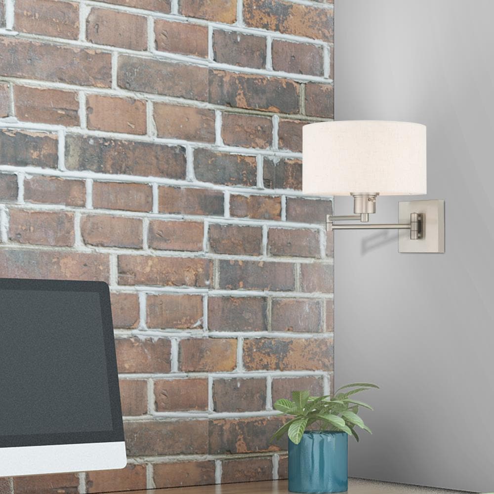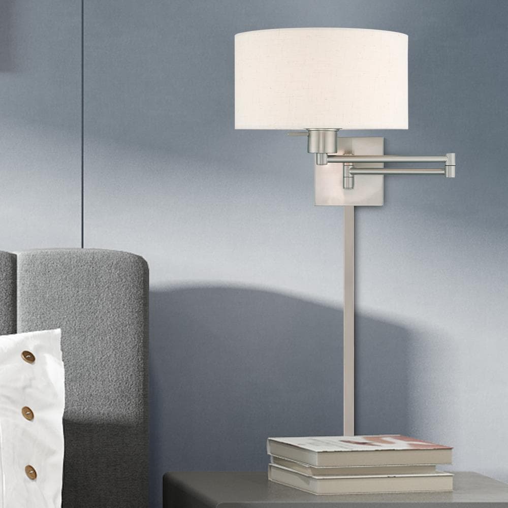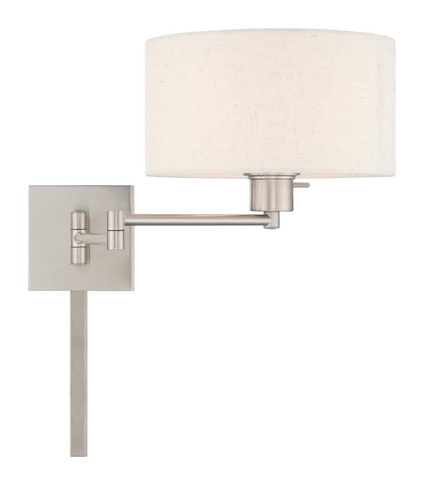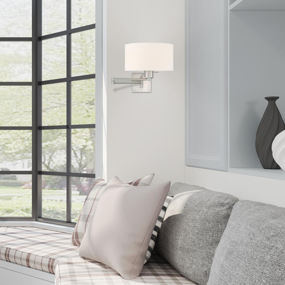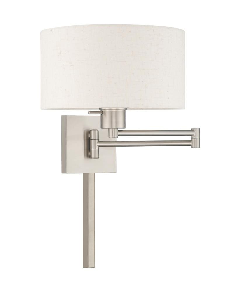 Add this versatile swing arm wall lamp bedside or above a favorite reading chair to enjoy more light where you need it. The brushed nickel finish is transitional while the oatmeal fabric shade offers subtle texture.
