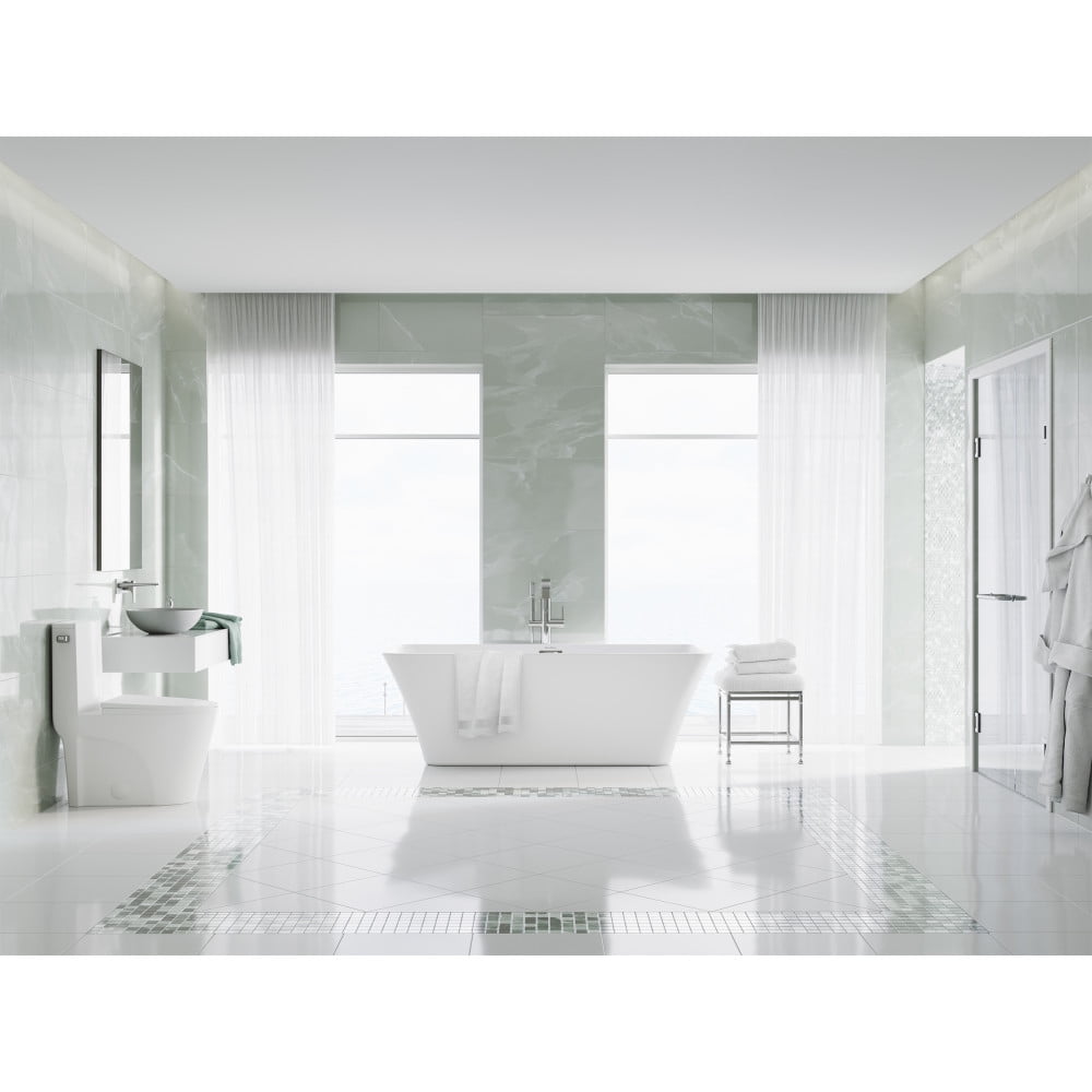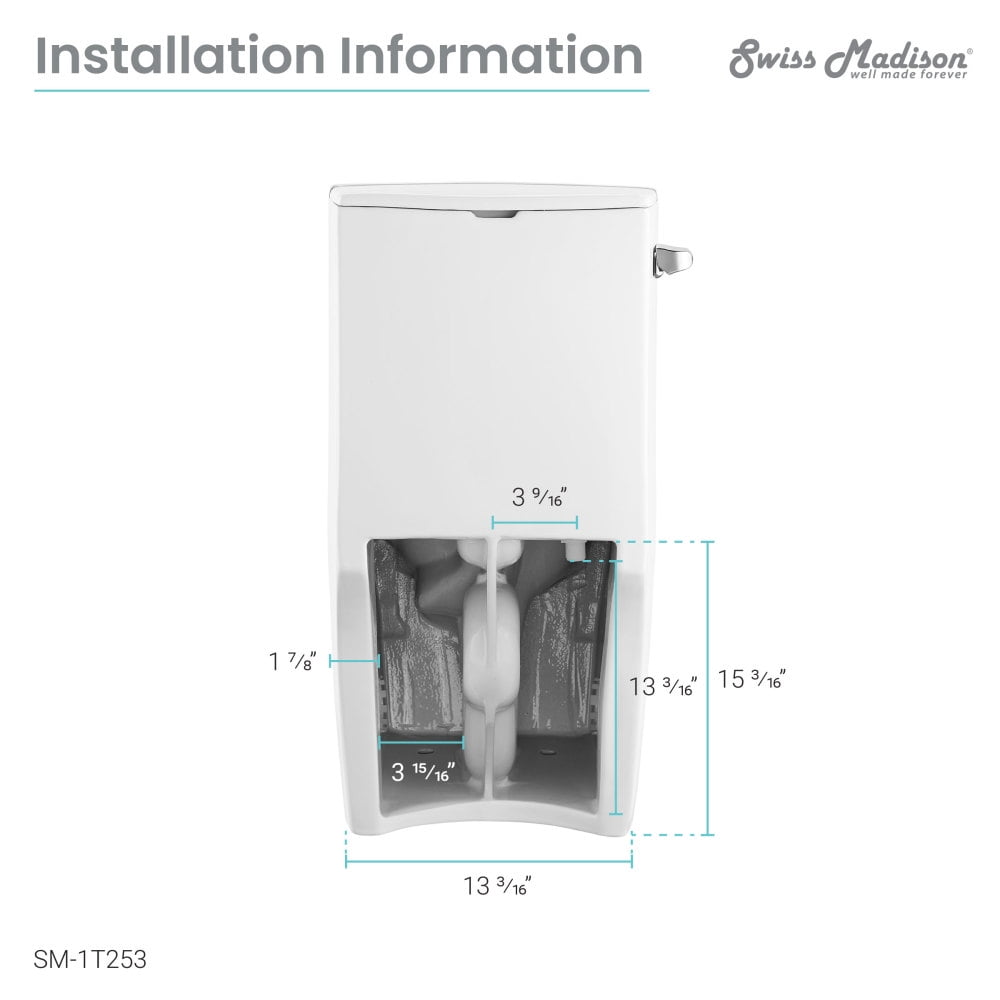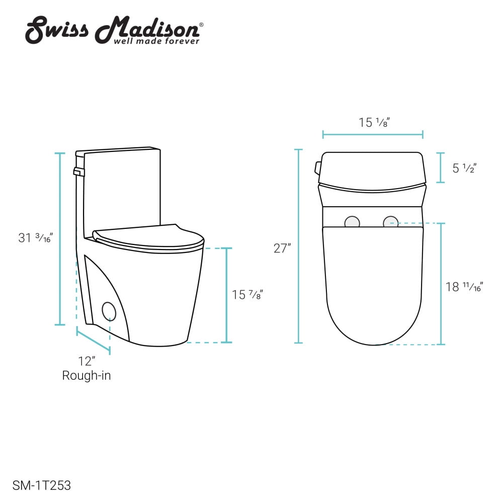 Swiss Madison St. Tropez White Ceramic Elongated 12in, 1.28 GPF Toilet Experience the perfect blend of style and functionality with this one-piece toilet from the St. Tropez collection Evokes the breezy allure of Mediterranean living with a standard elongated bowl for added comfort Sleek, glossy white finish enhances any bathroom decor for a modern touch Durable, scratch-resistant ceramic construction ensures long-lasting use and reliability Fully glazed and skirted trapway provides a smooth, easy-to-clean surface for effortless maintenance