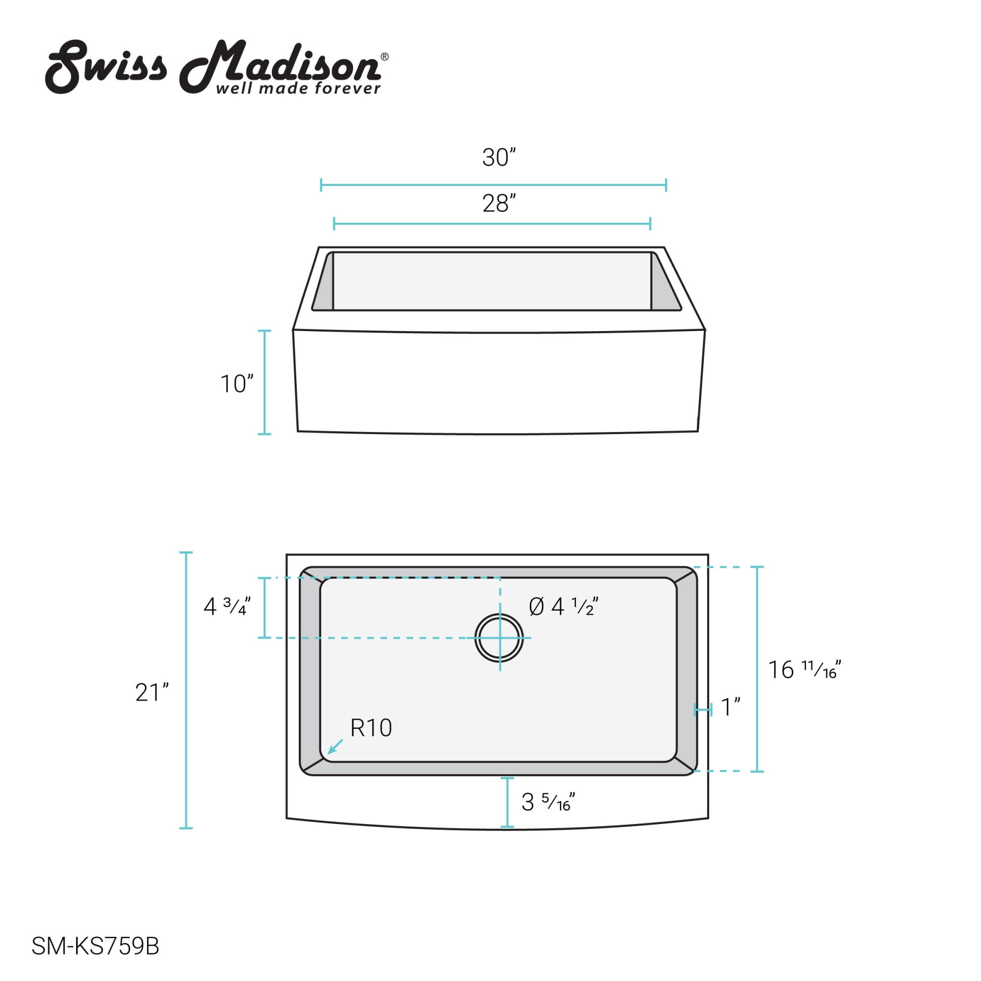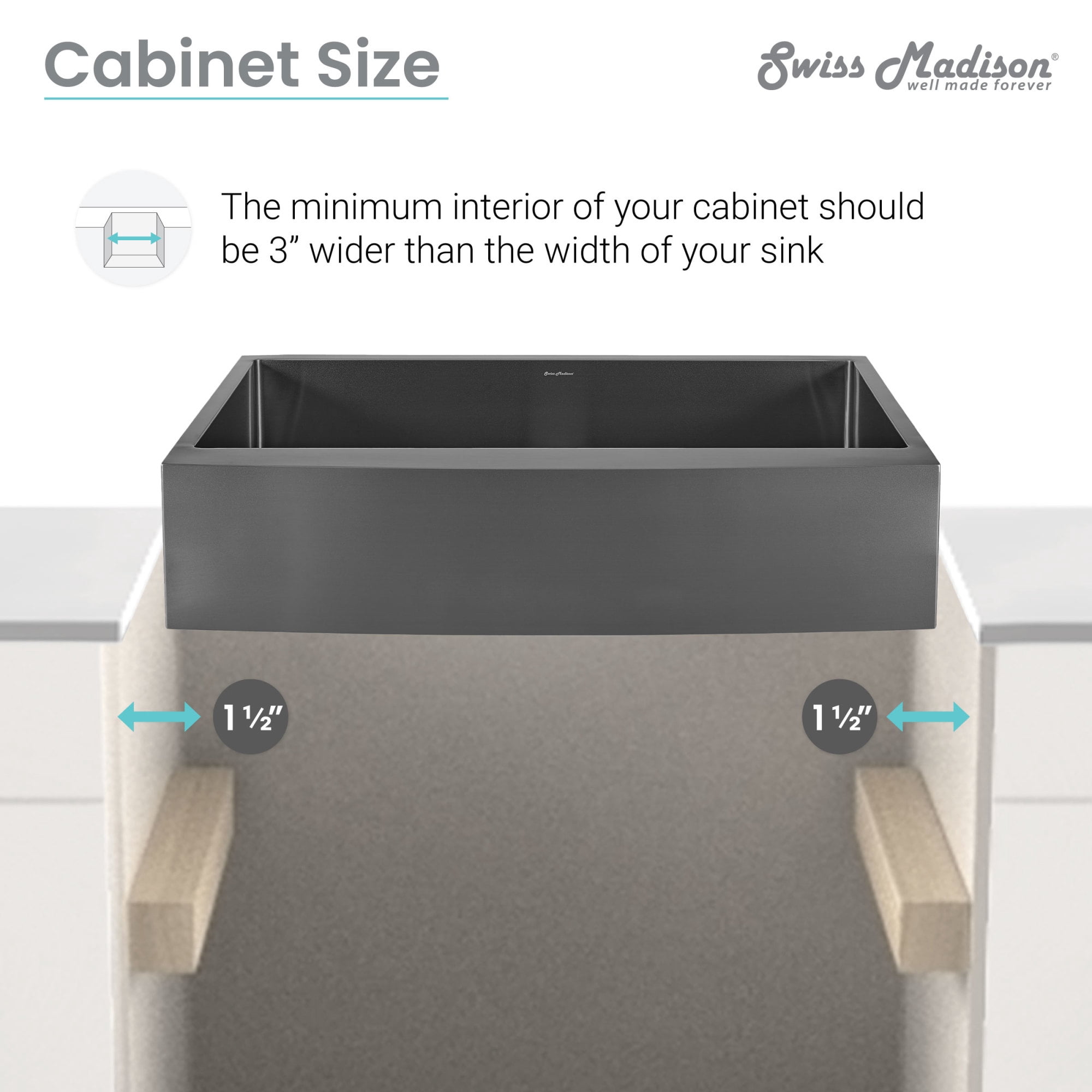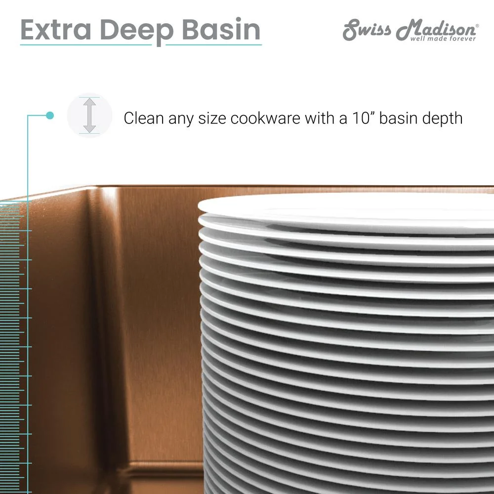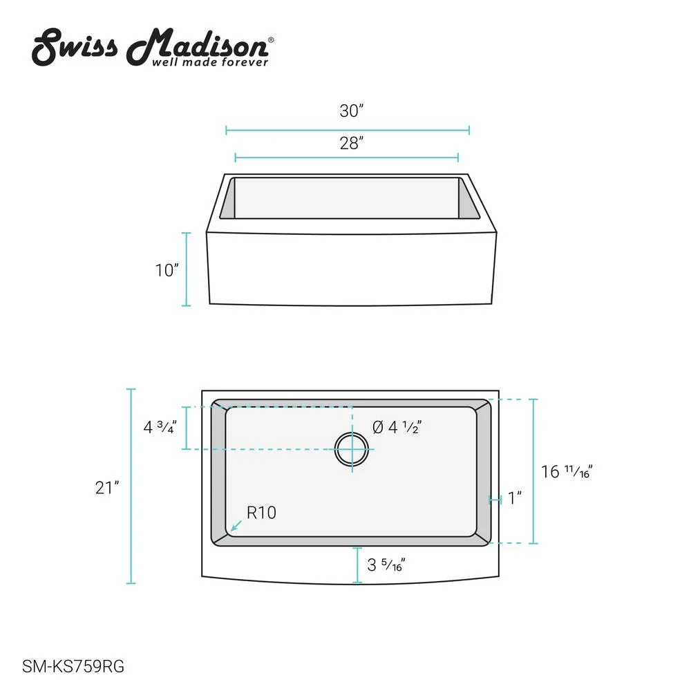 Apron Installation: The apron overlaps the cabinet front to fit seamlessly beneath the countertop. Material: Durable and long-lasting 18 gauge Stainless Steel. Drain Location: Rear Center Basin Depth: 10 Inches R10 Corner Radius: Slightly rounded corners for ease of cleaning and a sleek modern look. Sound Absorbing Pads: Equipped with sound-dampening pads to minimize sink noise and vibration. Sloped Drainage: The slightly sloped sink basin allows water to drain easier. Cabinet Size: The minimum interior of your cabinet should be 3″ wider than the width of your sink. Inlcuded: Cutout template. Sold Seperately: Sink drain is not included. Dimensions: 33.5″W X 23.5″D X 13″H One Year Limited Warranty