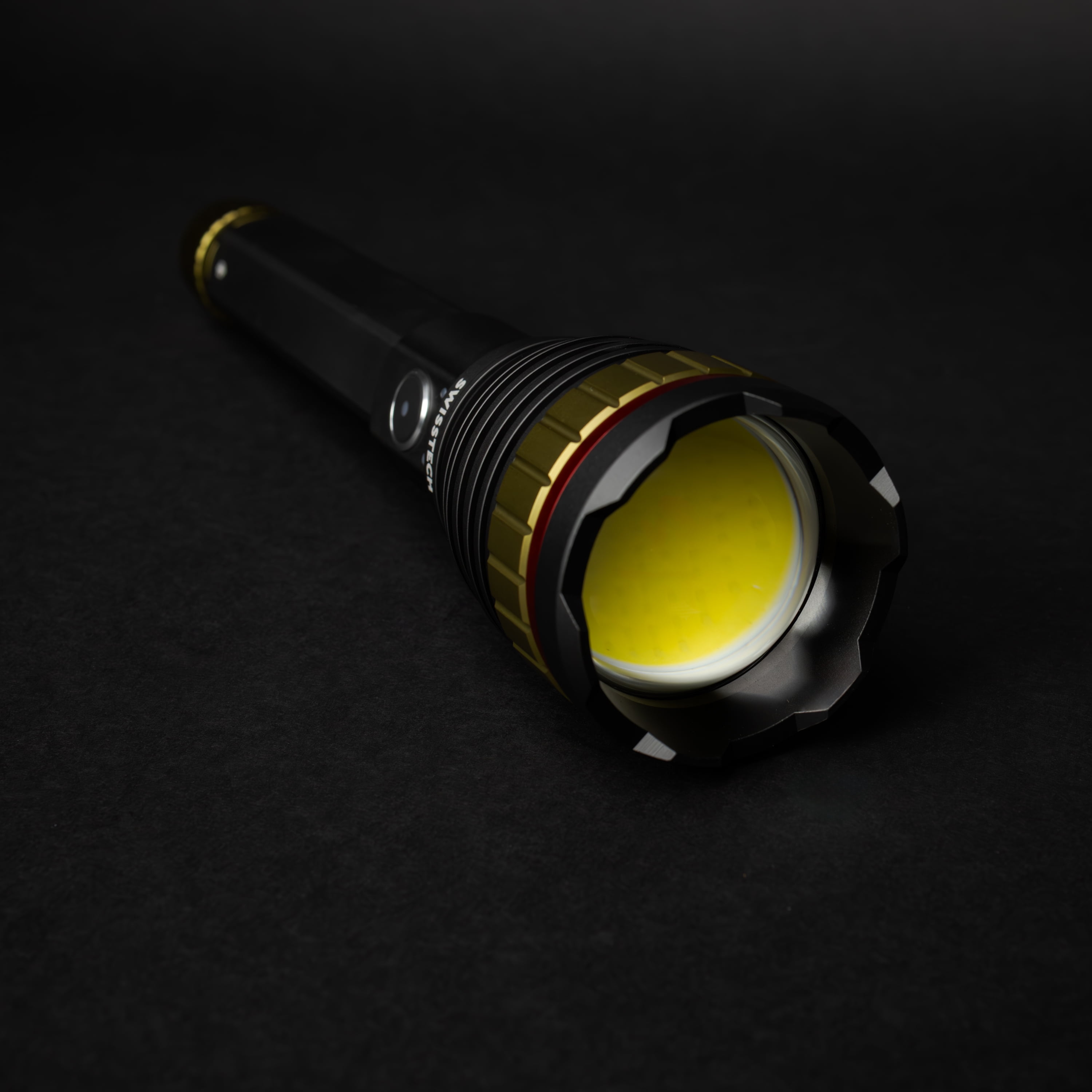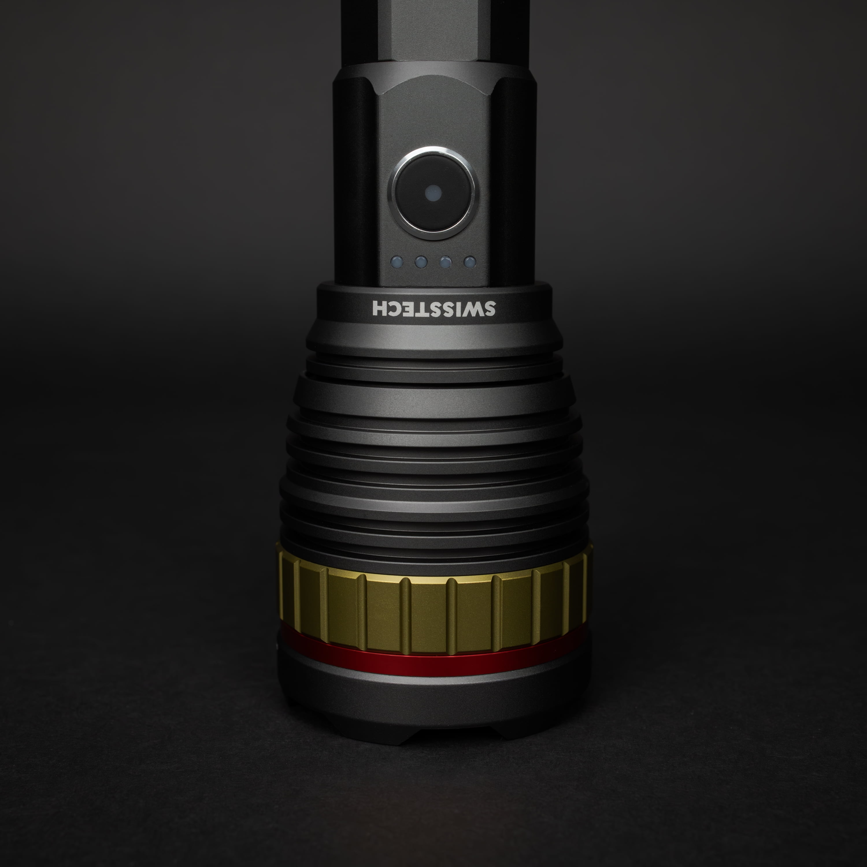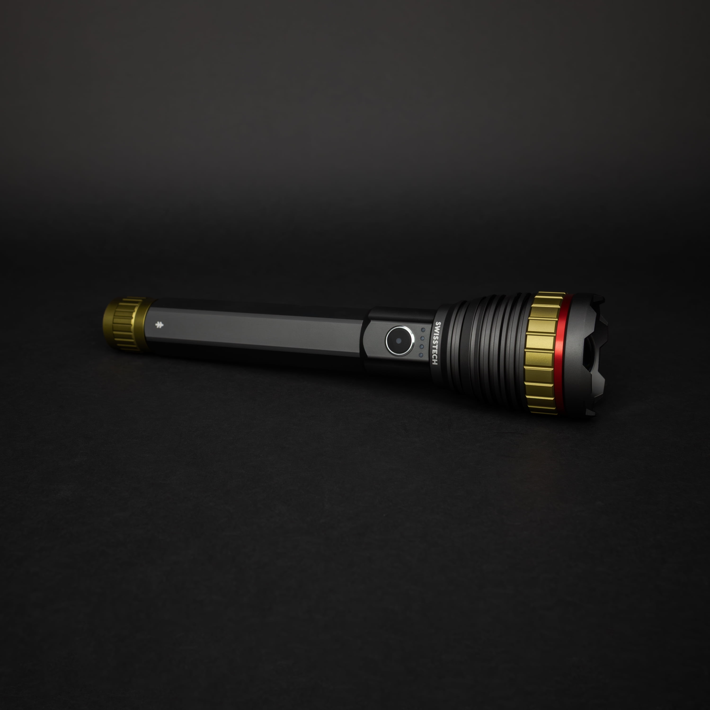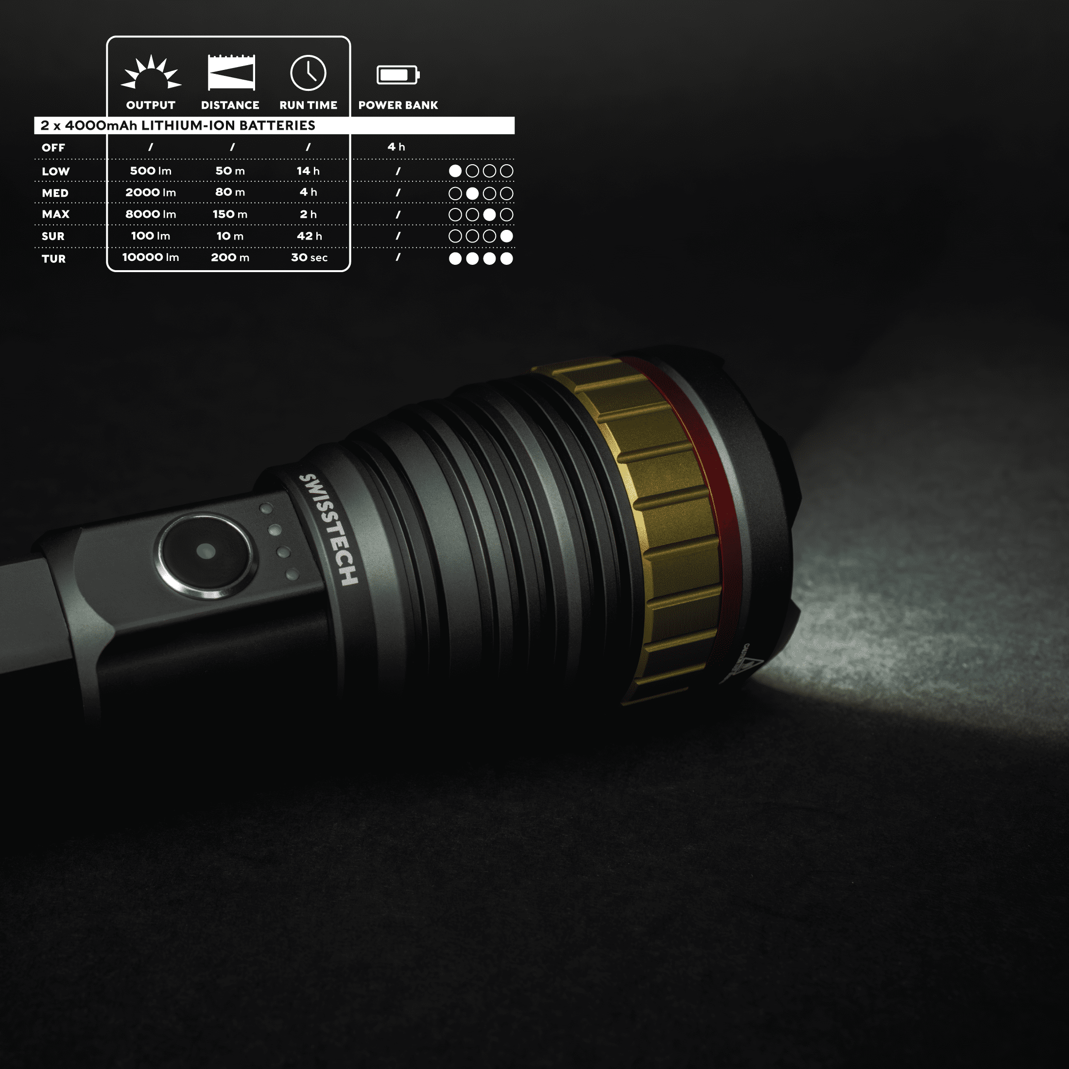 Swiss Tech 10,000 Lumen LED Flashlight, Rechargeable, Waterproof, Power Bank for Emergency Use, Camping Durable, high-grade aluminum body 2 x Rechargeable 4000mAh lithium-ion batteries integrated into the body 6 Modes: low, medium, high, survival, turbo and strobe 10,000LM at turbo mode 200M beam on turbo mode 42-Hour run time on survival mode IP67 dust & waterproof Mode indicators above button Fade transition between modes Double press for strobe mode Press & hold for turbo mode Press to power off after 5 sec stay on any mode Power bank for emergency USB-C charging cord included Battery indicator on button