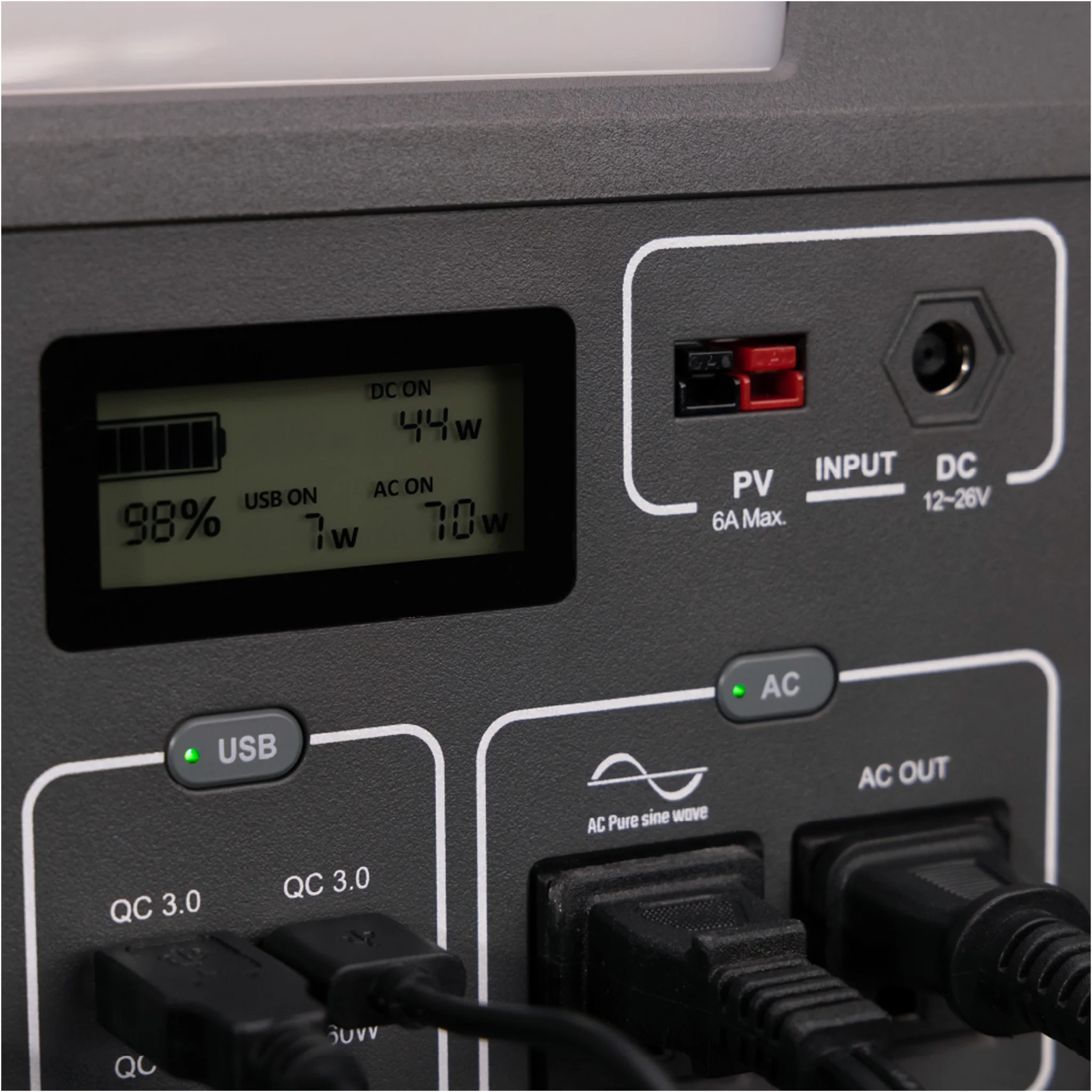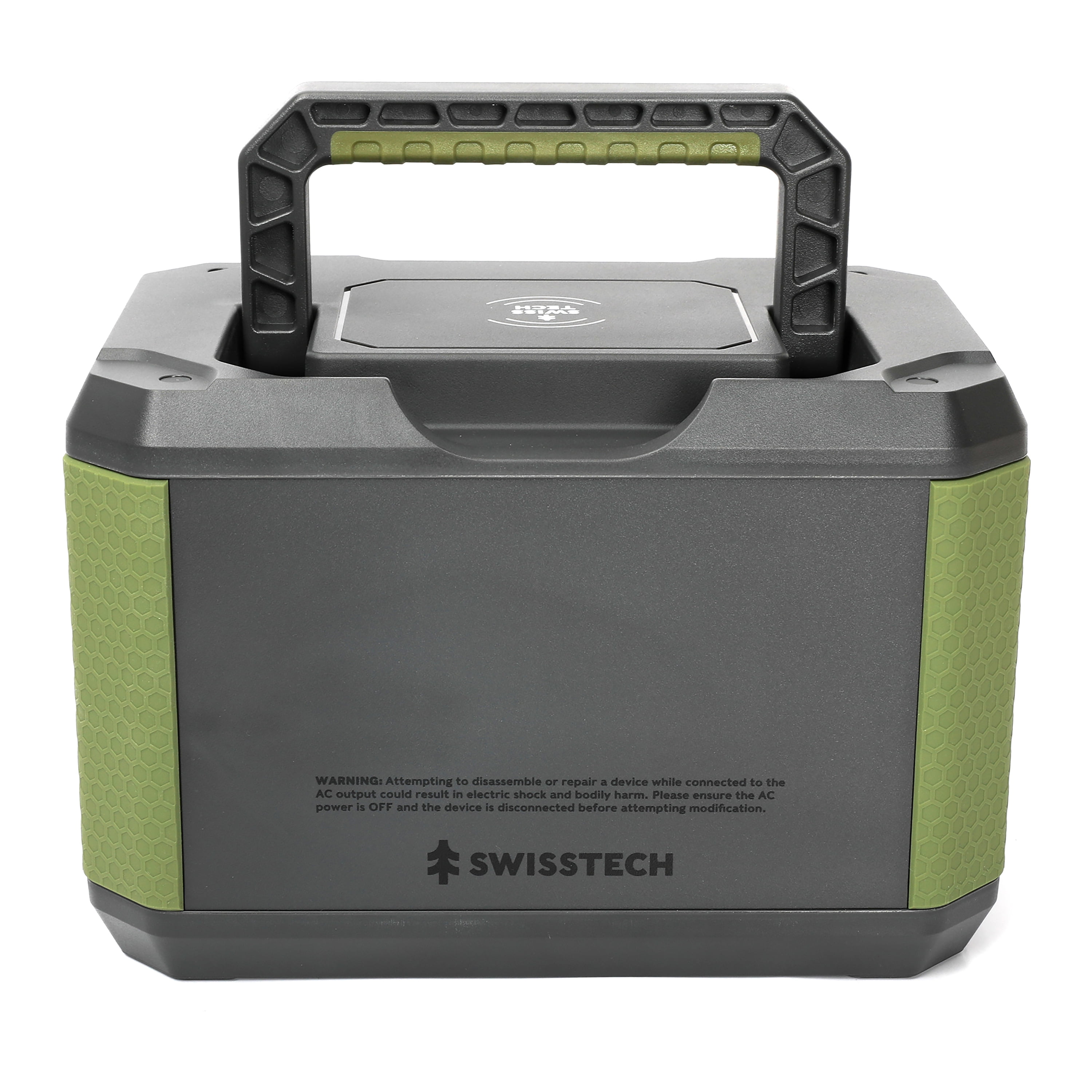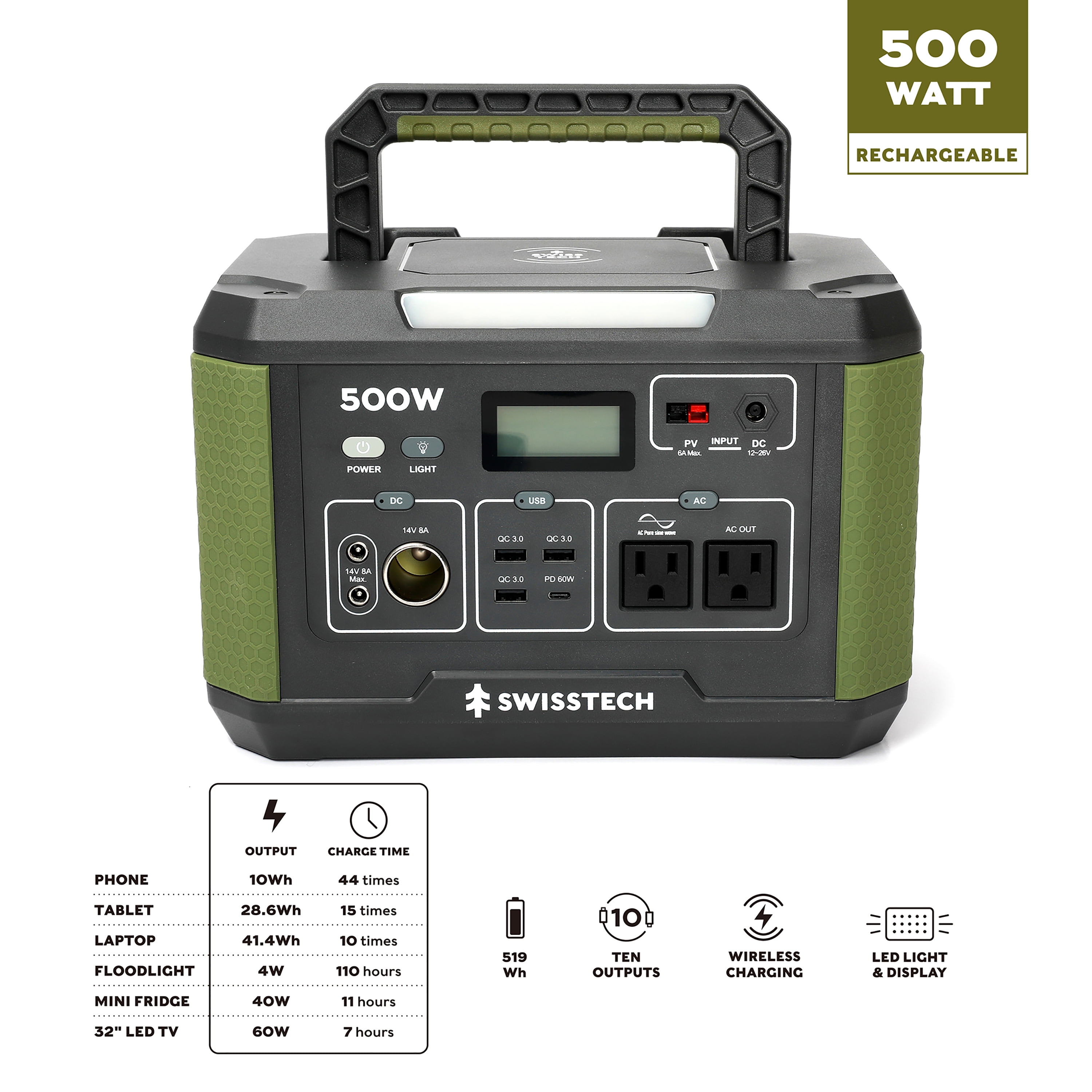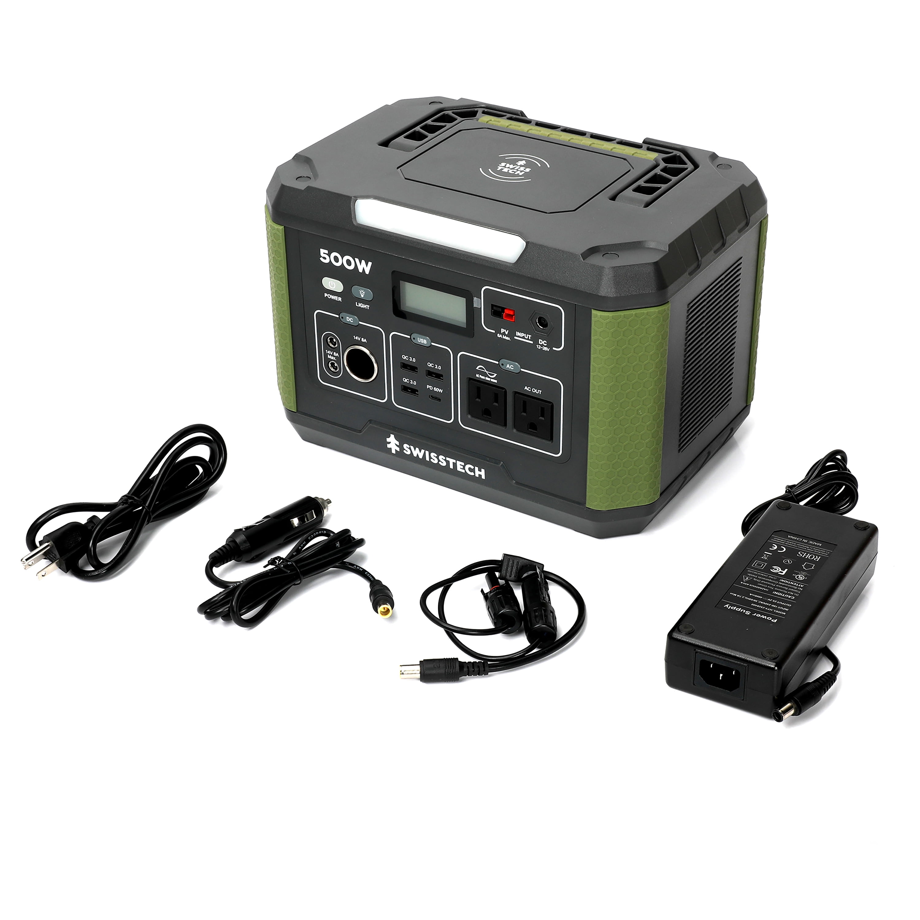 Swiss Tech 500W Power Station, 519.4Wh Capacity, Solar Compatible, Portable Battery, Outdoor and Emergency Use, Green LED light on body LED display indicates actual capacity and working port Converts easily to solar generator with Swiss Tech Solar Panel Capacity: 519.4Wh Battery, 18650 Lithium-Ion Weight: 15 lbs Charging Method: DC, 12V, or Solar Package Dimensions: 11.5 x 8.0 x 7.6 inches DC Input: 12-26V Car Port: 14V⎓8A 100W Adaptor with other necessary cables included 1 x Wireless output: 10W 2 x DC output: 14V/8A 1 x DC55*2.1 Cigarette lighter output: 14V/8A 3 x USB-A: Quick Charge 3.0/ 18W 1 x USB-C Output: PD 60W max 2 x AC output: (2 prongs & 3 prongs)