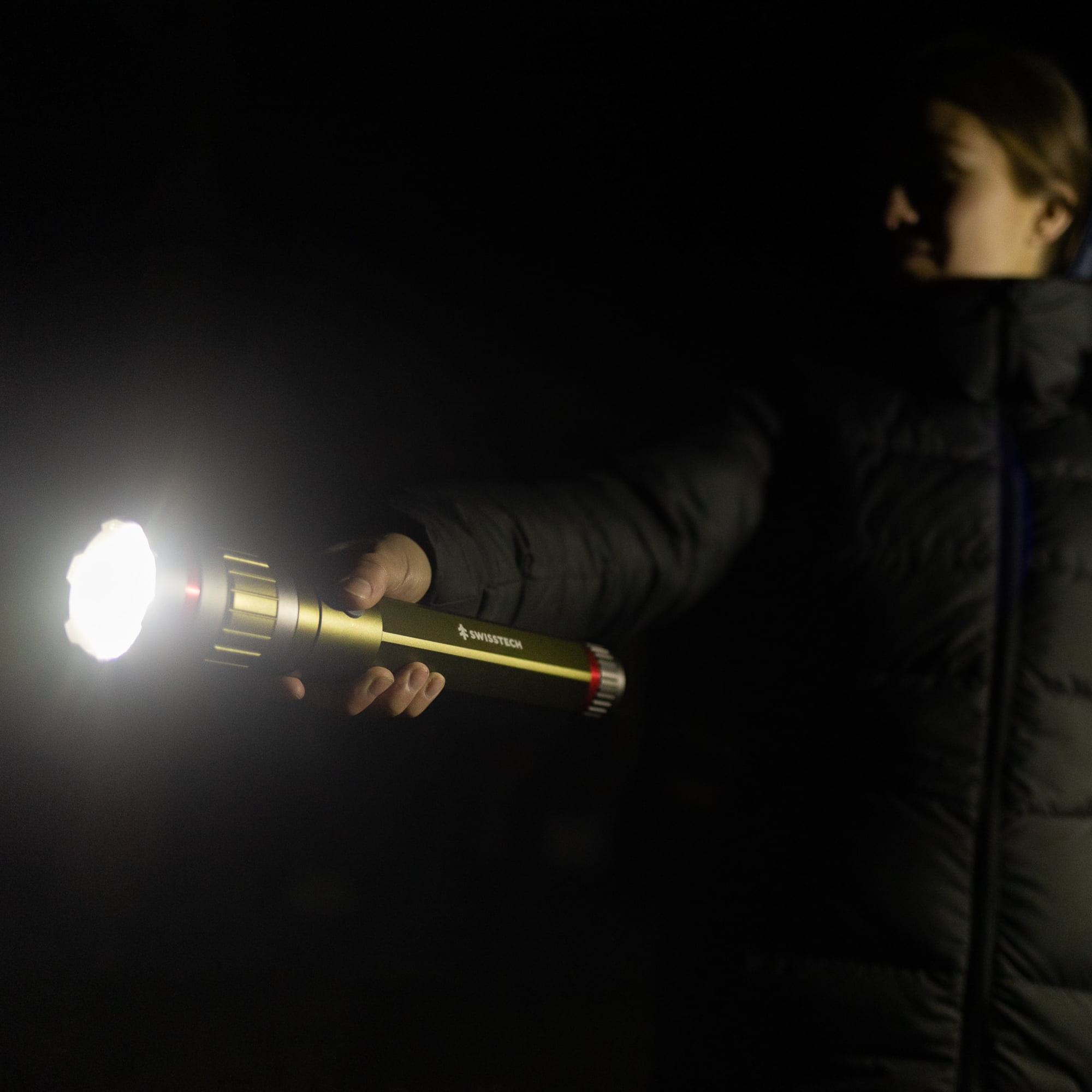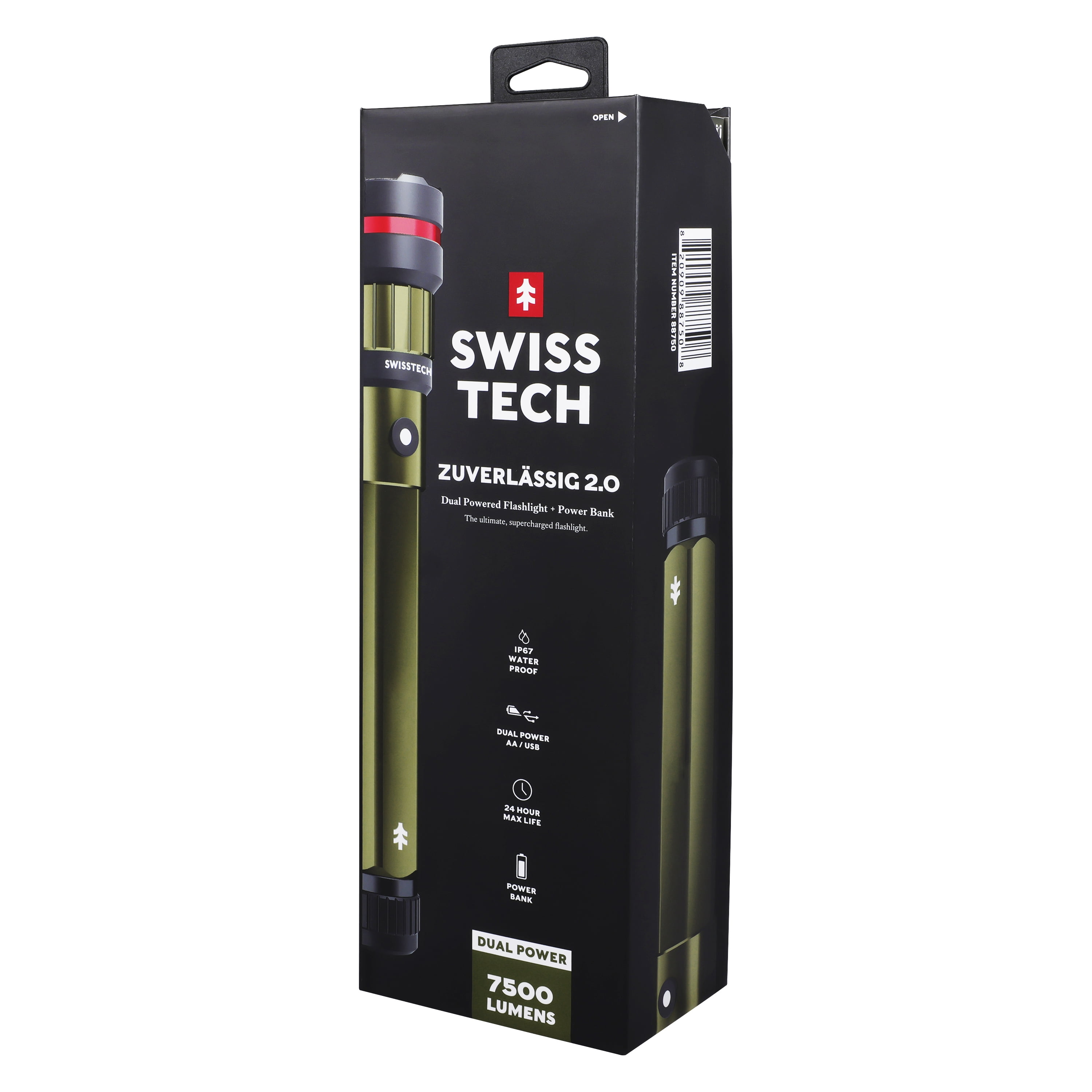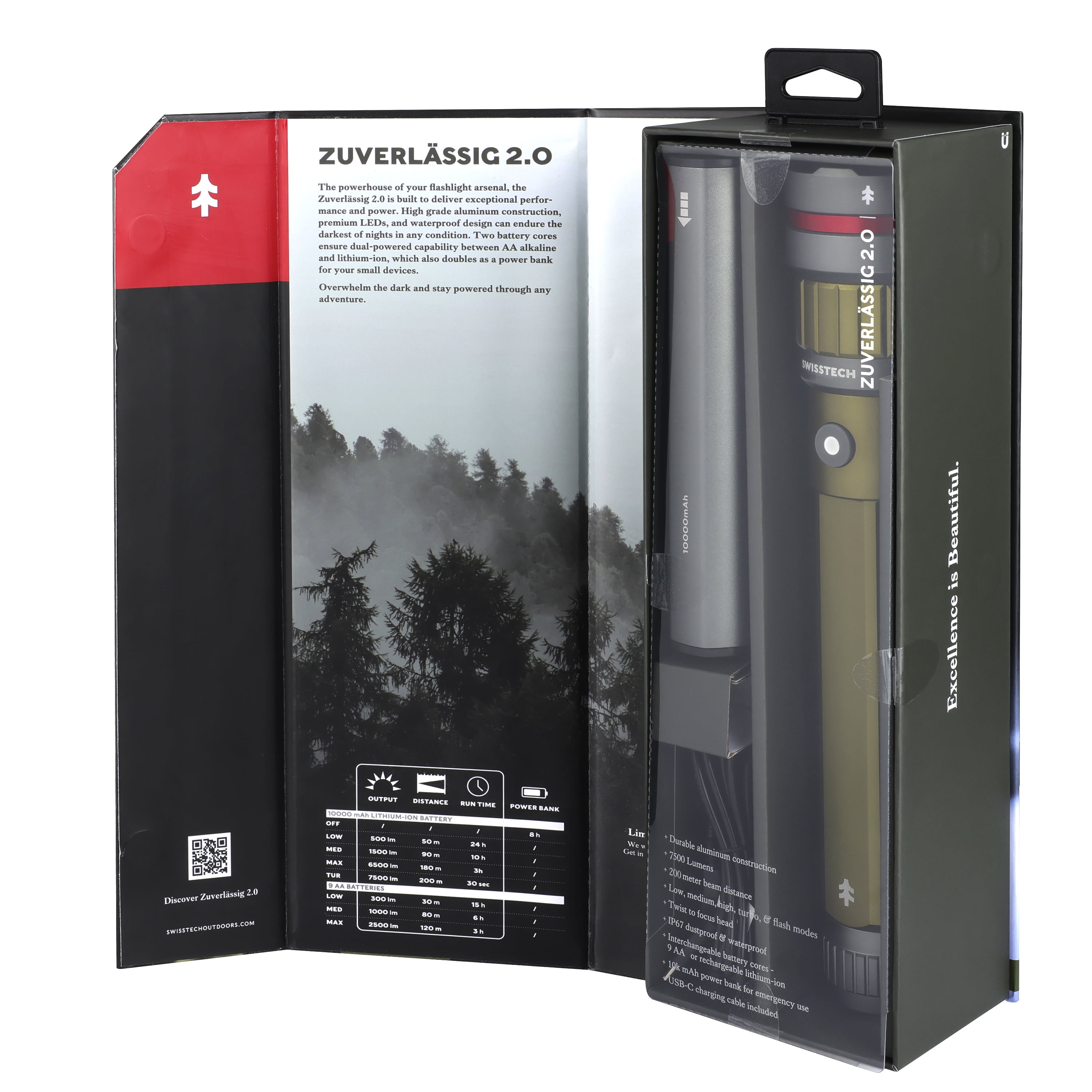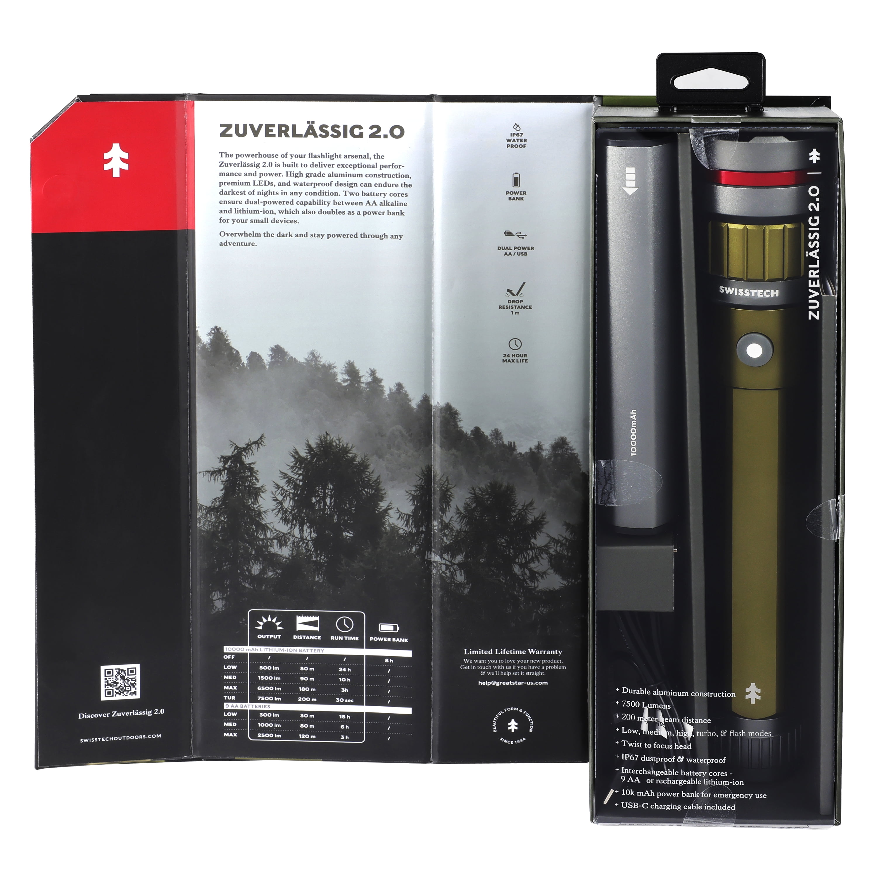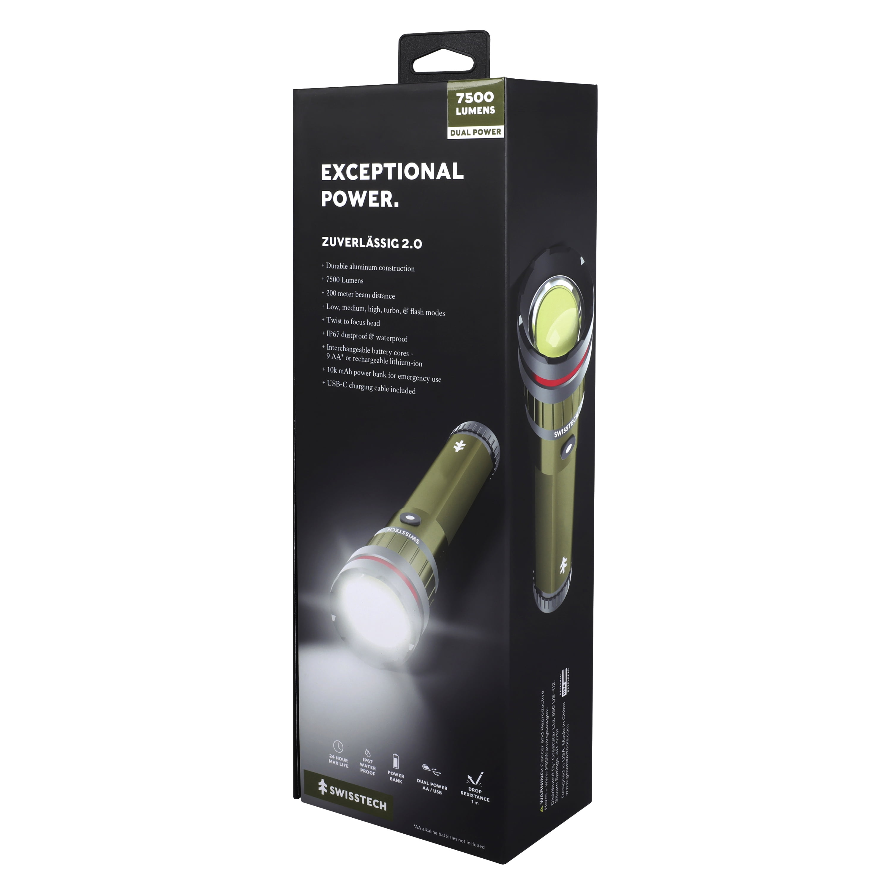 Overwhelm the dark and stay powered through any adventure with the Swiss Tech 7500 Lumen Dual Power Rechargeable LED Flashlight with Charging Bank. This powerhouse of a flashlight is built to deliver a massive 7500 lumens plus a power bank, making it a must-have in your lighting and charging arsenal. Rated an extraordinary dustproof & waterproof IP67, this Swiss Tech Flashlight will always be there for you, whether you’re hitting the trails for a fun adventure or needing light during an emergency. Dual power capability also means that you can use the USB-C charging cable or AA batteries in this flashlight with its interchangeable cores. Maximize your light output and battery life depending on your situation with High, Medium, and Low settings. The Swiss Tech Zuverlassig is built to overpower any challenge thrown its way.