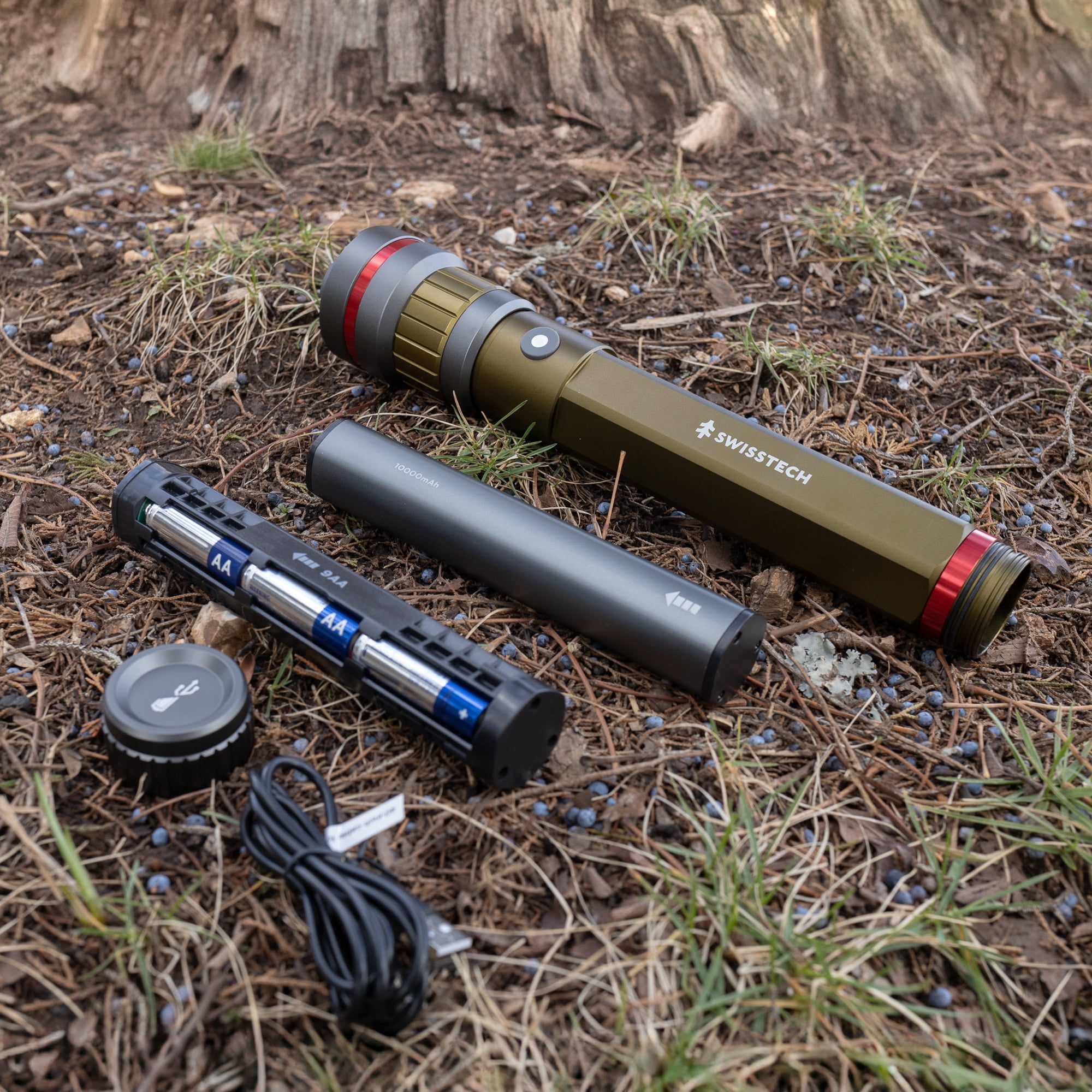 Swiss Tech 7500 Lumen LED Flashlight Rechargeable Dual Power AA/USB, Charging Bank, IP67 Waterproof