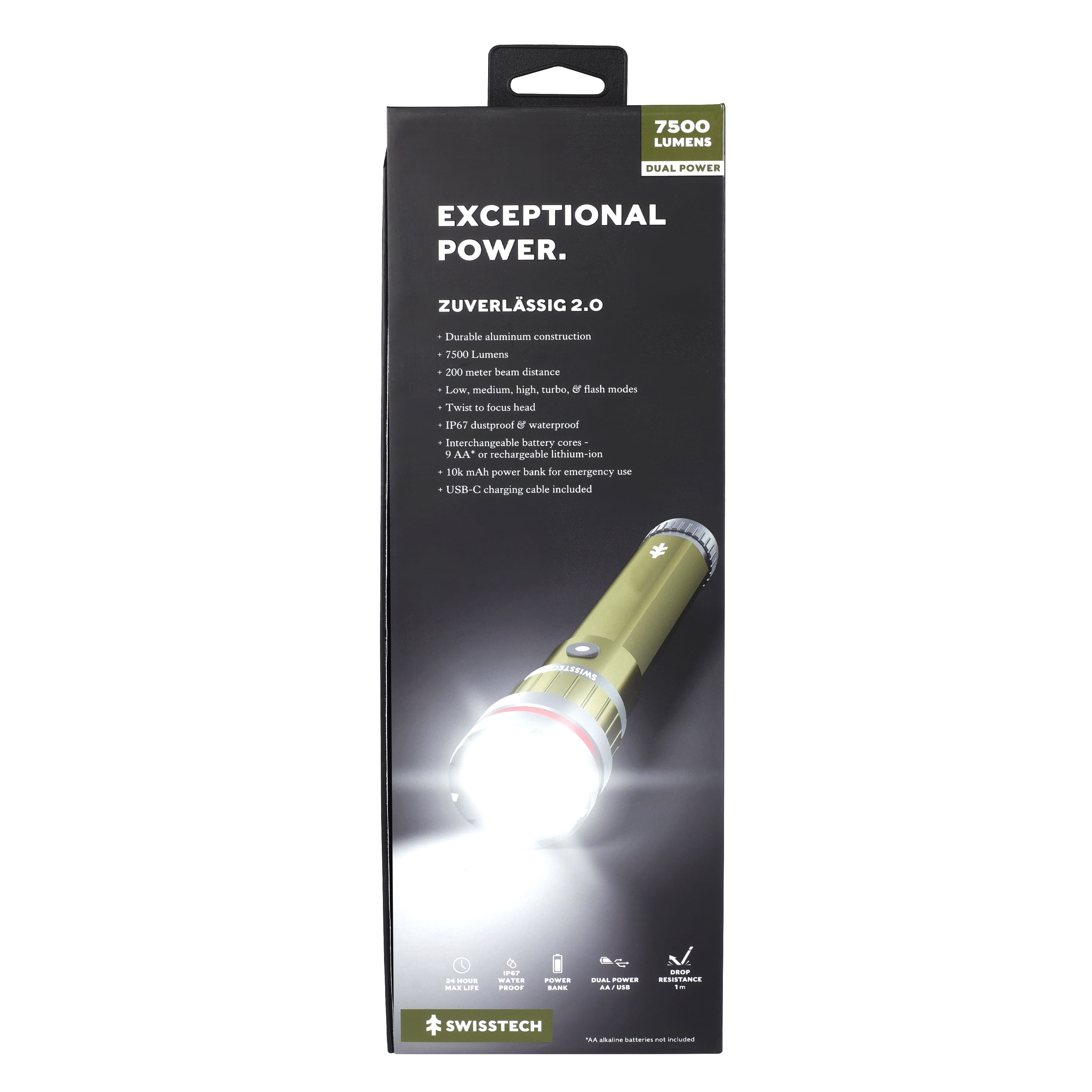 Swiss Tech 7500 Lumen LED Flashlight Rechargeable Dual Power AA/USB, Charging Bank, IP67 Waterproof Durable aluminum construction Waterproof: IP67 Dual power (USB or AA batteries) 4 Modes: High, medium, low and flash 7500-Lumens 3-hour run time on high-setting 200-meter beam distance Battery high setting: 2500LM/5H/120M 40-inch USB-type C charging cable included 9AA alkaline batteries requested (not included) 24 hour max life