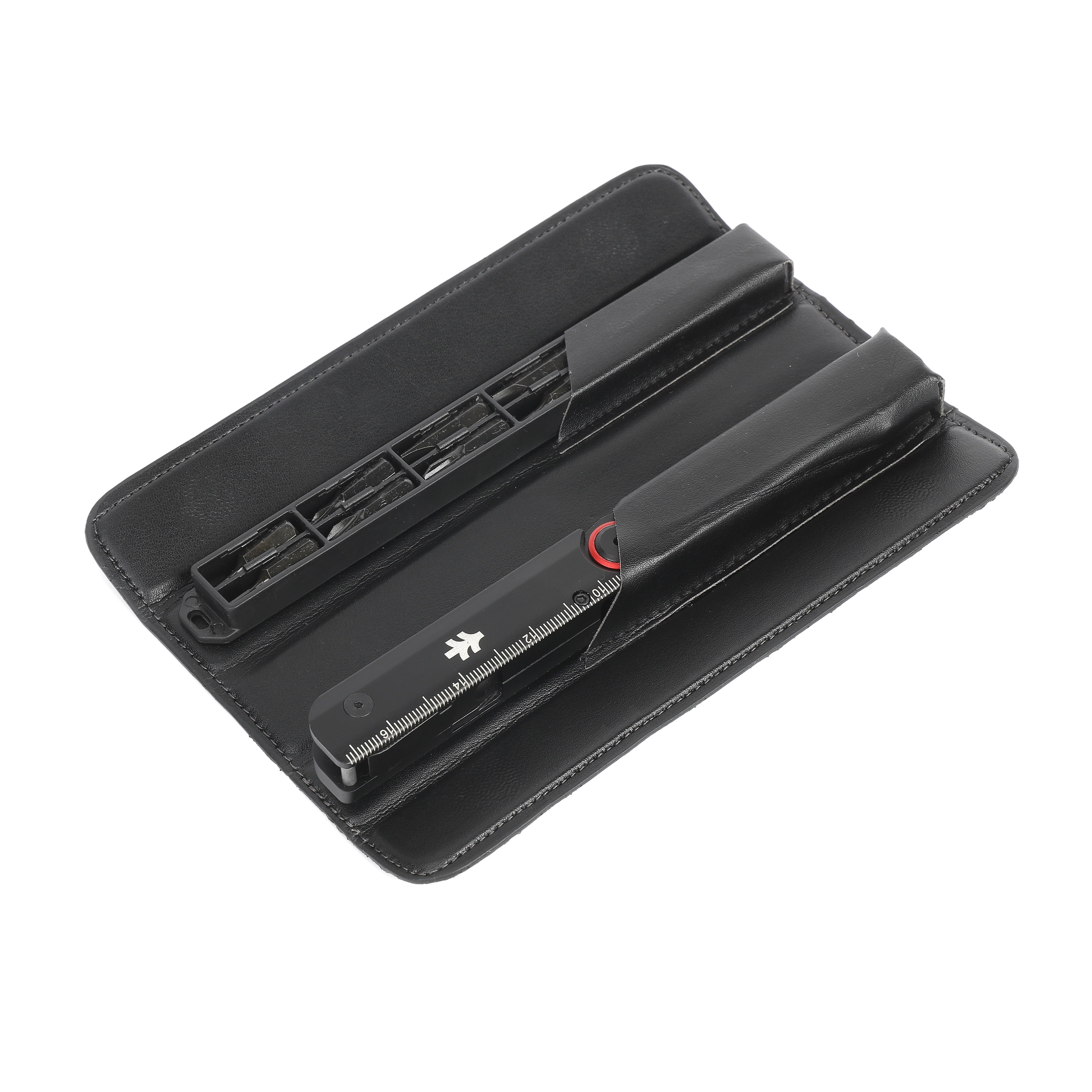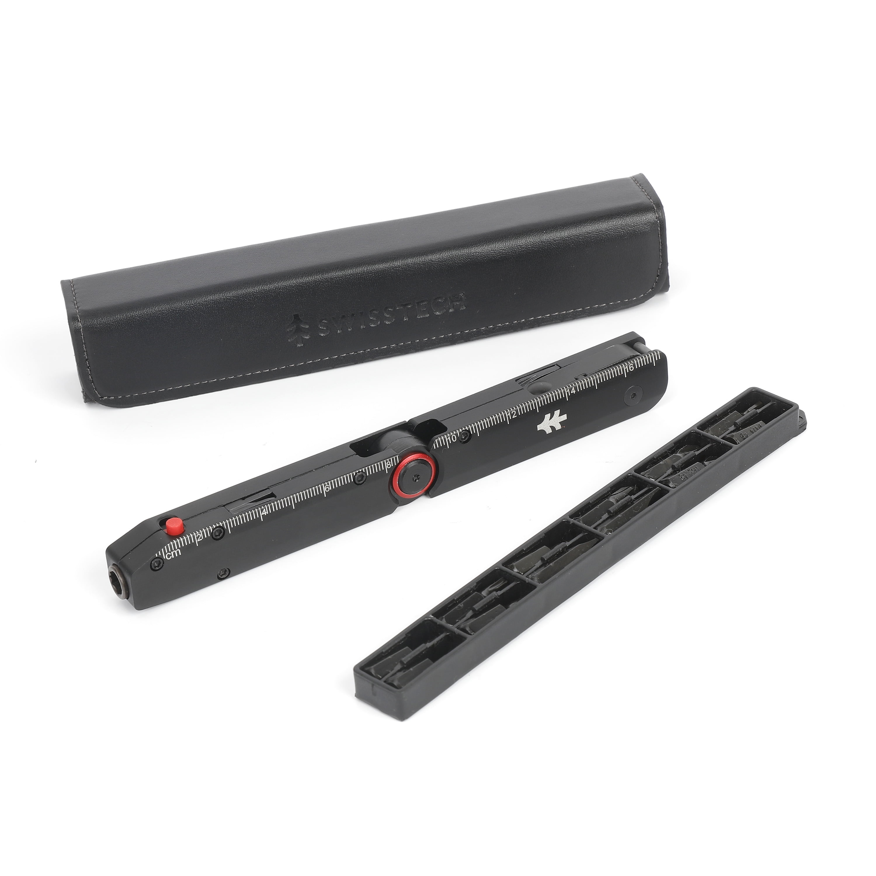 The Swiss Tech Taktstock Stainless Steel 26-in-1 Multi-Tool with Leather Sheath in black, a versatile and durable multi-tool in a slim, compact design. It features a sharp, AUS-8 steel knife for everyday use. The handle includes a 6” ruler for quick measurements. The multi-tool offers reliable can and bottle openers, small and medium flathead screwdrivers, a 12-piece single head and 1-piece double head bit set, long nose pliers, bolt grippers, 2 sided file, wire cutters, and a hard wire cutter. A premium magnetic leather sheath with tool and bit storage is included for convenient carrying. Compact and strong, the Taktstock Multi-Tool is perfect for any situation.