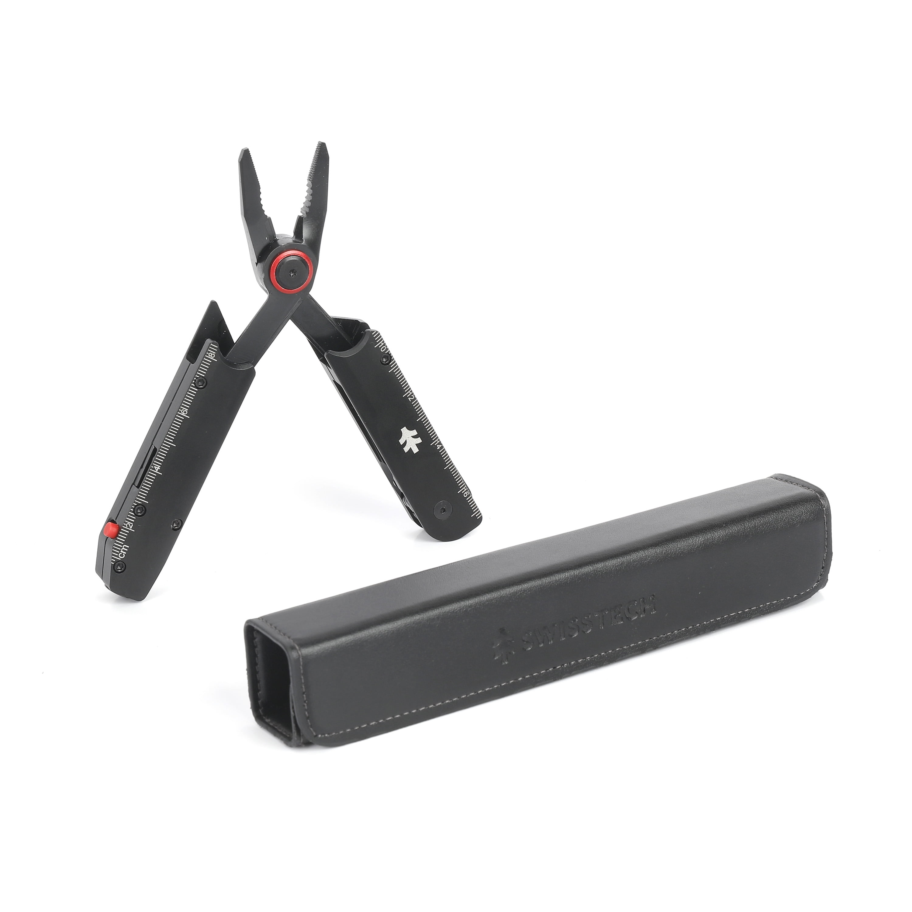Swiss Tech AUS-8 Steel Blade 26-in-1 Folding Multitool Ultimate versatility and function all in one slim, compact design 6” ruler integrated into the handle for quick measuring Can opening combined with precision on flathead or slotted screws with the small flathead screwdriver Includes a bottle opener and medium flathead screwdriver for effortlessly removing a bottle cap and using on slotted or flathead style screws Built-in 12-piece single head and 1-piece double head bit set, long nose pliers, bolt grippers, a wire cutter, and a hard wire cutter Premium leather sheath and clip are included to provide convenient carry while embarking on all your adventures Perfect for camping, hunting, hiking, everyday use, and holiday gift giving New