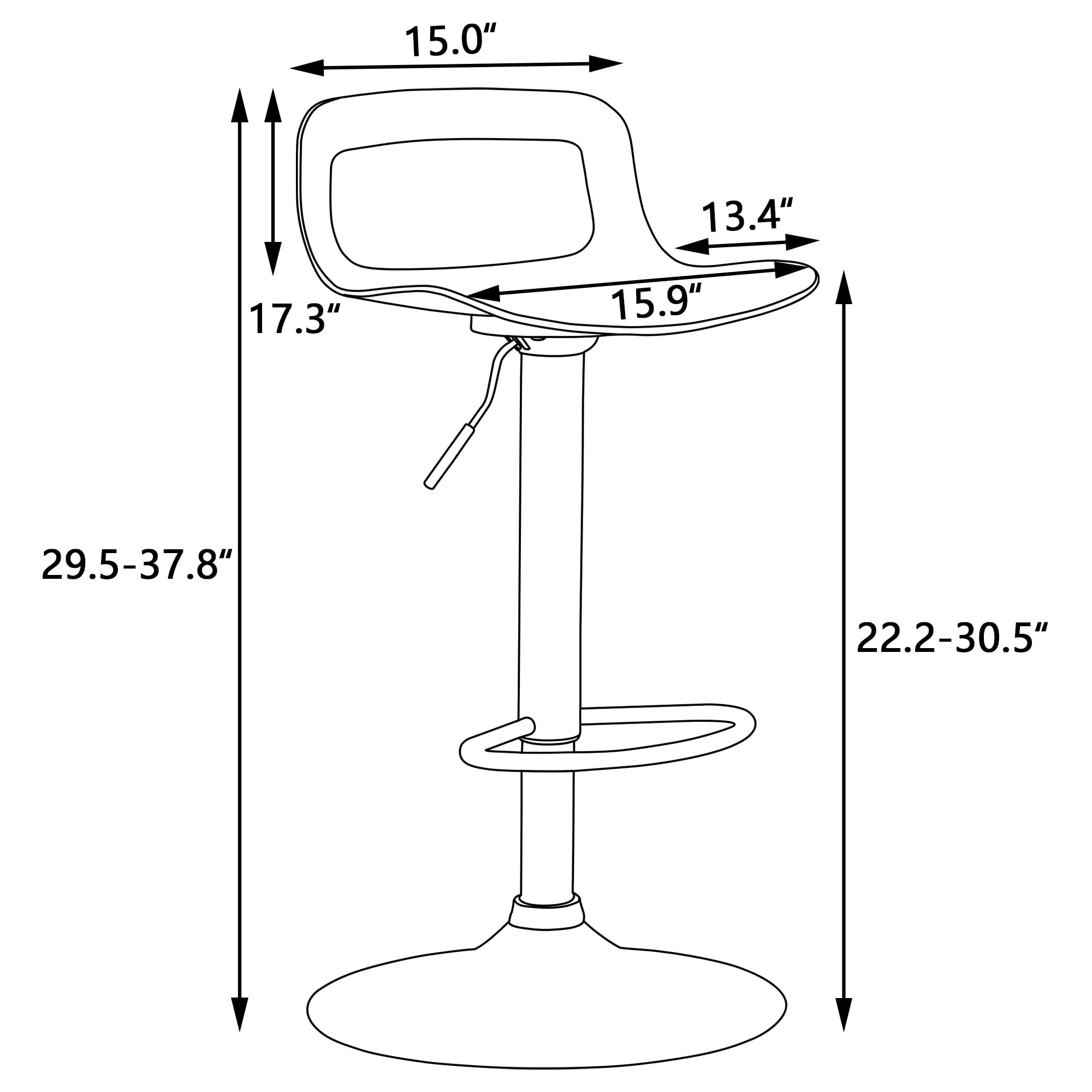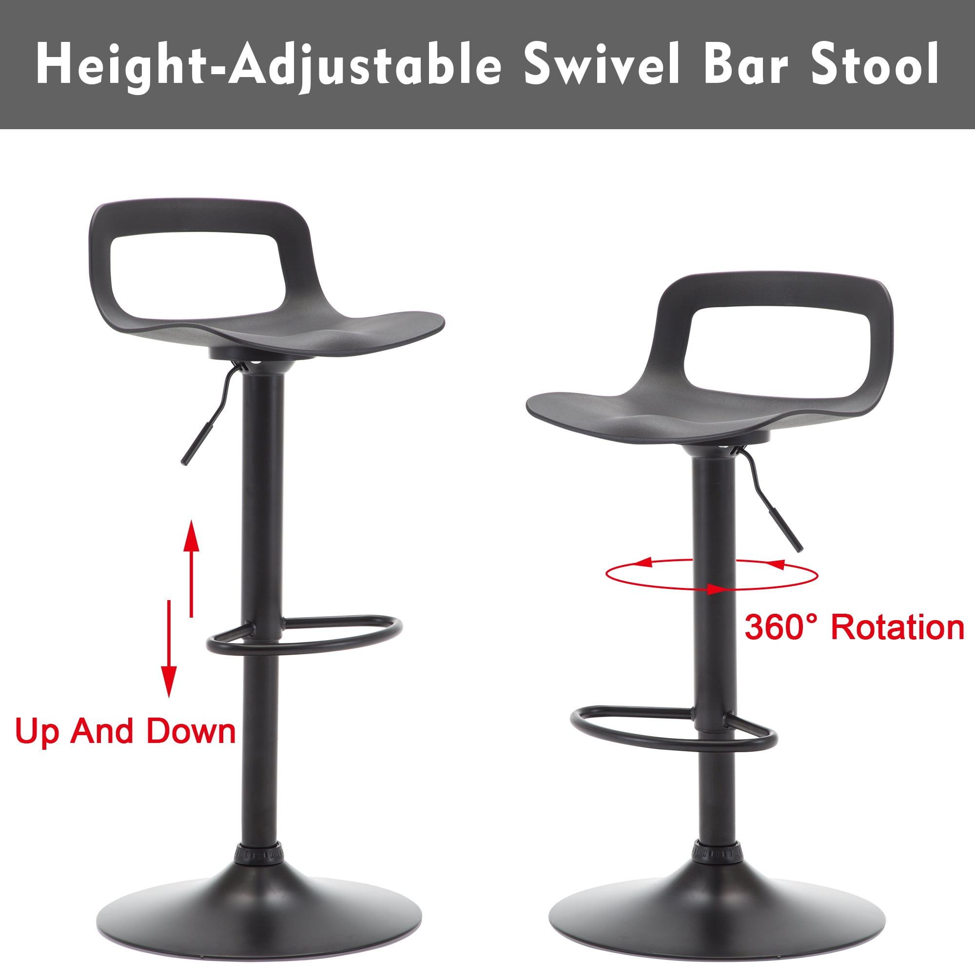 Set of 2 swivel bar stools Available in four colors black, white, gray, yellow Modern and stylish bar stool without armrest Bar stool with chrome base and built-in footrest Swivel and height adjustable bar chair Streamlined ergonomic design Sturdy PP plastic seat Height adjustable and 360° Rotation Stable powder coated/chrome base and built-in footrest Rubber ring under the base to protect the floor from scratching A sturdy construction, a beautifully upholstered seat cushion, and an eye-catching contemporary look Weight capacity of 260 pounds