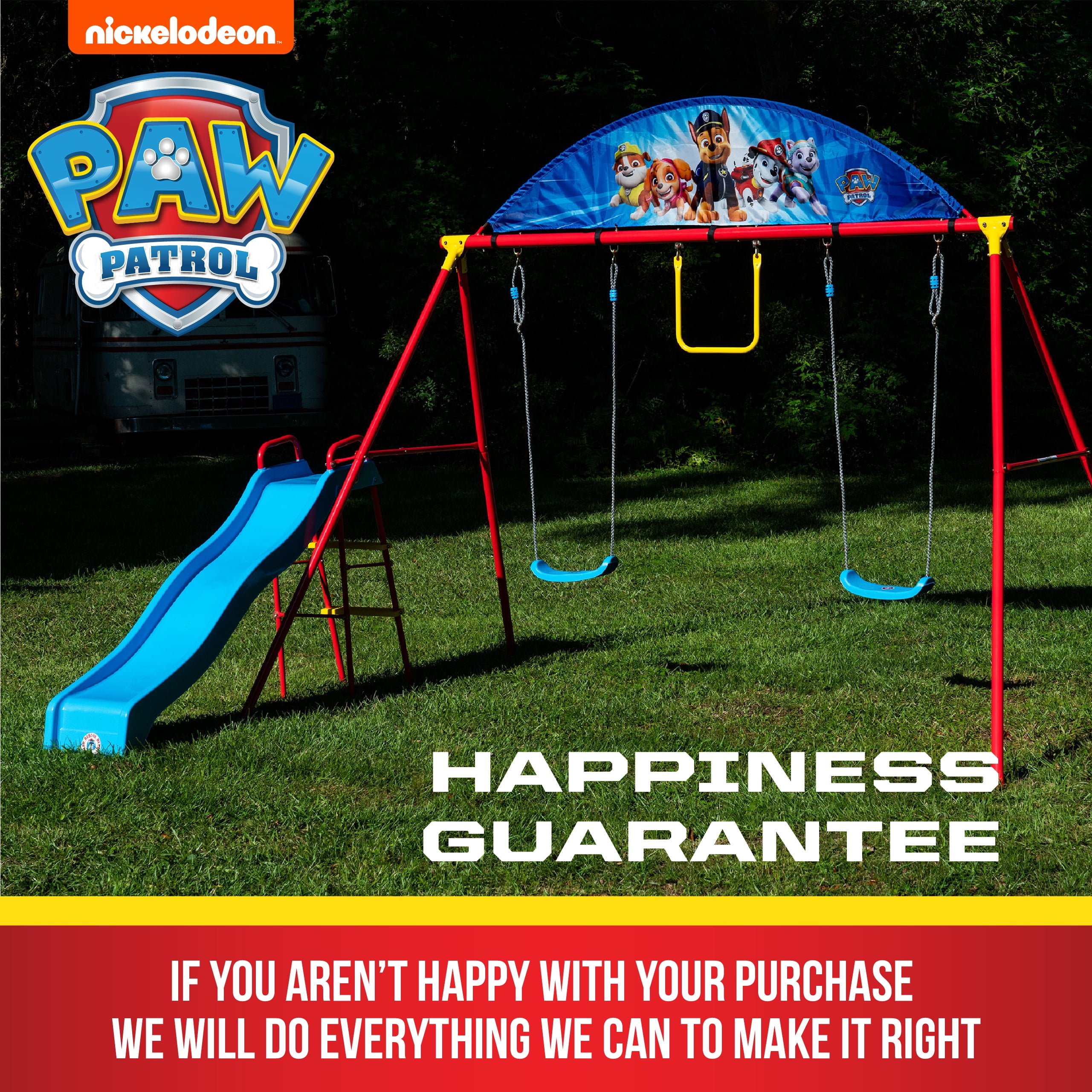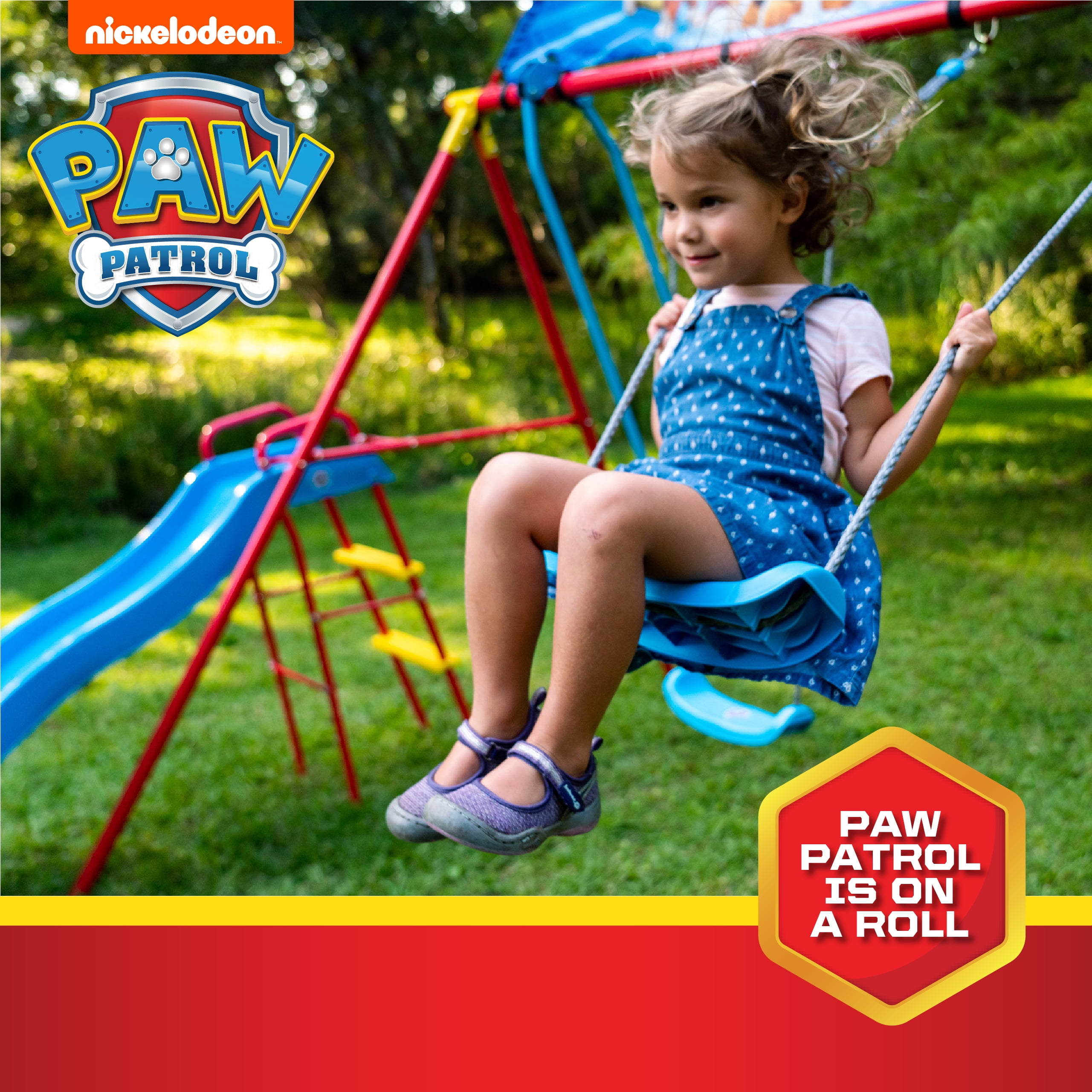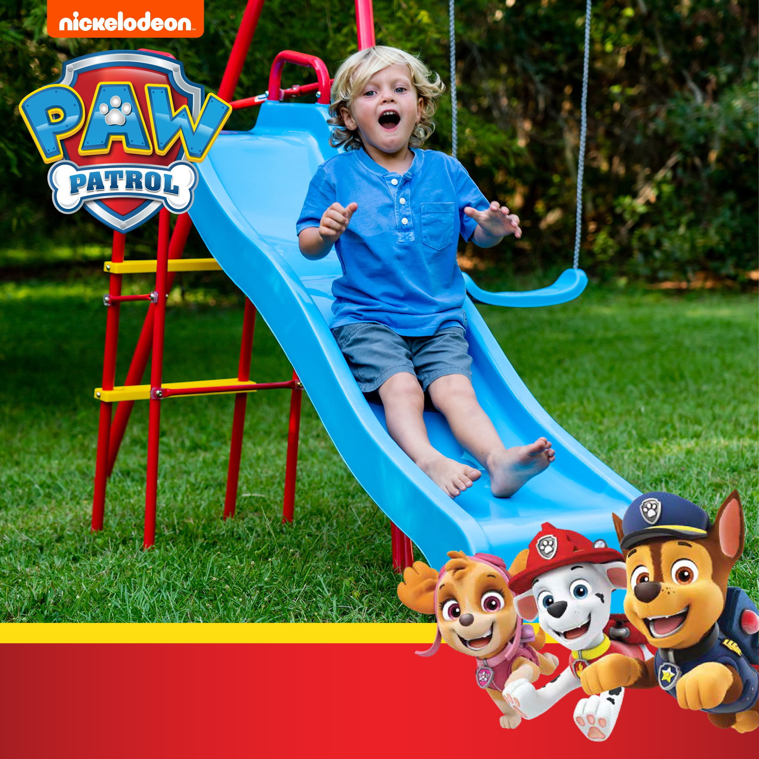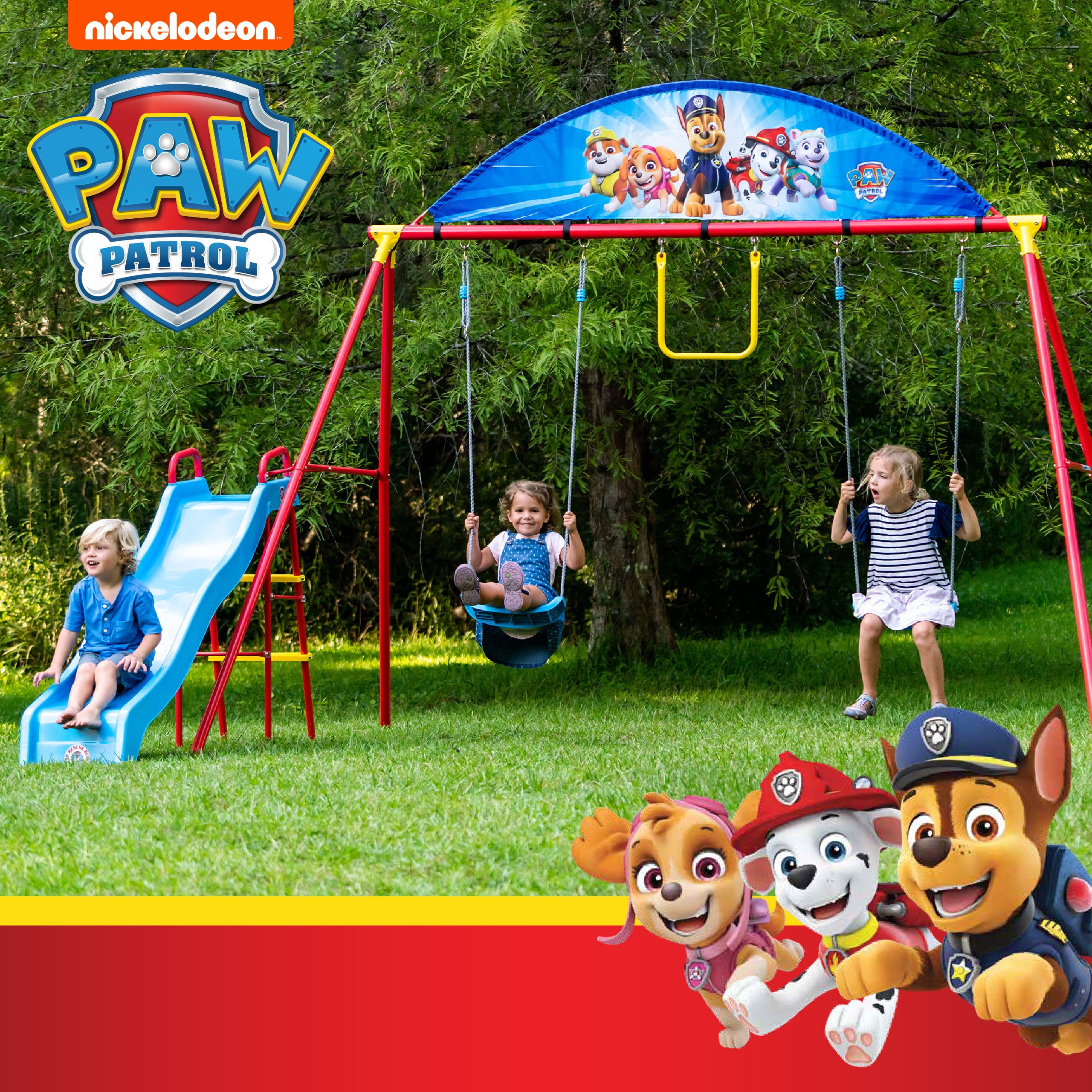 Swurfer Paw Patrol Deluxe Swing Set for Kids, Ages 4 and up. Paw Patrol Swing Set by Swurfer is a complete activity that includes a slide, a trapeze, and two different swings. The Paw Patrol characters join the action-packed excitement this colorful metal swing set has to offer, as kids hang and swing from the trapeze, speed down the slide, or enjoy a steady classic swing. Get fired up with Chase, Marshall, and the rest of the Paw Patrol crew as this swing set can also hold an entire “crew” of kids at the same time! Kids will spend hours of active outdoor play in a number of ways with the Paw Patrol Swing Set.Decorated with characters from Paw Patrol Classic metal swing set with 2 swings, trapeze, and slide.