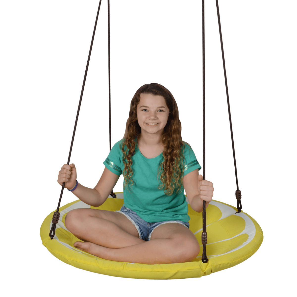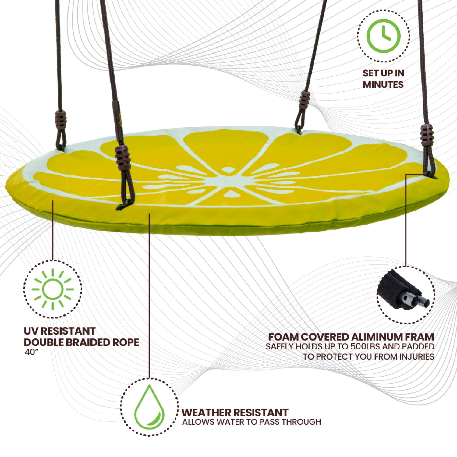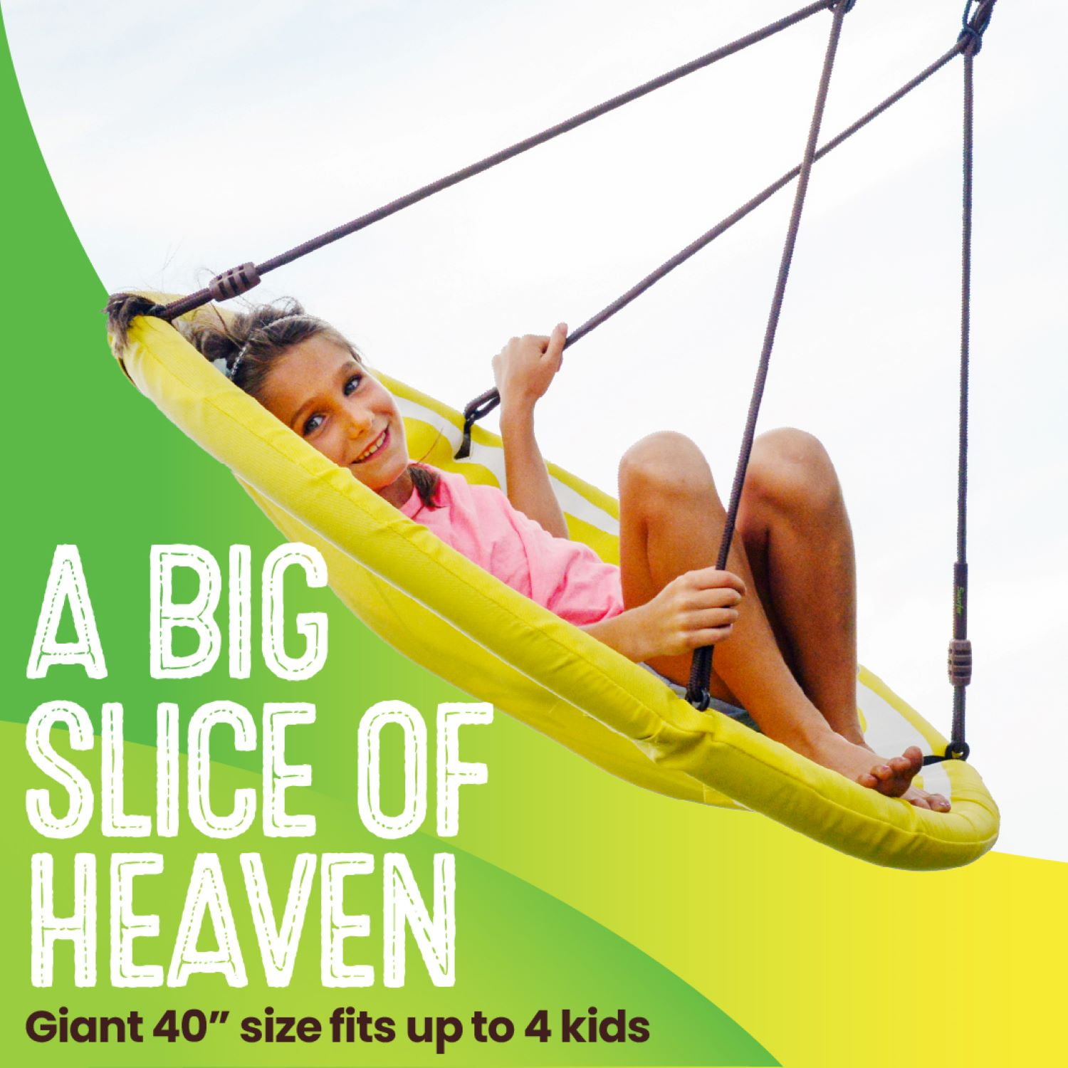 Swurfer Slice 40 Inch Outdoor Saucer Tree Swing Padded Edge, for Kids and Adults Holds up to 500 lbs Product Description: 40″ x 40″ x 2″ A BIG SLICE OF HEAVEN – with it’s gigantic 40 inch diameter, the Slice is big enough for all of your kids to spend all day swinging back and forth under the tree. It’s great for taking naps, doing homework, or simply lounging in the shade and enjoying a nice afternoon breeze. The bright colors of the Slice were selected for their ability to provide a splash of color to your perfectly groomed yard WE TOTALLY STOLE the idea of using the textilene weather resistant fabric from the high end outdoor furniture industry. Textilene is the predominant fabric in the outdoor furniture industry for its ability to withstand harsh weather conditions. The fabric enables water to pass through it quickly so that you can get right back to swinging after an unexpected summer downpour. The double braided rope will hold up to punishment from the elements and stay soft for your hands year after year AS FUN FOR MOM AND DAD AS THE LITTLE ONES – the 40 inch diameter frame can support 500 pounds, which means mom and dad will get just as much enjoyment as the kids. The soft padded edging provides safety for the kids and cushion for your legs hanging over the edge as you take a nap CRAZY FAST ASSEMBLY – the aluminum frame is connected by four bolts, and the easily adjustable rope allows you to hang the Slice at whatever height suits you best