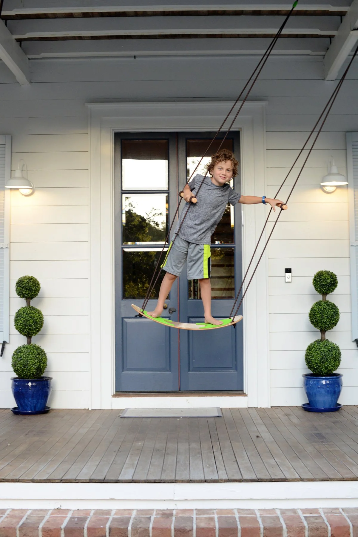 Made of sustainable bamboo Great outdoor standing swing for kids and adults alike Adjustable handles accommodate any height Can hold up to 200 lbs Unique curved shaped engineered for more power, stability, and wide range of motion Each board is hand-crafted for optimum quality Great for improving core body strength, balance, and general exercise Easy instillation with all necessary components included Includes 60-foot double-braided, UV and mildew resistant rope Recommended for kids ages 6 and up