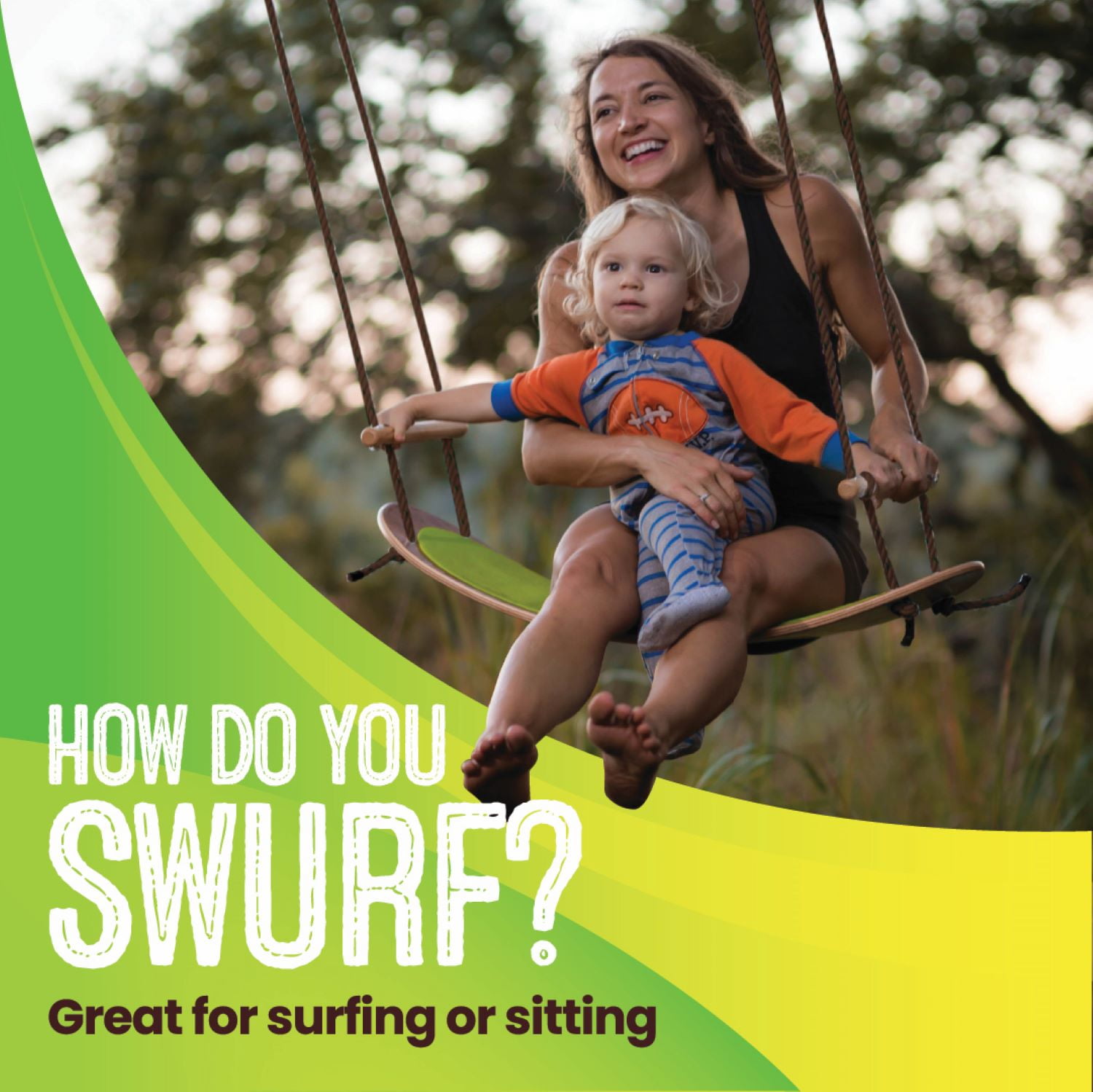 Swurfer The Original Stand up Surfing Swing, Wooden Outdoor Swing for Kids and Adults. Surf the air with the original Swurfer! This outdoor stand up swing for kids and adults is reinventing the backyard hanging swing. For use both as a treeswing or as an add on to a swing set its unique curved shape allows kids and adults up to 200 lbs to soar through the air providing more power moves and fun with each swing! Each swing board is individually shaped sanded and finished by hand to ensure optimum quality and safety. The handles on this tree swing adjust for any height while the versatile Swurfer is great for both those looking foreithera calm gliding swing or an exciting ride! The Swurfer sets up in minutes and comes with an easy to follow instillation guide and all necessary components. The adjustable handles work for users of any height.The Swurfer is a carefree way to build your core and perfect your balance while swinging your cares away. Swurf Grips not included. Trees are essential to many things in nature clean air clean water and a clean climate. A healthy environment sustains the source of the wood for our Swurfer swings nurtures the trees that our swings hang from and supplies the shade that people enjoy on a hot summer day. Swurfer is dedicated to encouraging families and children to enjoy the gift of nature and fostering sustainability of our natural resource is not only the smart thing to do but the right one. With this ideal in mind Swurfer wood products are constructed using wood certified by the Forest Stewardship Council FSC a non-profit organization dedicated to promoting responsible forestry. We have furthered our dedication in sustaining this precious resource by joining the Arbor Day Foundation last year to publicly launch the Time for Trees initiative. This ambitious project aims to plant 100 million trees and inspire 5 million tree planters by 2022 the 150th anniversary of the founding of Arbor Day. We are proud that Swurfer is playing a role in this important large scale effort. Swurfer believes that every day is Earth Day and we stand by our commitment to helping develop a sustainable future in both practice and action