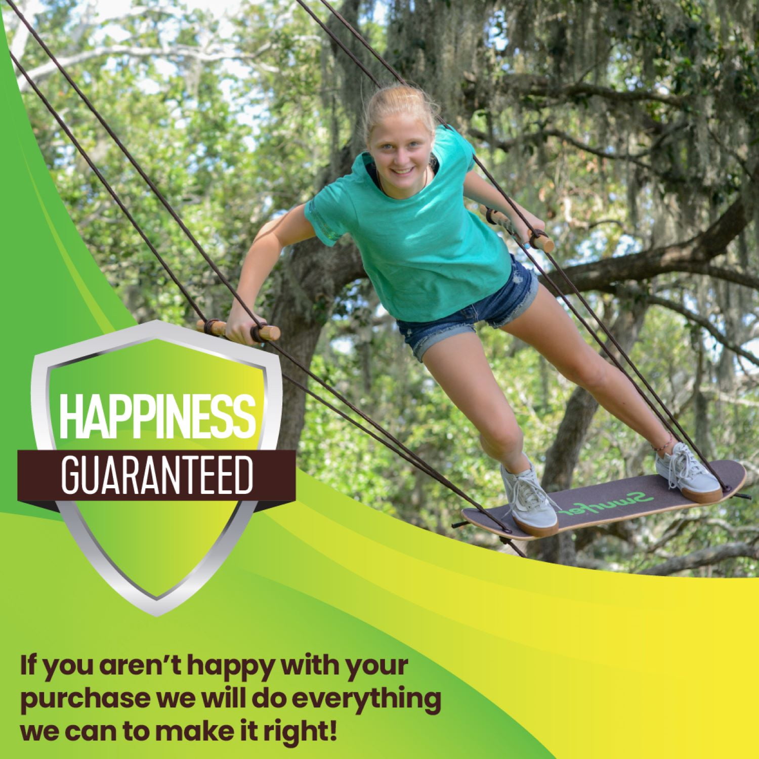 Skate the air with the original Swurfer TreeSkate! Unlike the Original Swurfer’s curved deck design, the TreeSkate features a flat, tapered deck that encourages pumping your legs to generate huge amounts of momentum and swing way up into the sky. The hand-crafted design features a standard 31-inch skateboard deck that comes in three eye-popping graphic varieties: the natural wood finish, Undawadda, and Waves. Grip tape ensures your feet stay locked in place at all times and provides the traction necessary to really put weight into your turns. A fun way to get a solid workout in, the TreeSkate requires heavy glute and thigh activation, while maintaining your balance and keeping your body centered between the handles is a great core workout. Everything needed for a fast setup is included, and the universal straps are rated for 200 lbs and work with all Swurfer swings, so changing setup or adjusting hanging height takes just seconds. The straps fit around tree branches, jungle gyms, and backyard patios. Locking carabiners ensure the TreeSkate never falls and your kids are always safe. Trees are essential to many things in nature—clean air, clean water, and a clean climate. A healthy environment sustains the source of the wood for our Swurfer swings, nurtures the trees that our swings hang from, and supplies the shade that people enjoy on a hot summer day. Swurfer is dedicated to encouraging families and children to enjoy the gift of nature, and fostering sustainability of our natural resource is not only the smart thing to do but the right one. With this ideal in mind, Swurfer wood products are constructed using wood certified by the Forest Stewardship Council (FSC), a non-profit organization dedicated to promoting responsible forestry. We have furthered our dedication in sustaining this precious resource by joining the Arbor Day Foundation last year to publicly launch the Time for Trees initiative. This ambitious project aims to plant 100 million trees and inspire 5 million tree planters by 2022, the 150th anniversary of the founding of Arbor Day. We are proud that Swurfer is playing a role in this important large-scale effort. Swurfer believes that every day is Earth Day, and we stand by our commitment to helping develop a sustainable future in both practice and action.