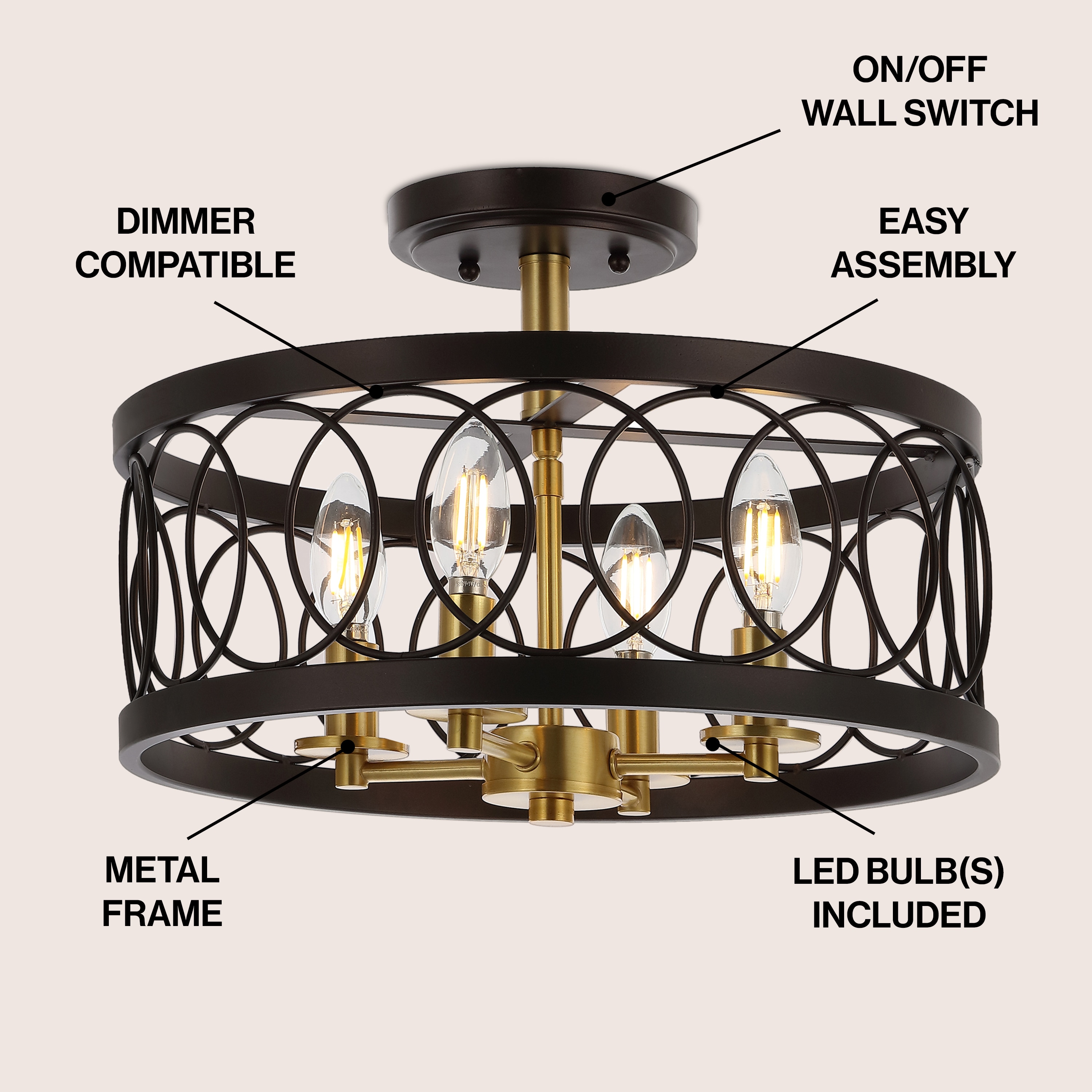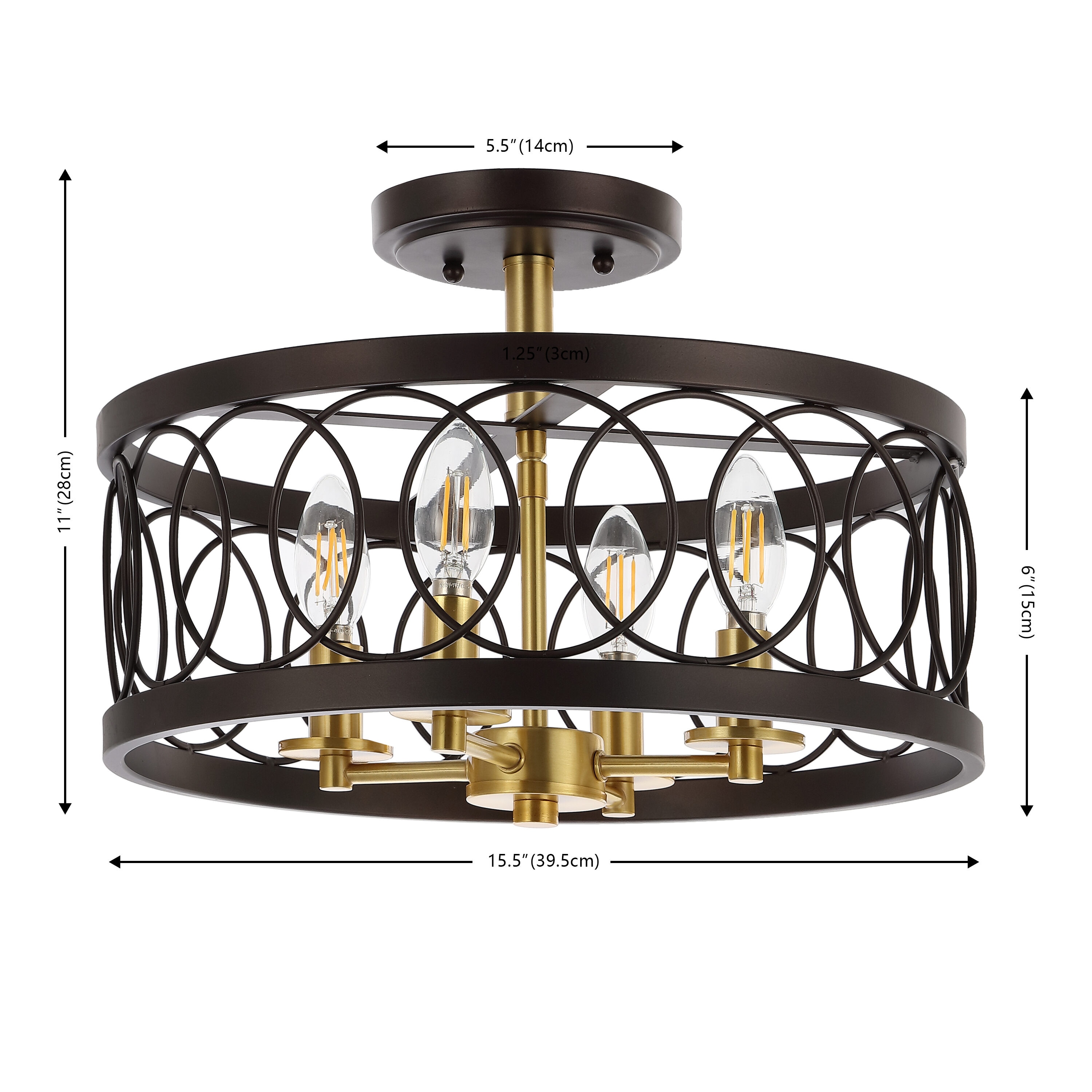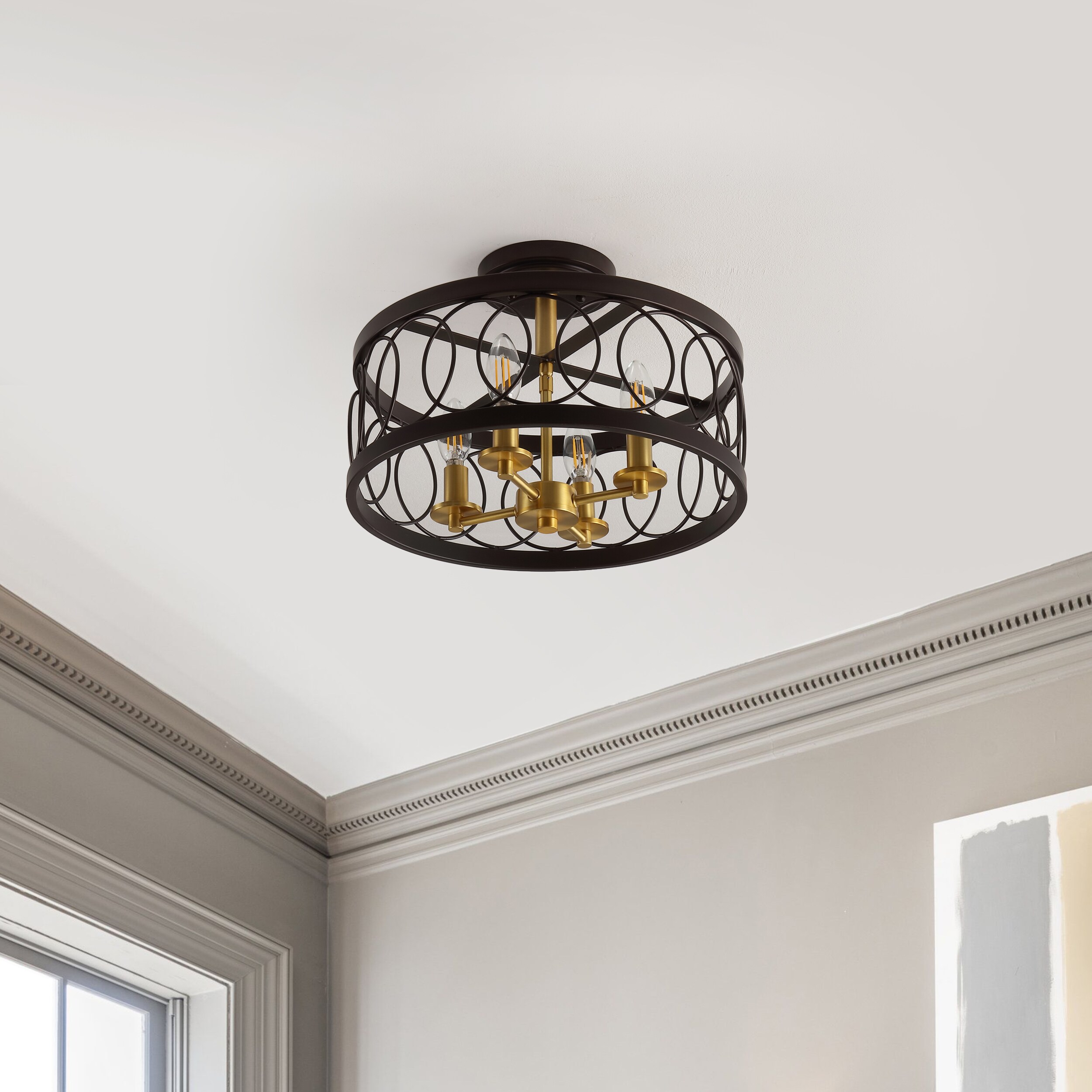Overlapping circles create a beautiful cursive fretwork metal shade on this 4-light semi-flush mount fixture. More opulent than an exposed bulb, the metalwork on this style was designed by artisans that have been producing similar pendants for decades — we had them update the scale to a statement making 15.5″ diameter, and voila! A piece that would look elegant in a bedroom, gracious in a bathroom, or welcoming in an entry.