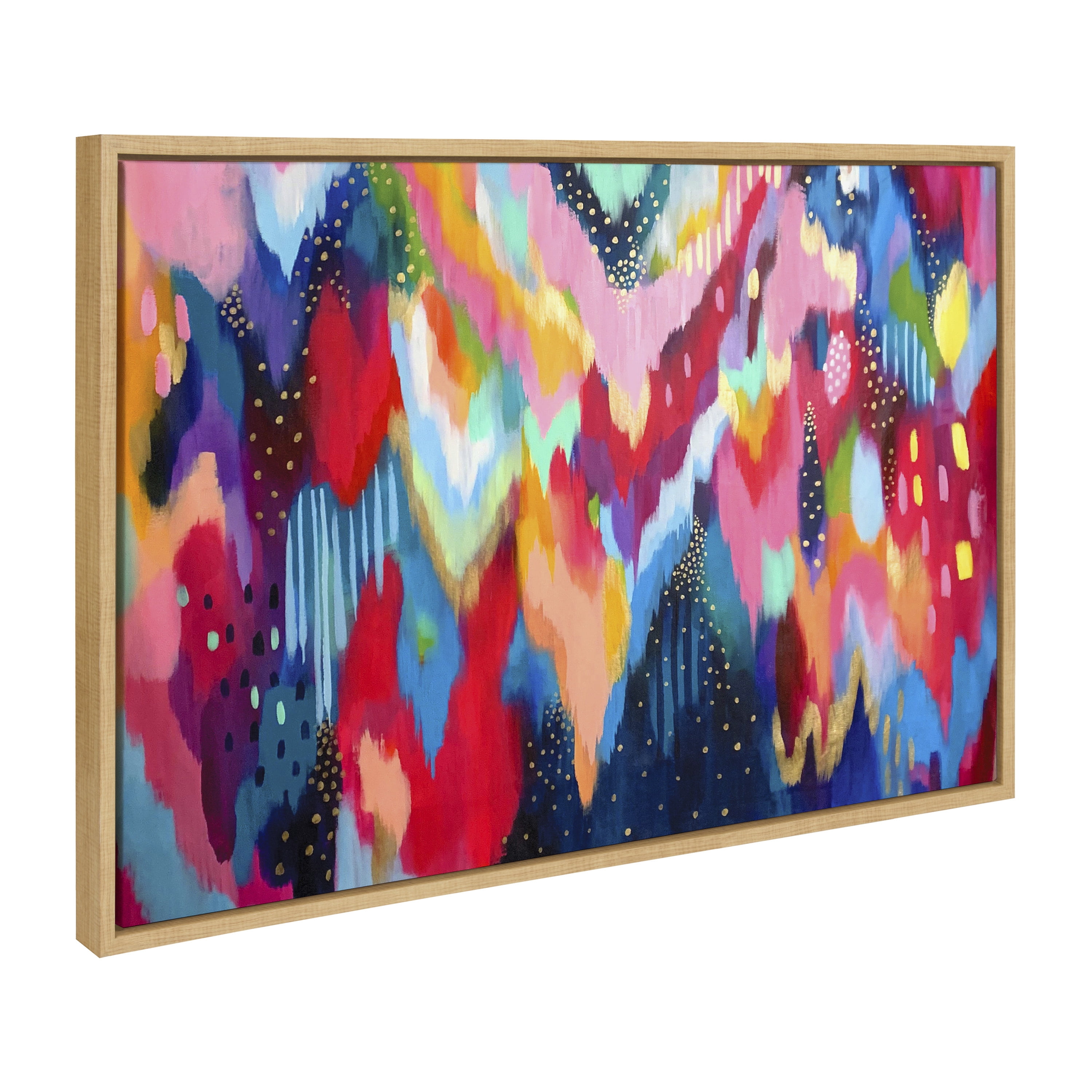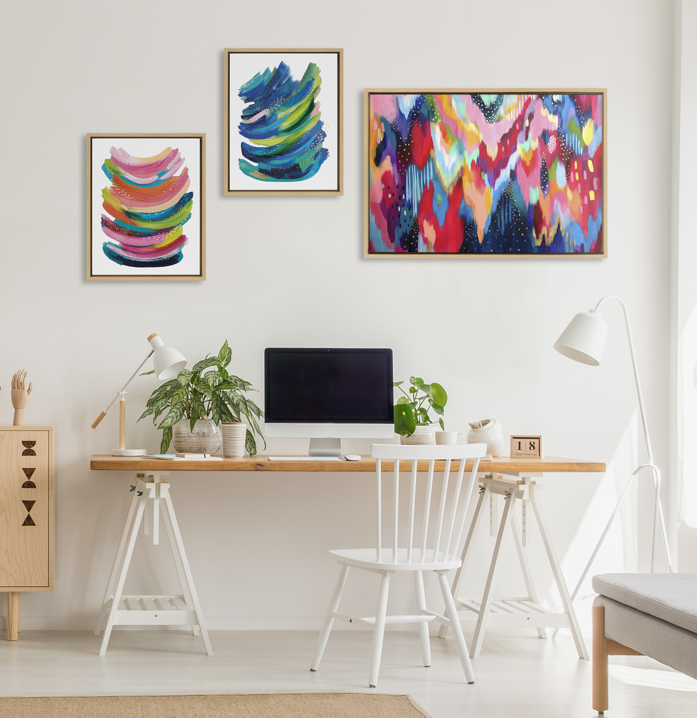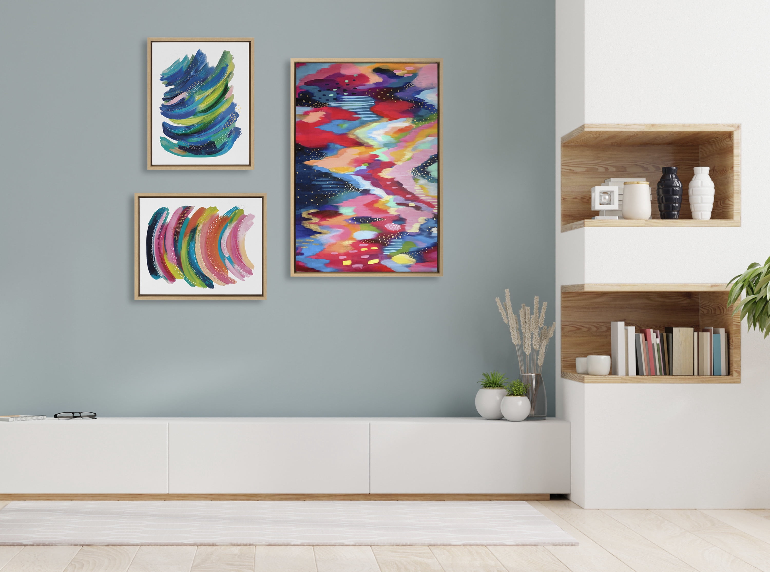 CONTEMPORARY CANVAS WALL ART SET: Modern colorful abstract 3 piece set on framed high quality gallery-wrapped canvas. Display dimensions of the largest piece are 23 inches by 33 inches and the two smaller canvases are each 16 inches by 20 inches QUALITY MATERIALS: Canvas is printed with high-quality, UV fade-resistant inks for picture-perfect detail and incredible depth of color. Canvas is stretched across a solid surface to resist sagging. We use only premium, high-tension canvas. Our exclusive stretching techniques hide corner folds and provide a taut canvas surface EASY TO HANG: The modern solid frames are made with a premium lightweight polystyrene and include hangers to easily hang on the wall LOCALLY HAND FRAMED: We pride our selves on workmanship and quality, so our gallery wrapped canvas is printed and hand framed of domestic and imported parts INDEPENDENT ARTIST DESIGNED: Prints “Brushstroke 100,” “Bright Abstract” and “Bright Abstract 2” ©2022 Jessica Raulet / EttaVee LLC