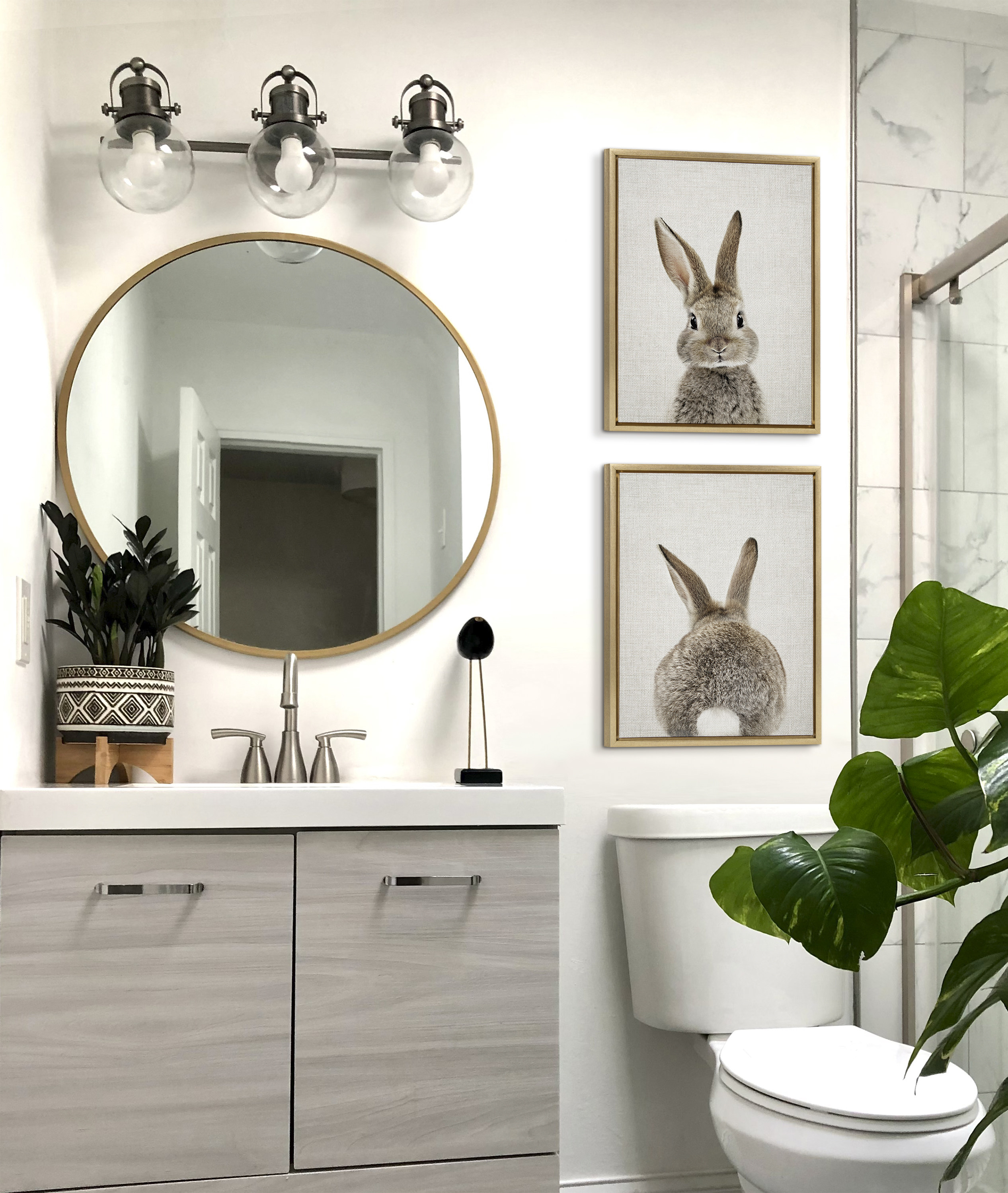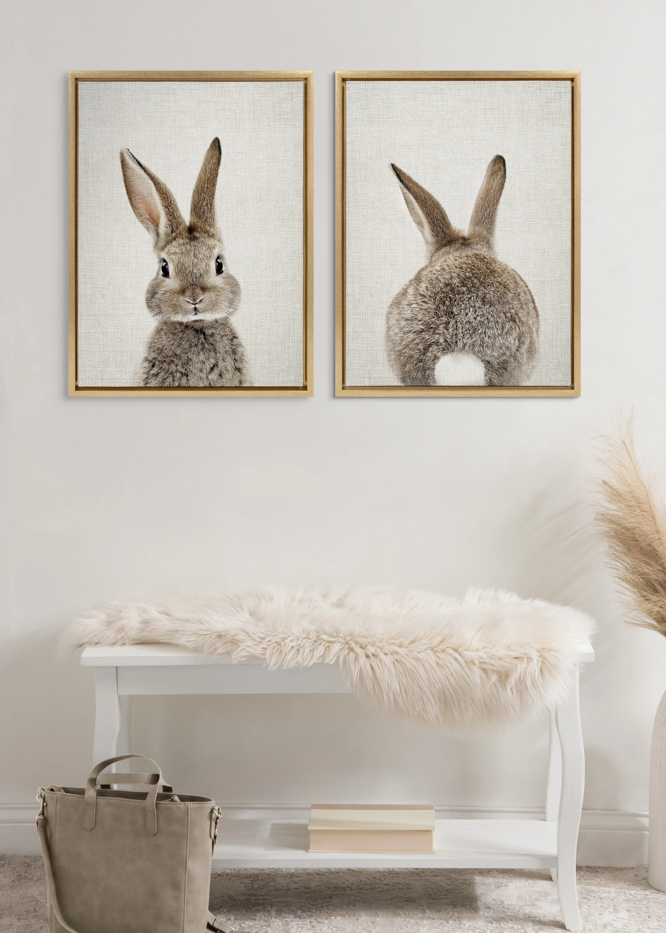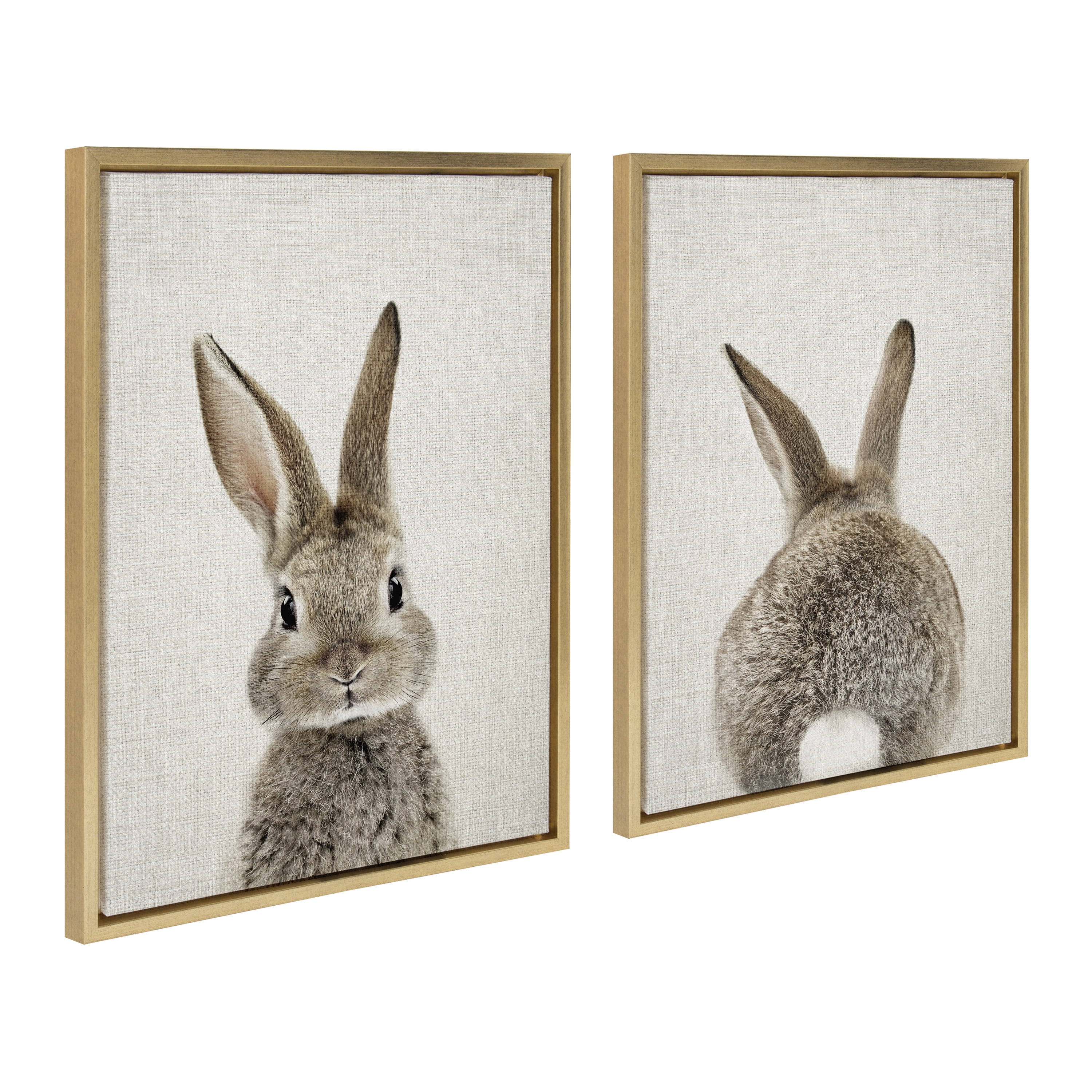 TRANSITIONAL CANVAS WALL ART: Bunny art on framed high-quality linen-textured canvas. Display dimensions are 18 inches by 24 inches QUALITY MATERIALS: Printed with UV-resistant inks to provide increased durability and fade resistance EASY TO HANG: The frame are made with a premium lightweight polystyrene and have metal sawtooth hangers already attached to the back LOCALLY FRAMED: Gallery wrapped canvas is printed and hand framed in Waunakee, Wisconsin, USA of domestic and imported parts ARTIST DESIGNED: Print “Bunny Portrait on Linen and Bunny Tail on Linen” ©2021 Amy Peterson Art Studio