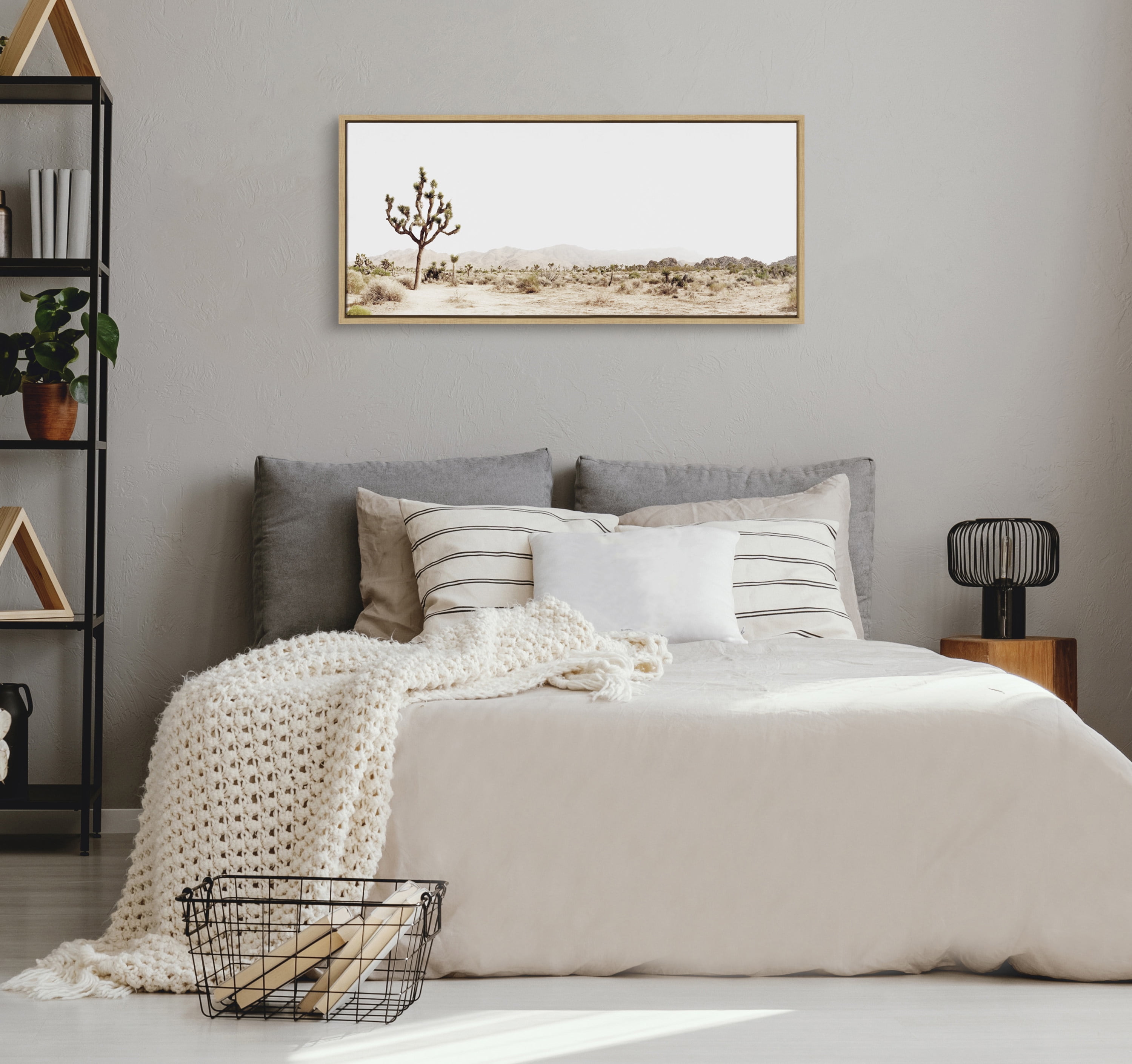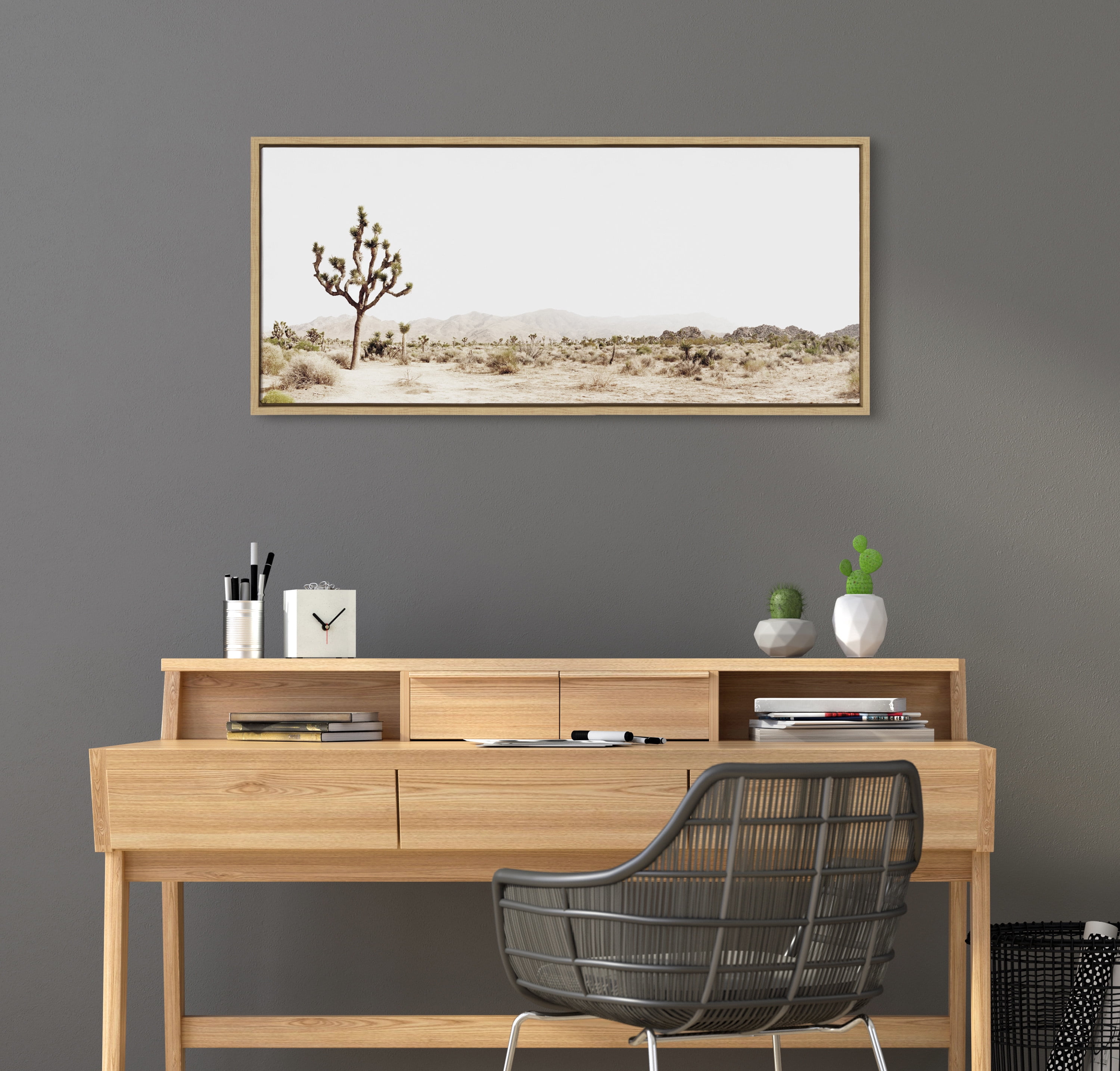 TRANSITIONAL CANVAS WALL ART: Desert landscape art on framed high-quality gallery-wrapped canvas. Display dimensions are 18 inches tall by 40 inches wide QUALITY MATERIALS: Printed with UV-resistant inks to provide increased durability and fade resistance EASY TO HANG: The frame is made with a premium lightweight polystyrene and has metal sawtooth hangers already attached to the back LOCALLY FRAMED: Gallery wrapped canvas is printed and hand framed in Waunakee, Wisconsin, USA of domestic and imported parts ARTIST DESIGNED: Print “Lone Joshua Tree” ©2020 Amy Peterson Art Studio