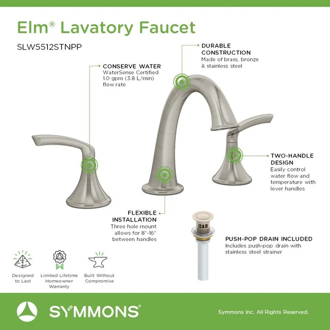 Blending sleek forms and simple lines, the Elm Widespread Two-Handle Bathroom Faucet offers a simple sophistication that is a natural complement to most bathroom designs. All Symmons products are designed with the customer in mind; the proof is in the details. Plated in a scratch-resistant finish over solid metal, this lavatory faucet has the durability to add contemporary elegance to your bathroom for a lifetime. The high-arc spout design allows enough clearance to access your sink, regardless of whether you’re filling a cup or just washing your hands. With an ADA-compliant two-handle design, this widespread faucet allows you to ensure custom water temperature setting with ease of use for everyone. At an eco-friendly low flow rate of 1.0 gallons per minute, this bathroom faucet is WaterSense certified so that you can conserve water without sacrificing performance, saving you money on your water bill. This model includes everything you need for quick installation, including ceramic disc valves to prevent dripping, supply hoses for connection, and coordinating push-pop drain assembly for convenience. With features that are crafted to last and a style that is designed to please, the Symmons Elm Widespread Two-Handle Bathroom Faucet is a seamless addition to your bathroom and is backed by our limited lifetime warranty.