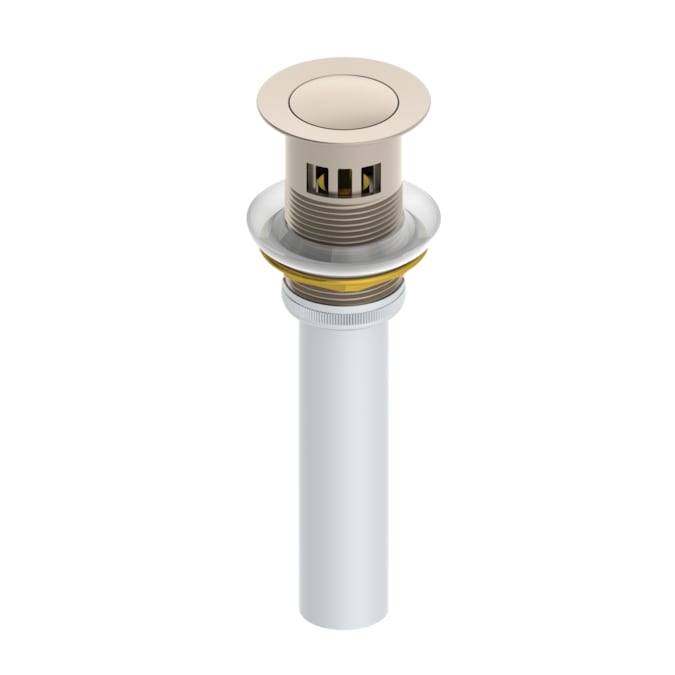 - Metal push-pop drain assembly that is pushed to open and close