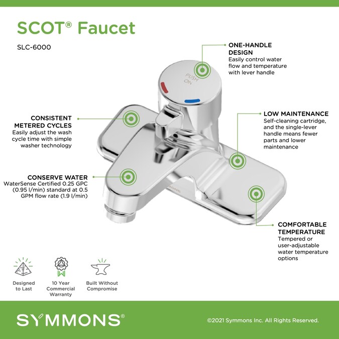 Heavy duty, cast brass body, and stainless steel parts are standard with all Symmons SCOT/Metering Faucets. Ideal for healthcare, institutional, and public use applications. Trusted by professionals for over 80 years, Symmons will deliver the quality you expect and the looks you desire.