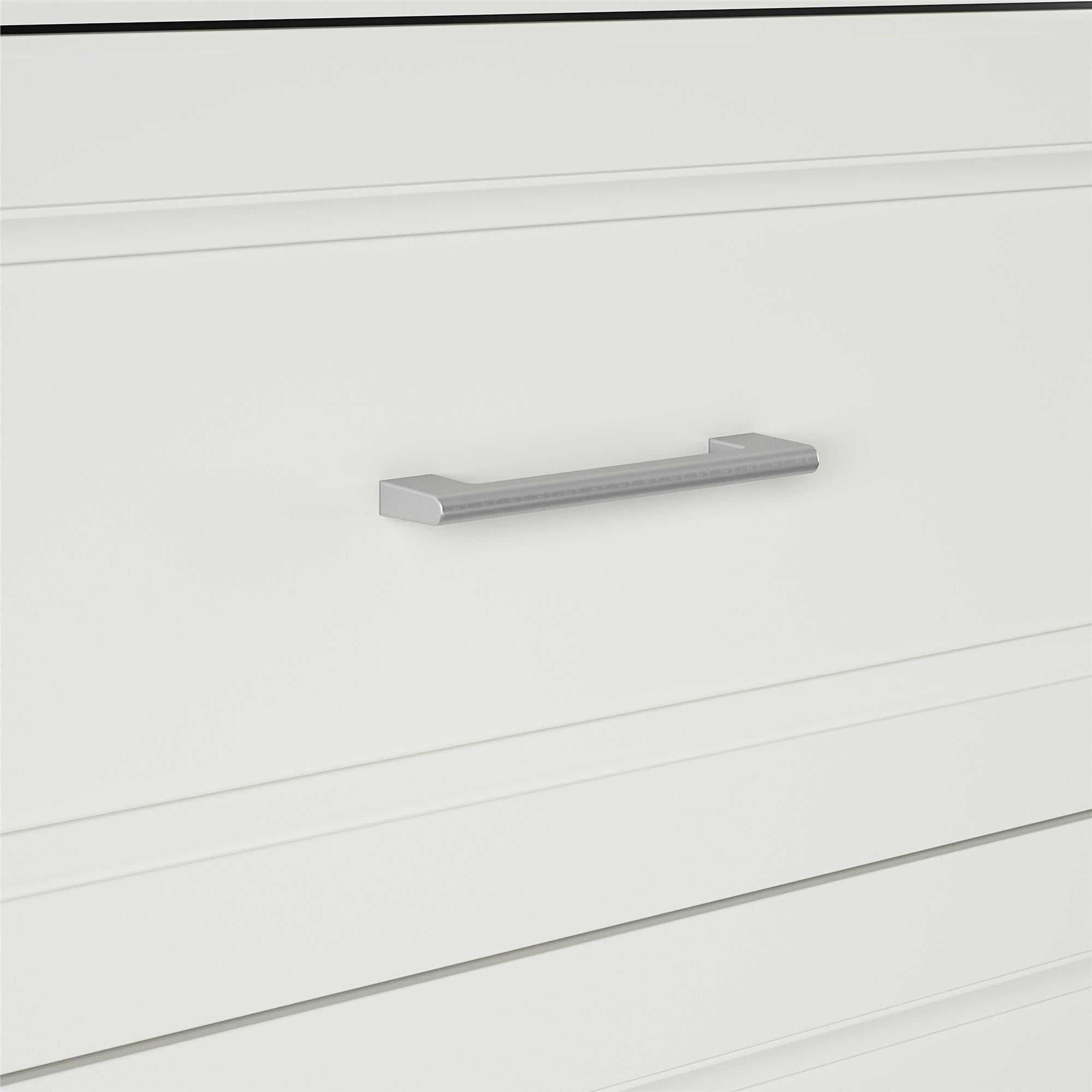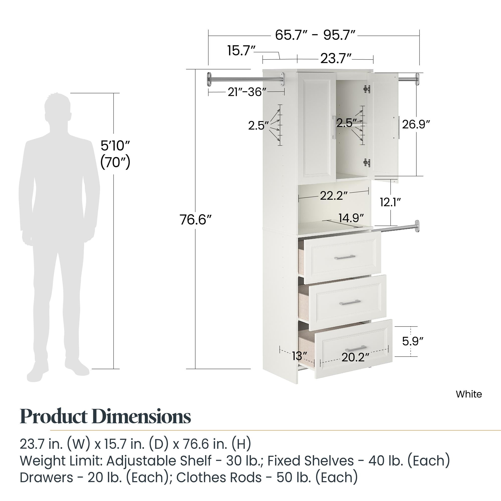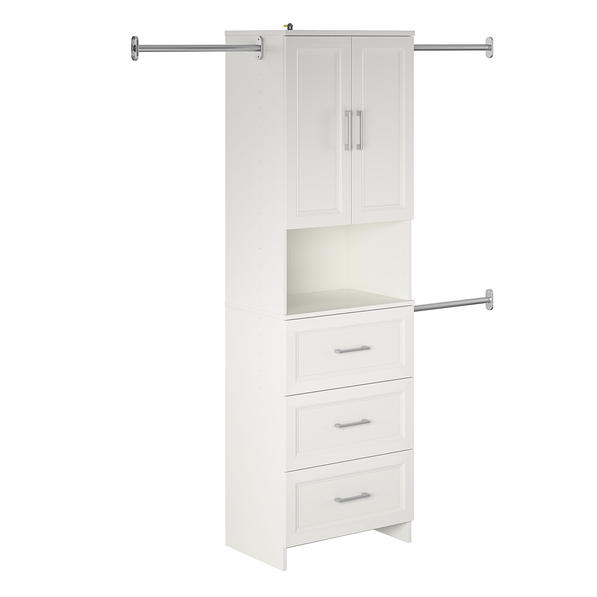 Streamline your morning routine with The Nevaeh Ridge 3 Drawer Closet Organizer from Ameriwood Home Featuring three adjustable clothing rods (from 21″ to 36″), three lower drawers, two shelves behind closed doors (one adjustable shelf and one fixed), and one open cubby for your handbag and go-to items Finished in a laminated white stipple, this particleboard and metal tube construction measures to be 76.65″ H x 65.7-95.7″ W x 15.67″ D; Ships flat in one box; Two adults recommended to assemble; Wall anchor & one-year limited warranty included Interior Drawer dimensions: 20.16″ W x 5.89″ H x 12.97″ D; Interior Storage: (Open Area) 22.20″ W x 12.13″ H x 14.96″ D; Interior Storage: (Beyond Doors) (2) storage spaces (adj. heights) 22.20″ W x 26.85″ H x 14.92″ D Max weight Capacities: Rods (x3): 50 lbs.; Fixed shelves: (x2) 40 lbs. Adjustable shelf: 30 lbs. Drawers: (x3) 20 lbs. Unit weight: 106 lbs.