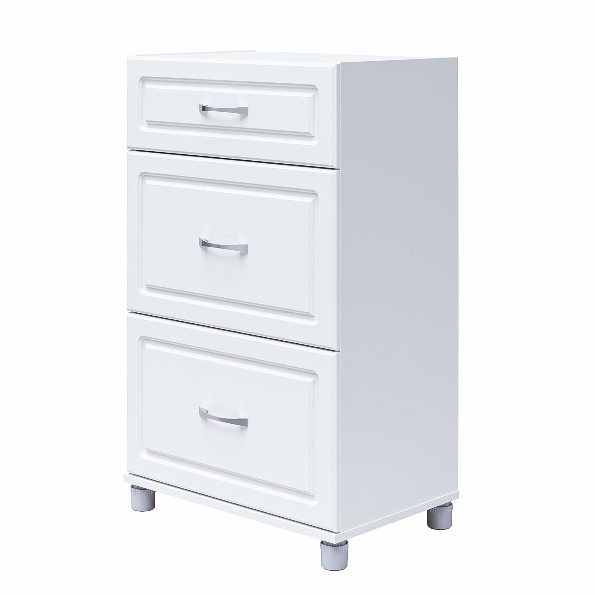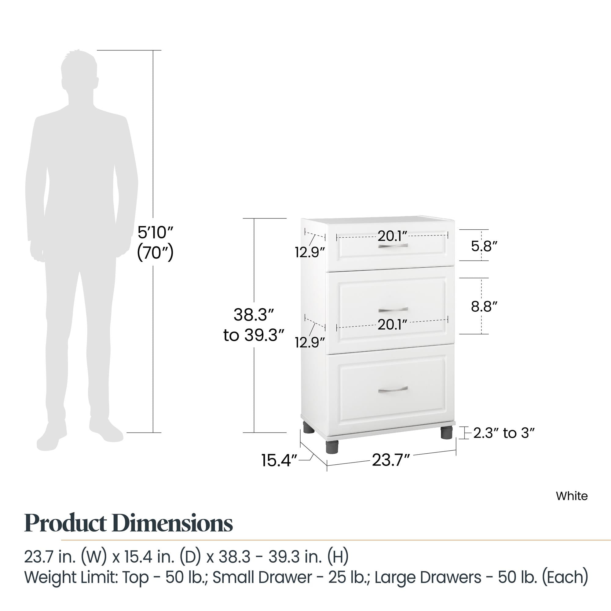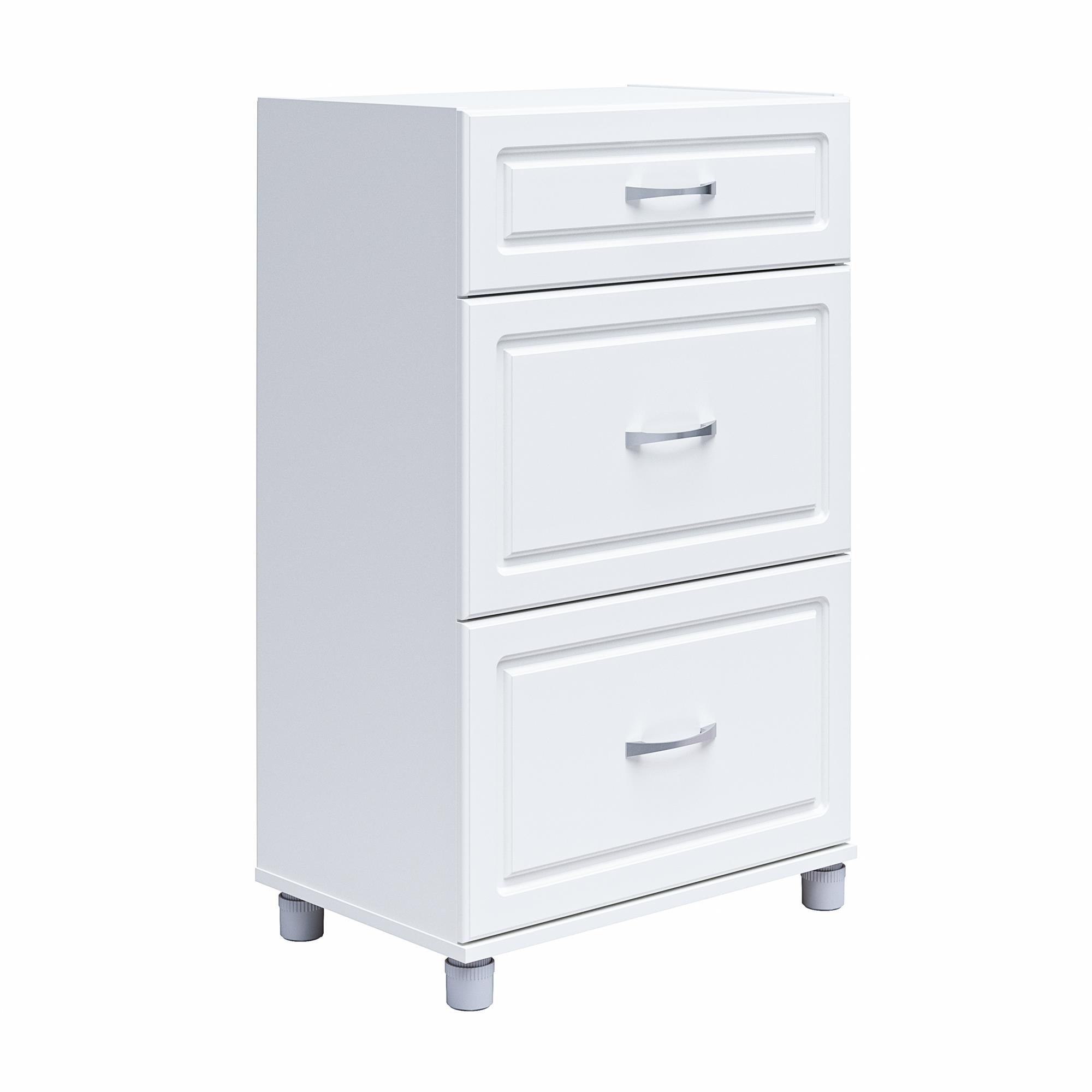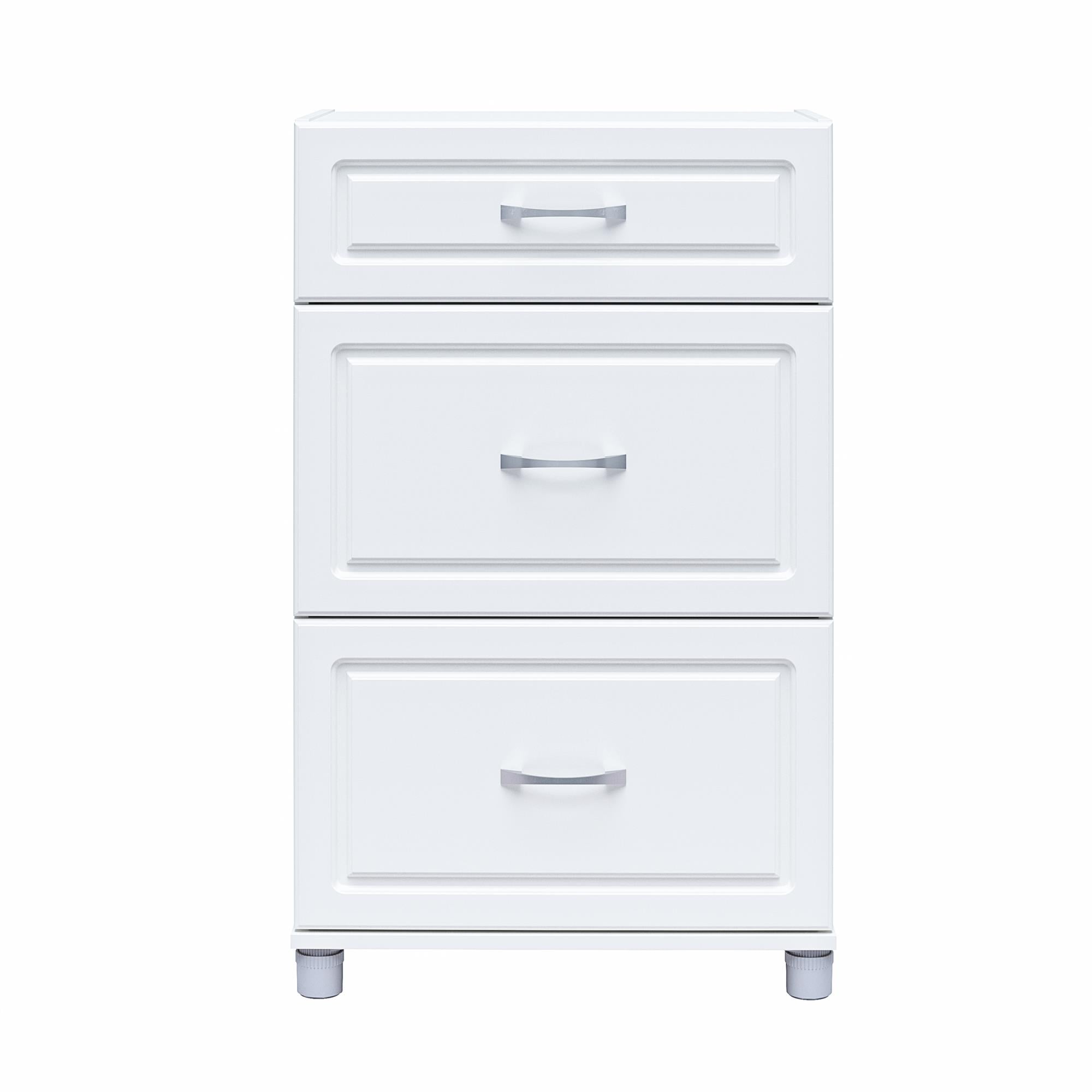 Upgrade your storage capabilities with the Systembuild Evolution Kendall 24″ 3 Drawer Base Cabinet The water resistant white finish on the laminated MDF and particleboard makes this Cabinet perfect for adding storage to any room in your home The Base Cabinet features 1 small and 2 large drawers with full extension slides to organize all of your household items. Countertops not included. Adjustable feet keeps the Cabinet level on uneven floors