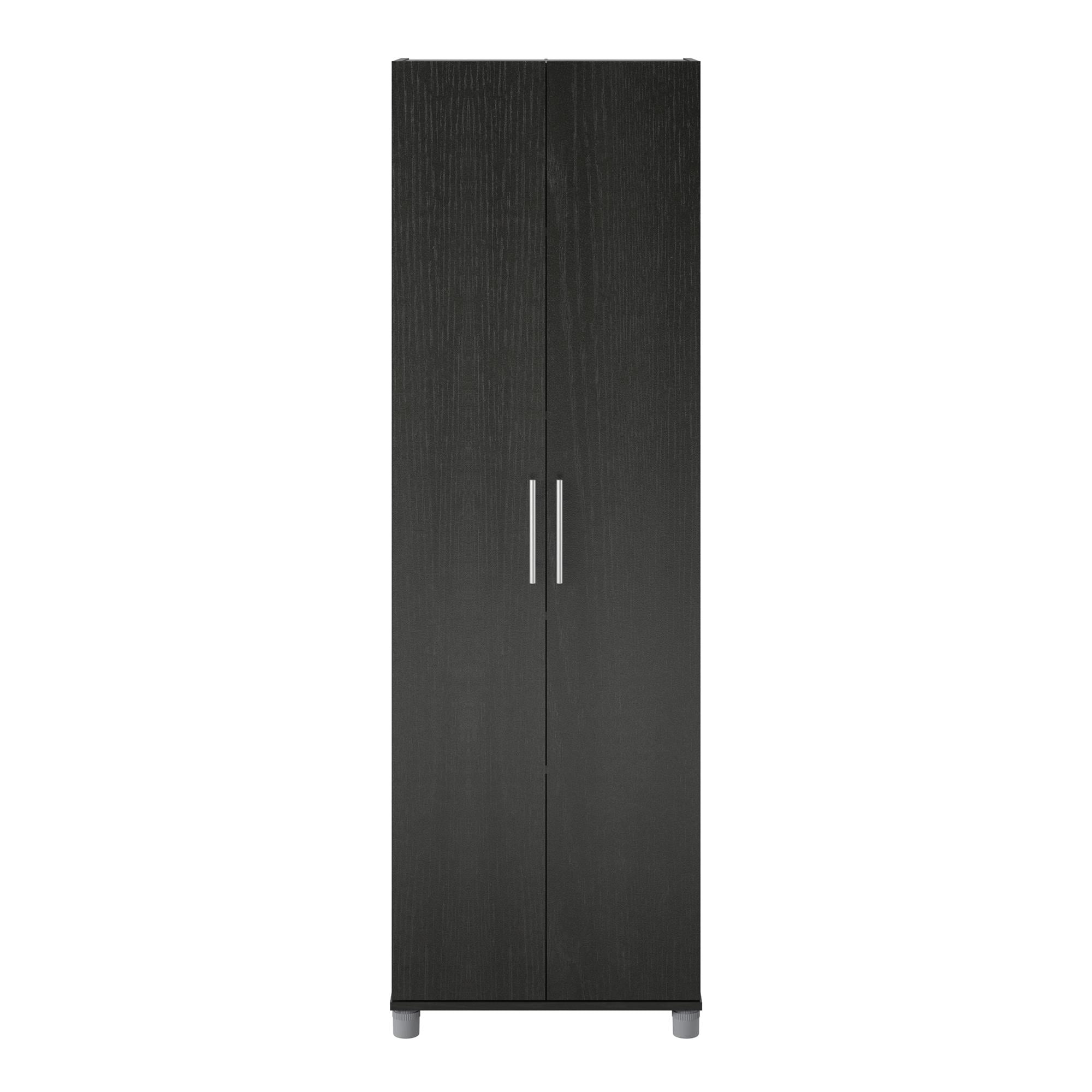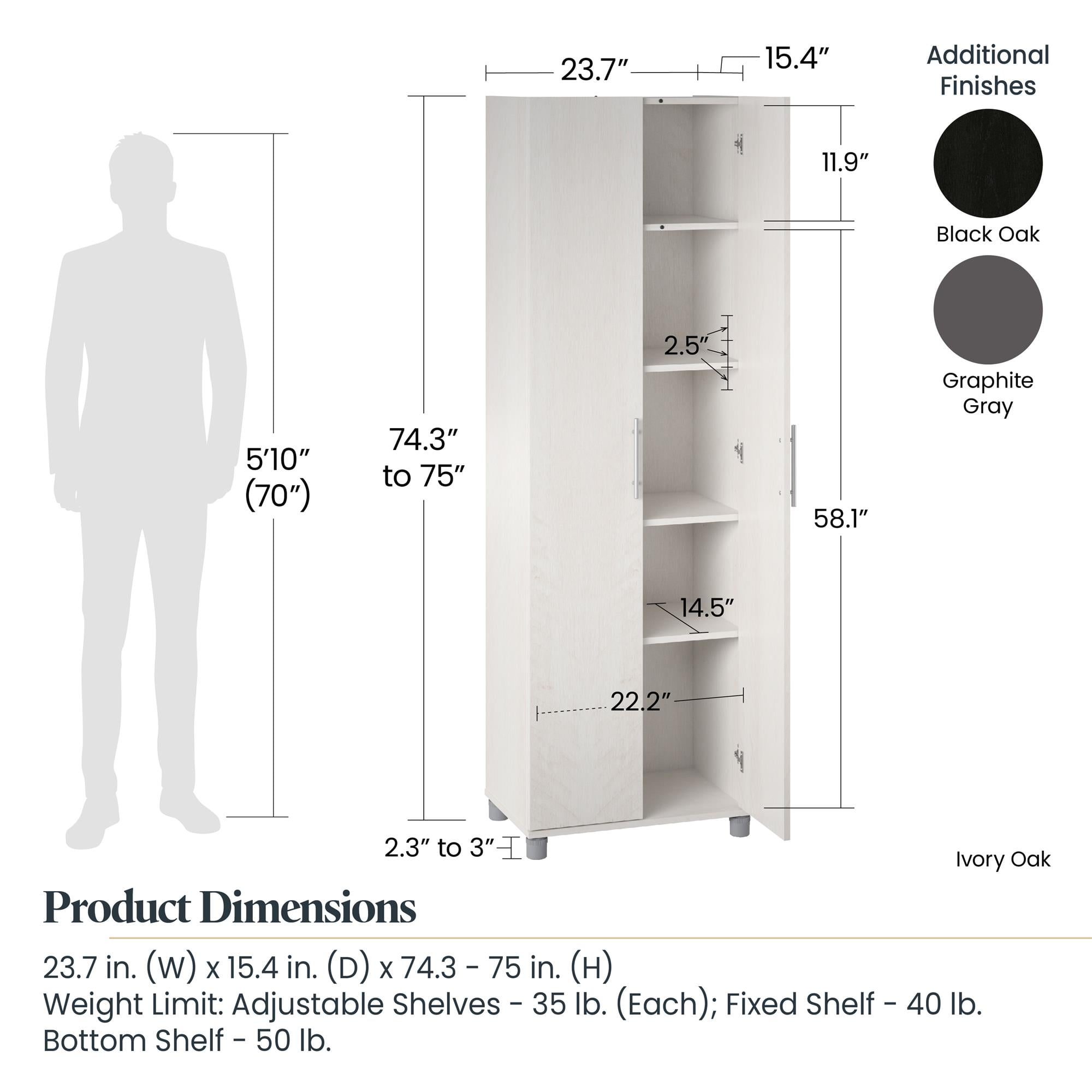 The SystemBuild Evolution Camberly 24″ Utility Storage Cabinet adds extra storage to any room The 5 shelves, 3 adjustable, can store and organize your cleaning or craft supplies and even kitchen pantry items. Adjustable feet keep your Cabinet level on uneven floors and up and away from spills or standing water in the garage or basement Made of laminated particleboard, the Camberly 24″ Utility Cabinet in black oak with satin nickel hardware can be added to any style and decor without breaking the bank Wall anchor kit is included to prevent tipping injuries and keep your family safe