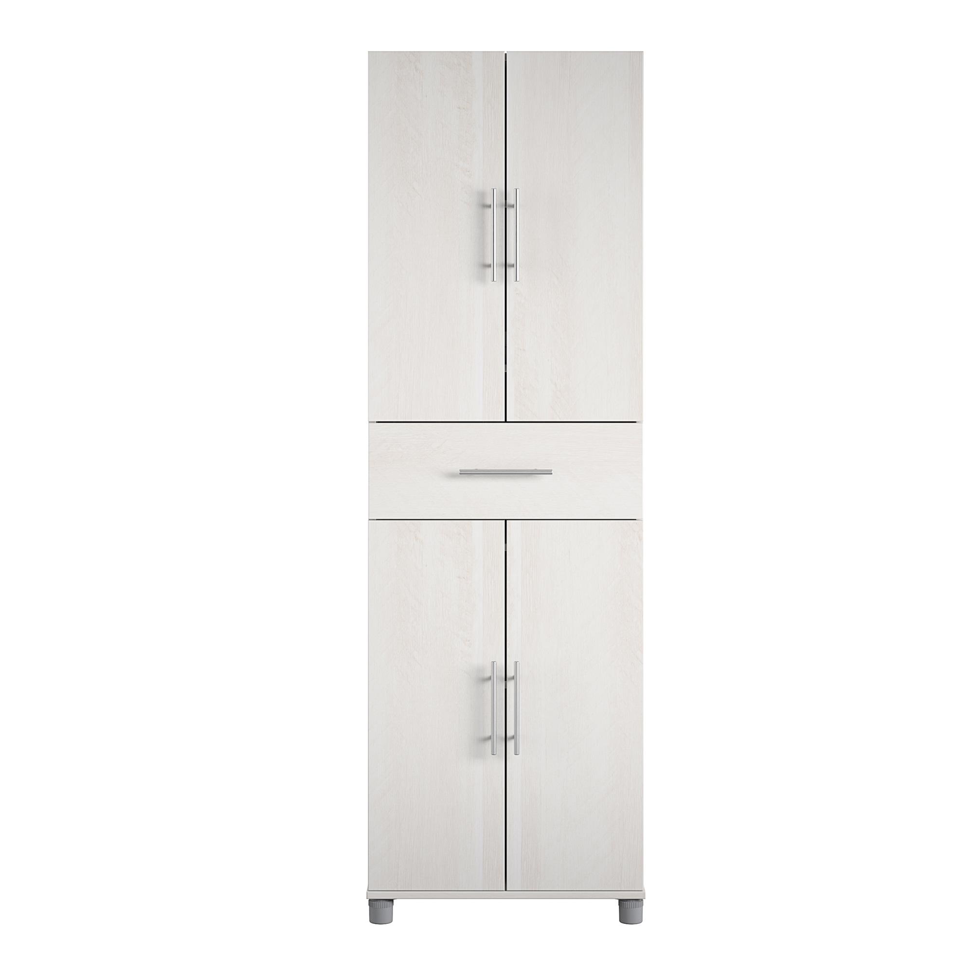 Get extra storage where you need it most with the Systembuild Evolution Camberly 4 Door/1 Drawer Storage Cabinet. The clean Ivory Oak finish on the laminated particleboard gives the Cabinet a modern look at an affordable price. The Cabinet features 2 upper and lower doors and a drawer for concealed storage wherever you need. Behind each of the doors are 1 adjustable and 1 fixed shelf for plenty of space to store both large and small items. Store away and organize everything from kitchen pantry items, cleaning supplies, office supplies, and board games. The drawer is a perfect spot to store away smaller items like batteries, writing utensils, or stationary and features metal slides for years of use. The adjustable feet make keeping your Cabinet level on uneven floors simple. A wall anchor kit is included to prevent tipping injuries and keep your family safe. Use this piece as a stand-alone item, or combine it with additional Systembuild Evolution Camberly storage units to create the perfect storage solution for your home. The Storage Cabinet ships flat to your door and requires assembly upon opening. Two adults are recommended to assemble. Once assembled, the Storage Cabinet measures to be 75.25″H x 23.46″W x 15.4″D.