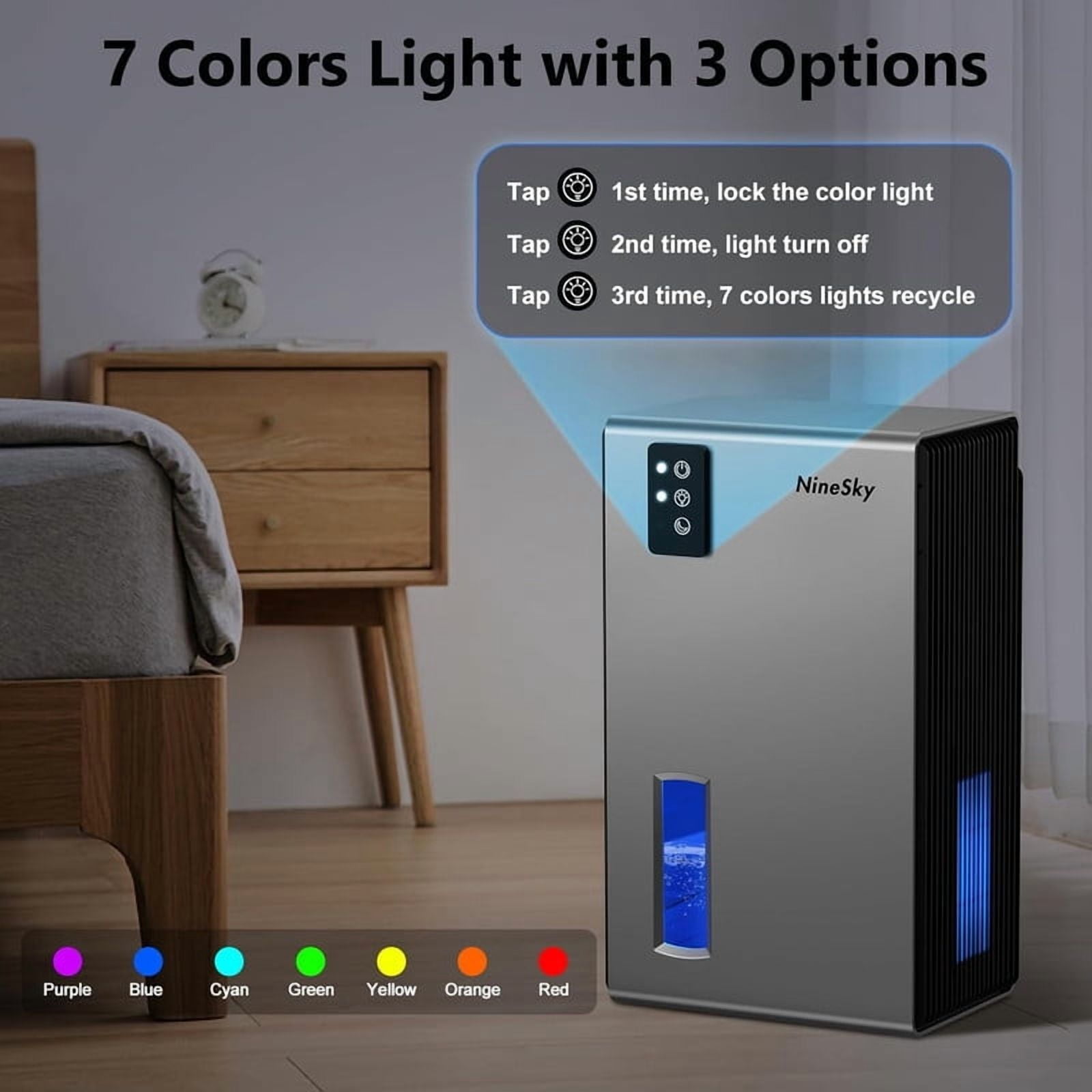Features Color: Gray Item Weight: 16 Ounces Product Dimensions: 5.5″D x 8.3″W x 14″H (14.6cm*21cm*35cm) Floor Area: 800 Square Feet Special Feature: Automatic Shutoff Capacity: 5.9 Pounds Tank Volume: 800 Milliliters Recommended Uses: Residential Work Mode: Day Mode (30dB-40dB) & Night Mode (<30dB) High Efficient Dehumidifiers for Home: Still annoyed about the muggy weather? Just Take it easy! have a try at 95OZ mini dehumidifier, in a closed small room with humid environment of 86°F and 80% RH, it can collect 1L water one day, and with very low energy consumption (no more than 1-kilowatt hour a day). Portable Dehumidifier for Bedroom: With a compact size of 8.3(L)*5.5(W)*14(H) inch and a built-in handle on the back, it is very convenient to be placed everywhere. Helping to get the excess moisture out of the air for you in basement, bedroom, bathroom, RV, closet, garage, kitchen. Auto Shutt Off Protection: Smart dehumidifier with auto shut off function when the water tank is full or in a wrong position, perfect to prevent the water from overflowing when you did not notice, very safe and convenient to use when you are not at home. 2 WORKING MODELS: High speed mode with powerful speed for quickly and efficiently reduce the humidity. Night mode(sleep mode) with low speed operation, quietly working (<30db) while you are sleeping. Switch freely the 2 modes as your need. 7 Colorful Light: Dehumidifiers for Bathroom have a separate light button, which can emit 7-color romantic atmosphere lights for you, and the ultra-quiet operation (30dB) creates a comfortable and peaceful environment for your bedroom and office.