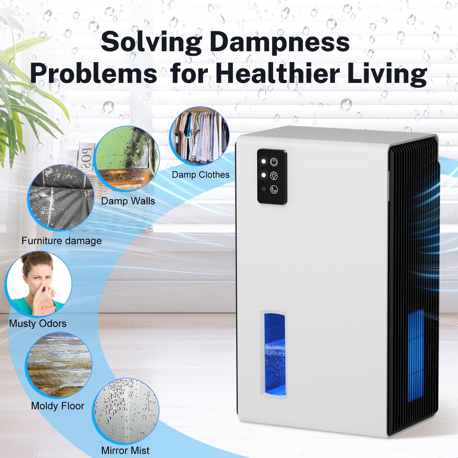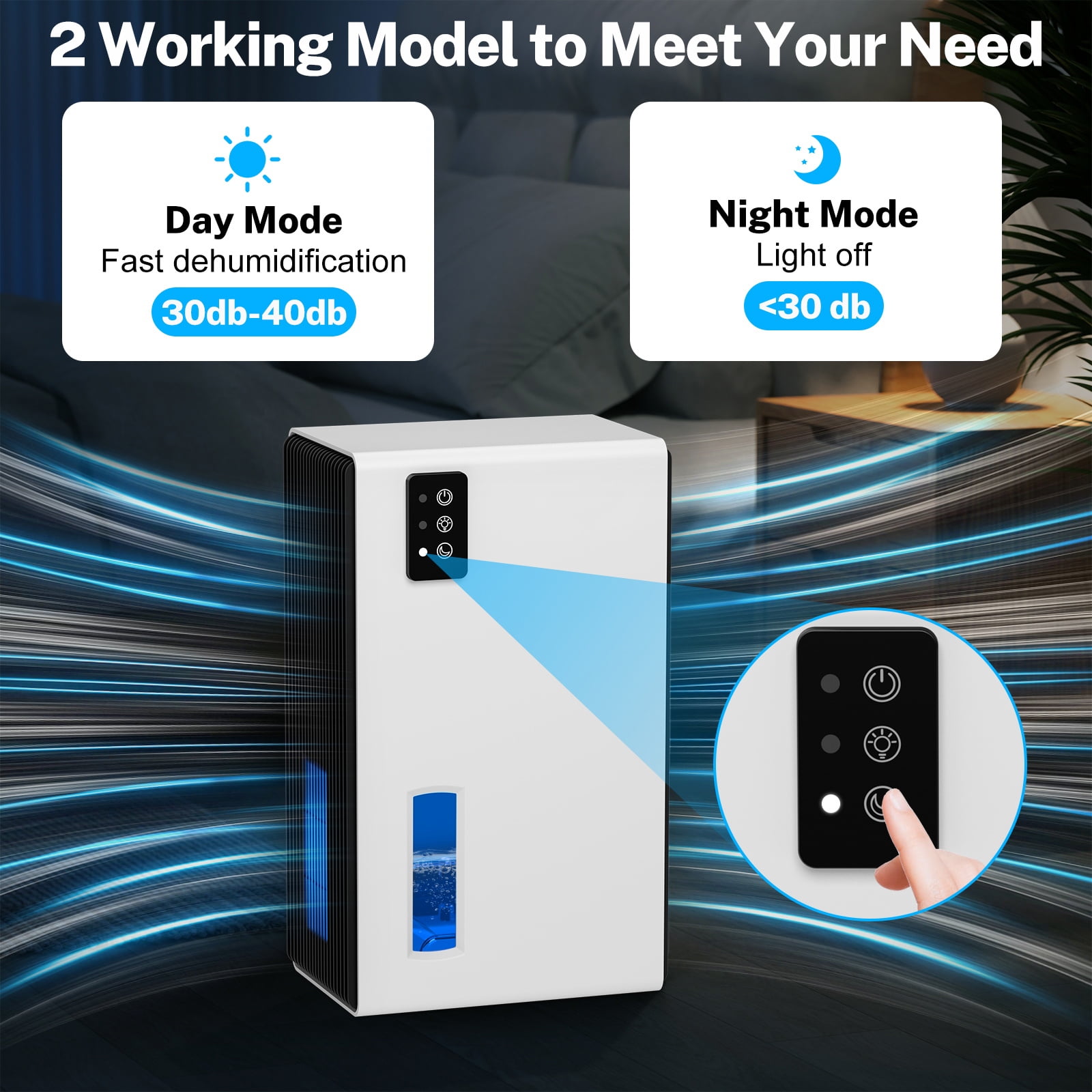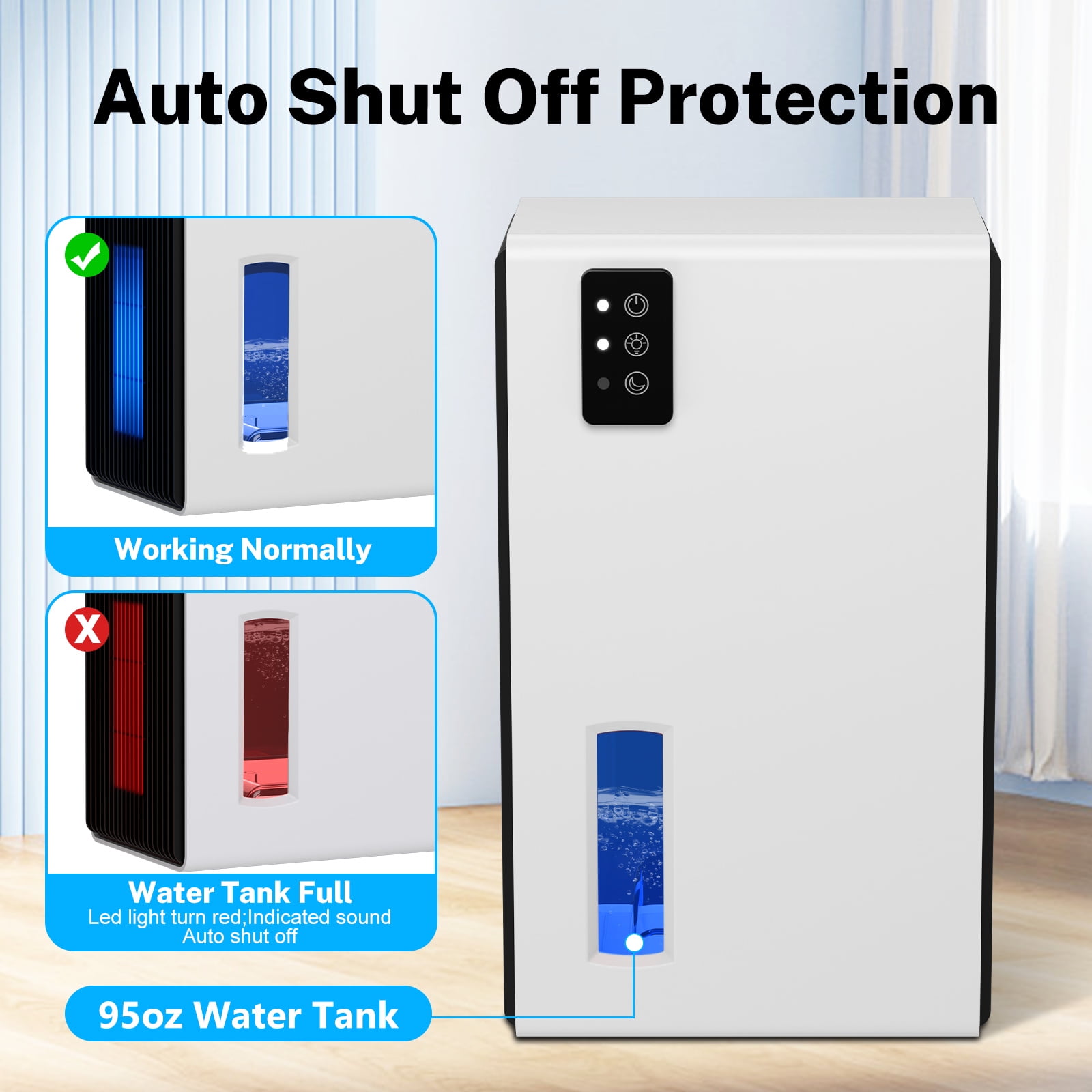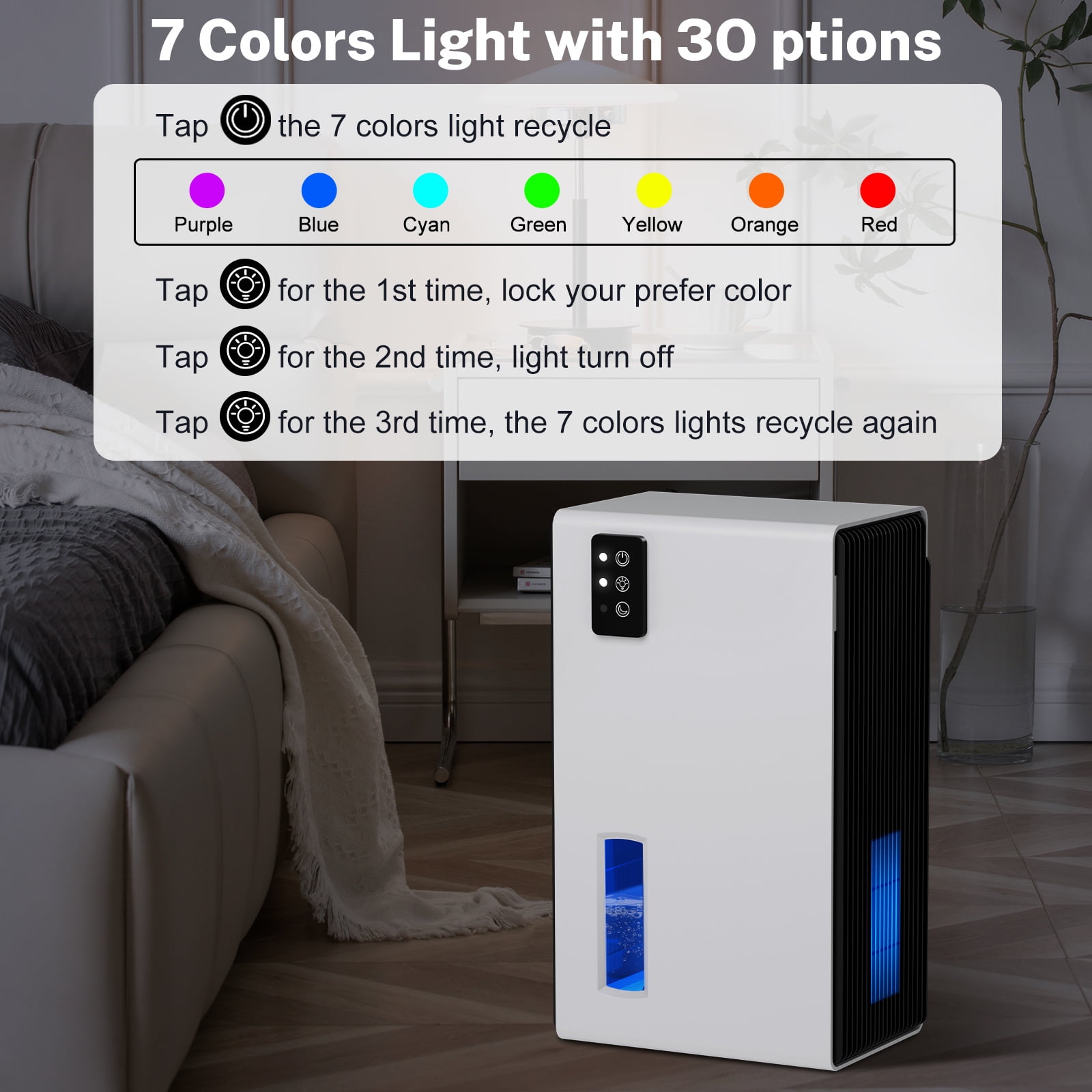 FeaturesColor: WhiteItem Weight: 16 OuncesProduct Dimensions: 5.5″D x 8.3″W x 14″H (14.6cm*21cm*35cm)Floor Area: 800 Square FeetSpecial Feature: Automatic ShutoffCapacity: 5.9 PoundsTank Volume: 800 MillilitersRecommended Uses: ResidentialWorking Environment:59°F-104°F, >45%RHWork Mode: Day Mode (30dB-40dB) & Night Mode (<30dB) High Efficient Dehumidifiers for Home: Still annoyed about the muggy weather? Just Take it easy! have a try at 95OZ mini dehumidifier, in a closed small room with humid environment of 86°F and 80% RH, it can collect 1L water one day, and with very low energy consumption (no more than 1-kilowatt hour a day). Portable Dehumidifier for Bedroom: With a compact size of 8.3(L)*5.5(W)*14(H) inch and a built-in handle on the back, it is very convenient to be placed everywhere. Helping to get the excess moisture out of the air for you in basement, bedroom, bathroom, RV, closet, garage, kitchen. Auto Shutt Off Protection: Smart dehumidifier with auto shut off function when the water tank is full or in a wrong position, perfect to prevent the water from overflowing when you did not notice, very safe and convenient to use when you are not at home. 2 WORKING MODELS: High speed mode with powerful speed for quickly and efficiently reduce the humidity. Night mode(sleep mode) with low speed operation, quietly working (<30db) while you are sleeping. Switch freely the 2 modes as your need. 7 Colorful Light: Dehumidifiers for Bathroom have a separate light button, which can emit 7-color romantic atmosphere lights for you, and the ultra-quiet operation (30dB) creates a comfortable and peaceful environment for your bedroom and office.