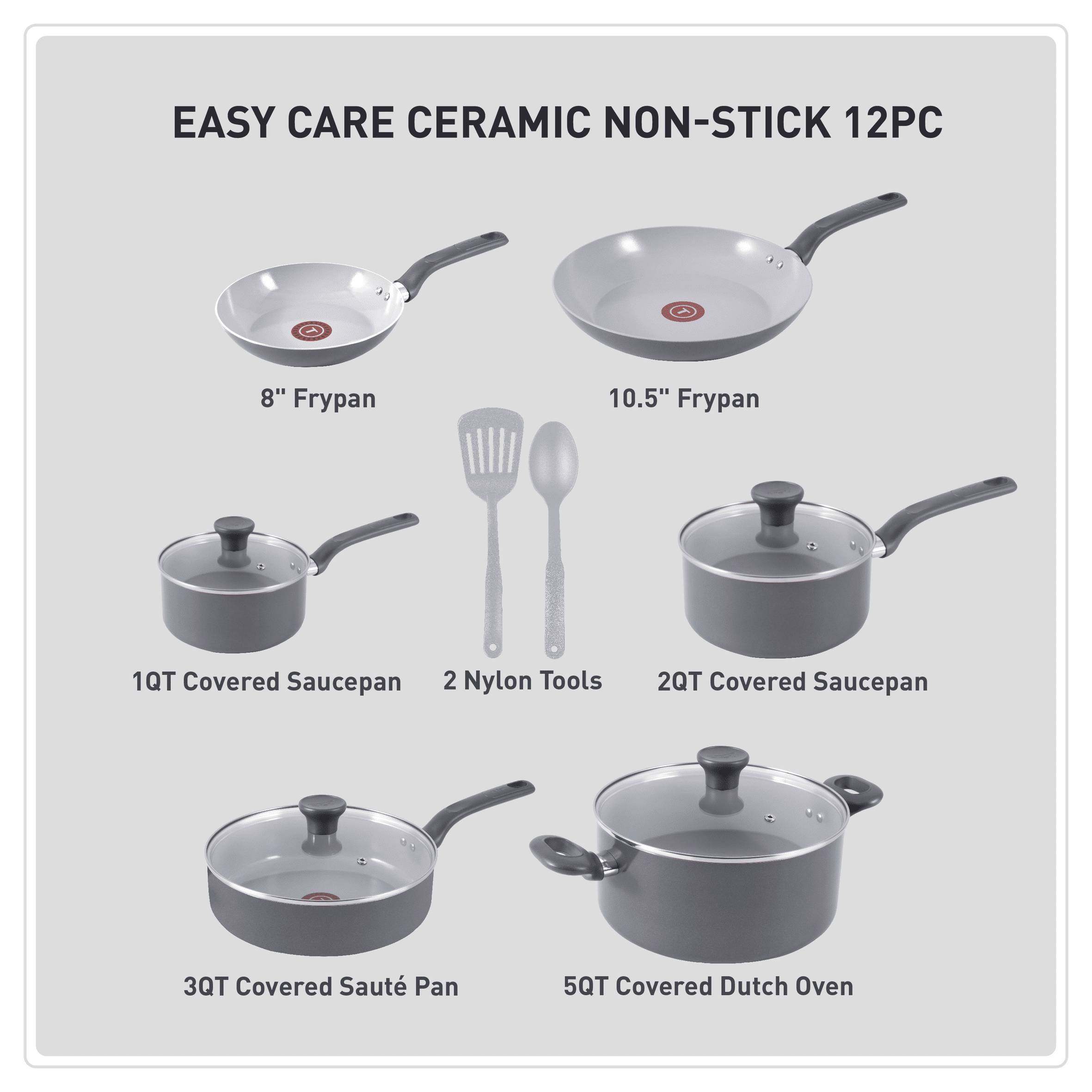 Tfal 12 Piece Easy Care Ceramic Pot and Pan Cookware Set, Gray Eco-Friendly: Made with 100% recycled aluminum and ceramic nonstick interior, allowing for healthy cooking with little to no oil Complete Set: Includes 8″ & 10.5″ frypans, 1 QT & 2 QT saucepans with lids, 3 QT sauté pan with lid, 5 QT Dutch oven with lid, slotted spatula, and solid spoon Thermo-Spot Technology: Heat indicator turns red when pans are pre-heated, ensuring even cooking without hot spots Stylish Design: Features comfortable handles and vented glass lids for easy cooking and heat retention Easy to Use: Compatible with all cooktops except induction, oven safe up to 350°F. Hand wash recommended