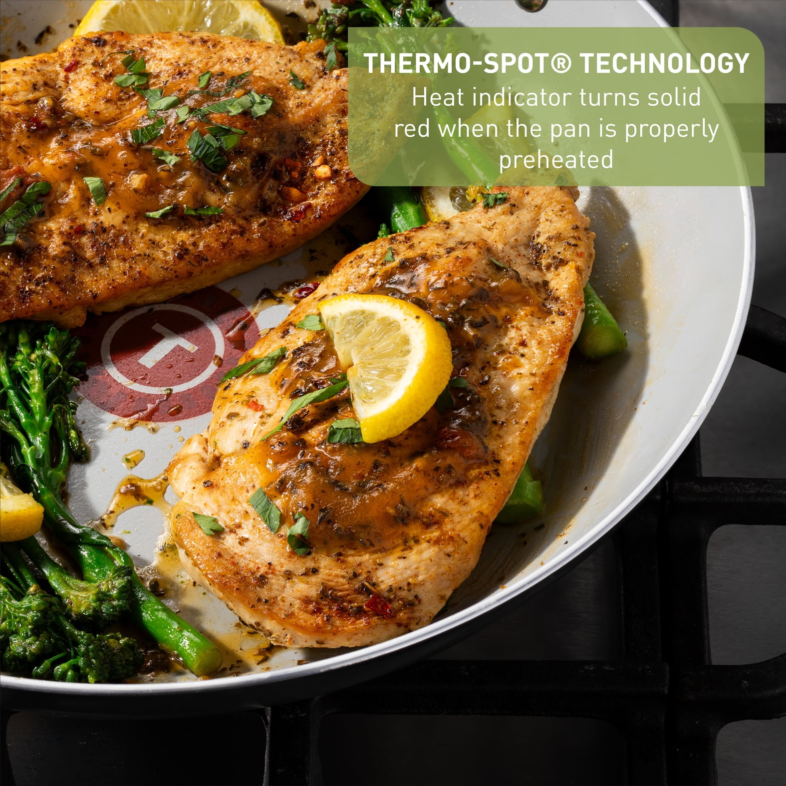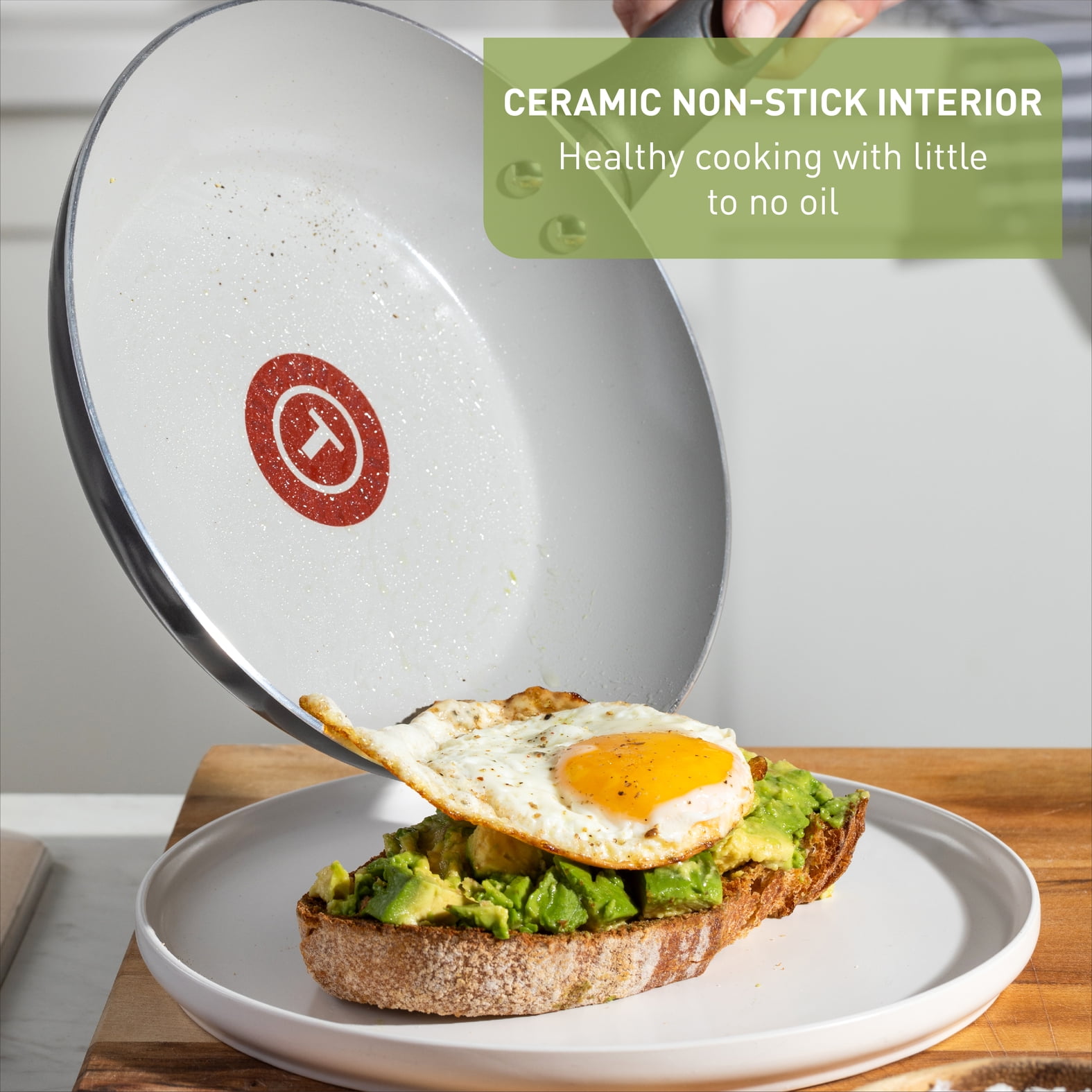 Add a touch of color and style to your kitchen our with T-fal Healthy Chef Ceramic cookware line, crafted with 100% recycled aluminum body and a ceramic non-stick interior for healthy and delicious meals. Featuring Thermo-Spot Technology, even heat base and comfortable handles to make cooking a breeze.