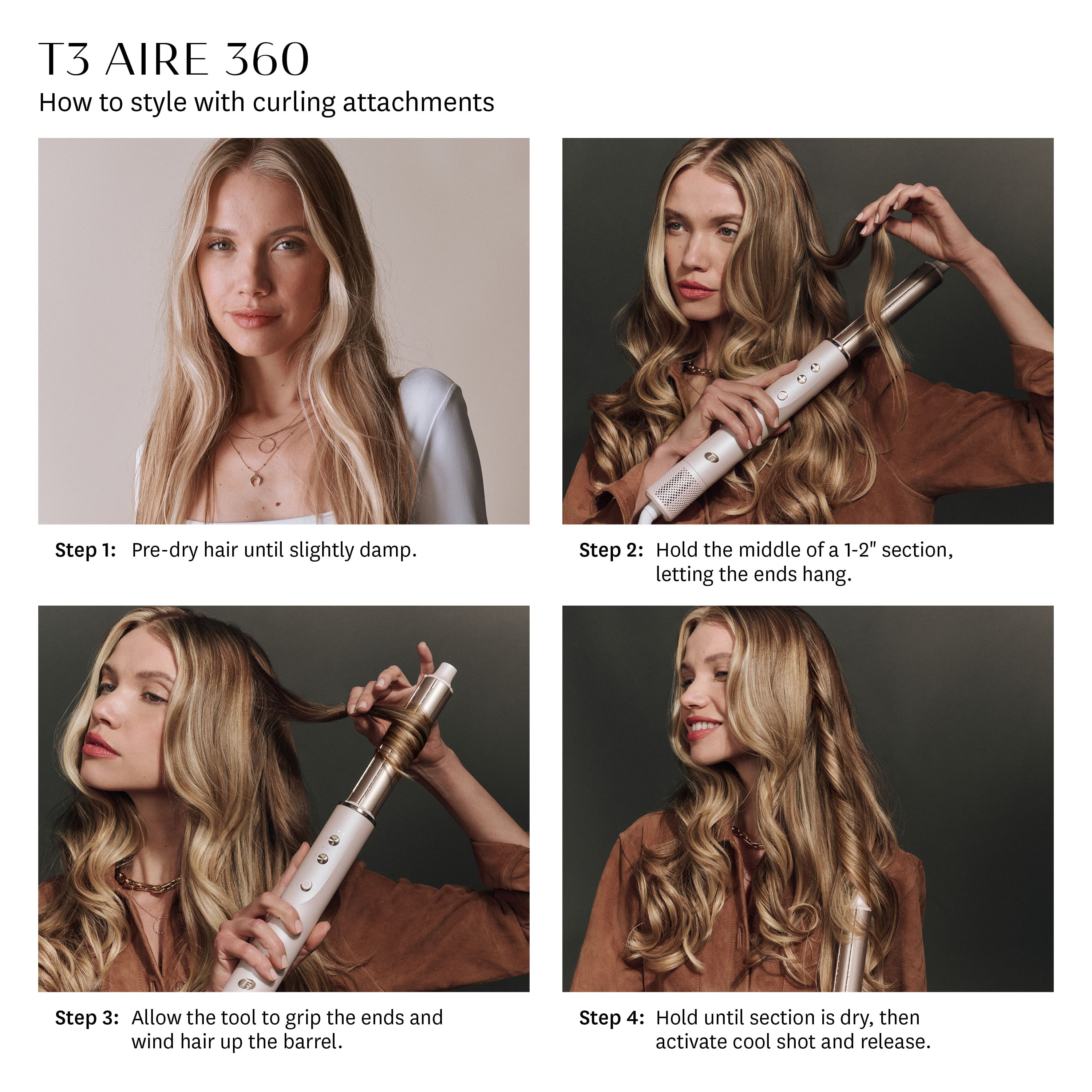 Discover air styling’s newest breakthrough. Designed with high-performance heat and ceramic attachments, the Aire 360 air styler blowout kit styles bouncy blowouts and lasting curls with nothing but air. Powered by T3 Aire 360 Technology, superior airflow wraps hair effortlessly to style blowout curls with zero heat damage,* and extra-long ceramic curling attachments harness high-performance heat to deliver long-lasting results. The custom-designed oval brush features SmoothGrip bristles and a ceramic surface for pro-level smoothing and shaping. And the SoftAire drying concentrator delivers fast-yet-gentle drying that helps protect hair’s natural moisture. All attachments pair with the Aire 360 base, engineered with a smart microchip for digital heat control and a high-speed AireX motor for our fastest drying yet. Fast, easy styling that’s gentle on hair. Big-time body and shine. Blowout curls that defy gravity.*Based on a third-party study in which a tensile strength test showed no mechanical damage to the hair when using the T3 Aire 360 curling attachments set on the highest temperature and highest velocity on hair in both a dry state and a 20% wet state.