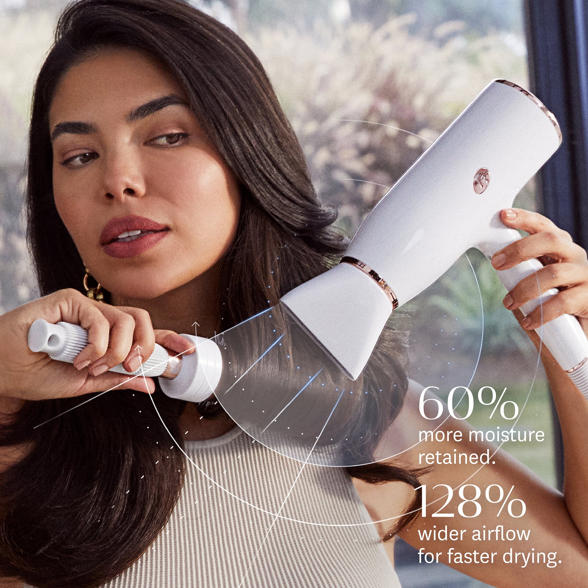 T3 RapidAire IQ Technology: Pairs digitally controlled heat with a wide, ion-rich airflow to cut dry time and preserve more of hair’s natural moisture. Ion generator: Infuses hair with 10 million negative ions to reduce frizz and smooth the hair cuticle for a shiny finish 5 heats and 3 speeds: Digitally controlled heat and speed selections tailored for all hair types and textures Volume Boost Switch: Boosts texture and volume Volume Boost Switch: Boosts texture and volume. Lock-in Cool shot: A burst of cool air locks in any style for a smooth, sleek finish 30% quieter operation: For a pleasant drying and styling experience Lightweight design: For comfortable styling Ergonomic Handle: Offers an easy grip, convenient operation and sturdiness while styling T3 RapidAire IQ Technology: Pairs digitally controlled heat with a wide, ion-rich airflow to cut dry time and preserve more of hair’s natural moisture. Custom-Engineered Fan: Optimizes airflow for fast-get-gentle drying with minimized heat exposure. Ion Generator: Emits 10 million negative ions per second to cancel frizz and smooth the hair cuticle. Smart Microchip: Digitally controls heat settings to keep temperature fluctuations in check. High-Volume Airstream: 128% wider air output*** dries more hair in less time. T3 Detangle Brush: Flexible bristles glide through strands to gently remove knots and tangles. T3 Volume 2.5 round brush: 2.5″ ceramic-coated barrel boosts body and shine for voluminous blowouts. Drying Concentrator: Delivers a wide airflow to gently dry hair fast. Styling Concentrator: Concentrates airflow to smooth and style, one section at a time. Professional 9ft length cord: For easier maneuvering around the bathroom during styling