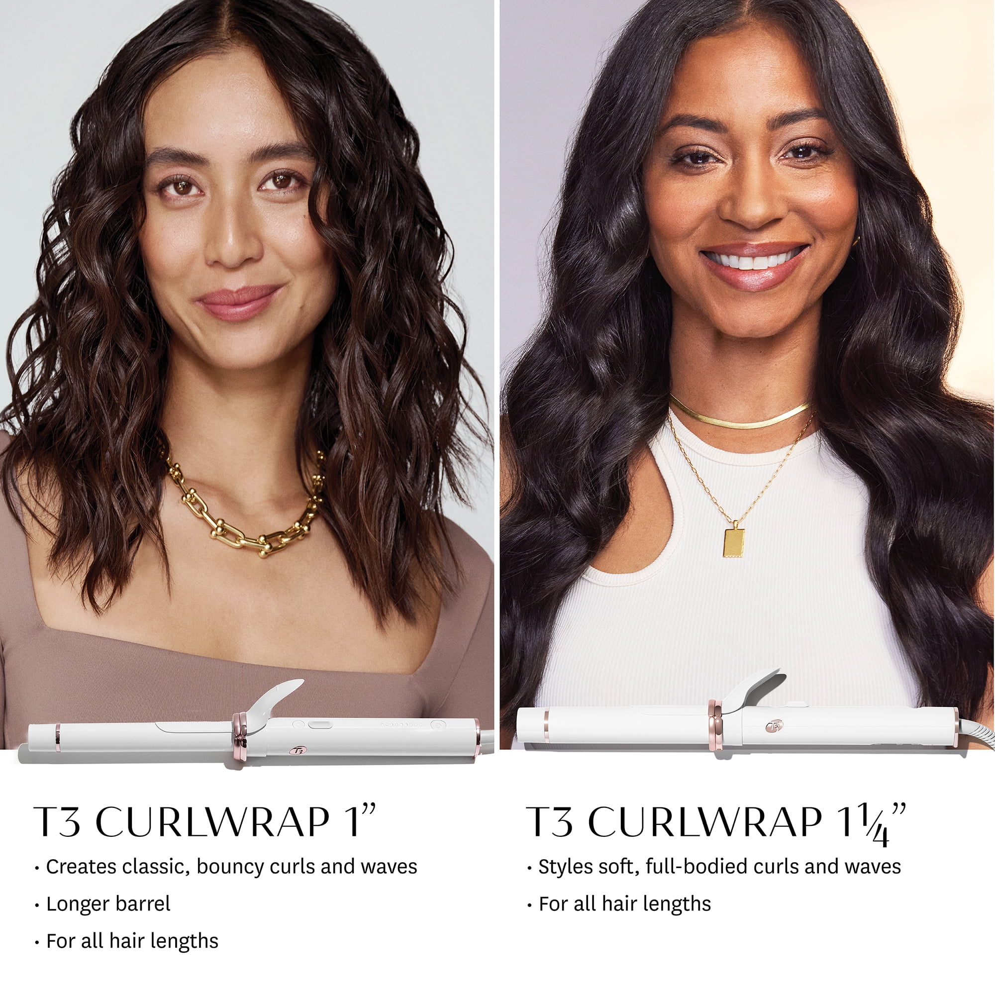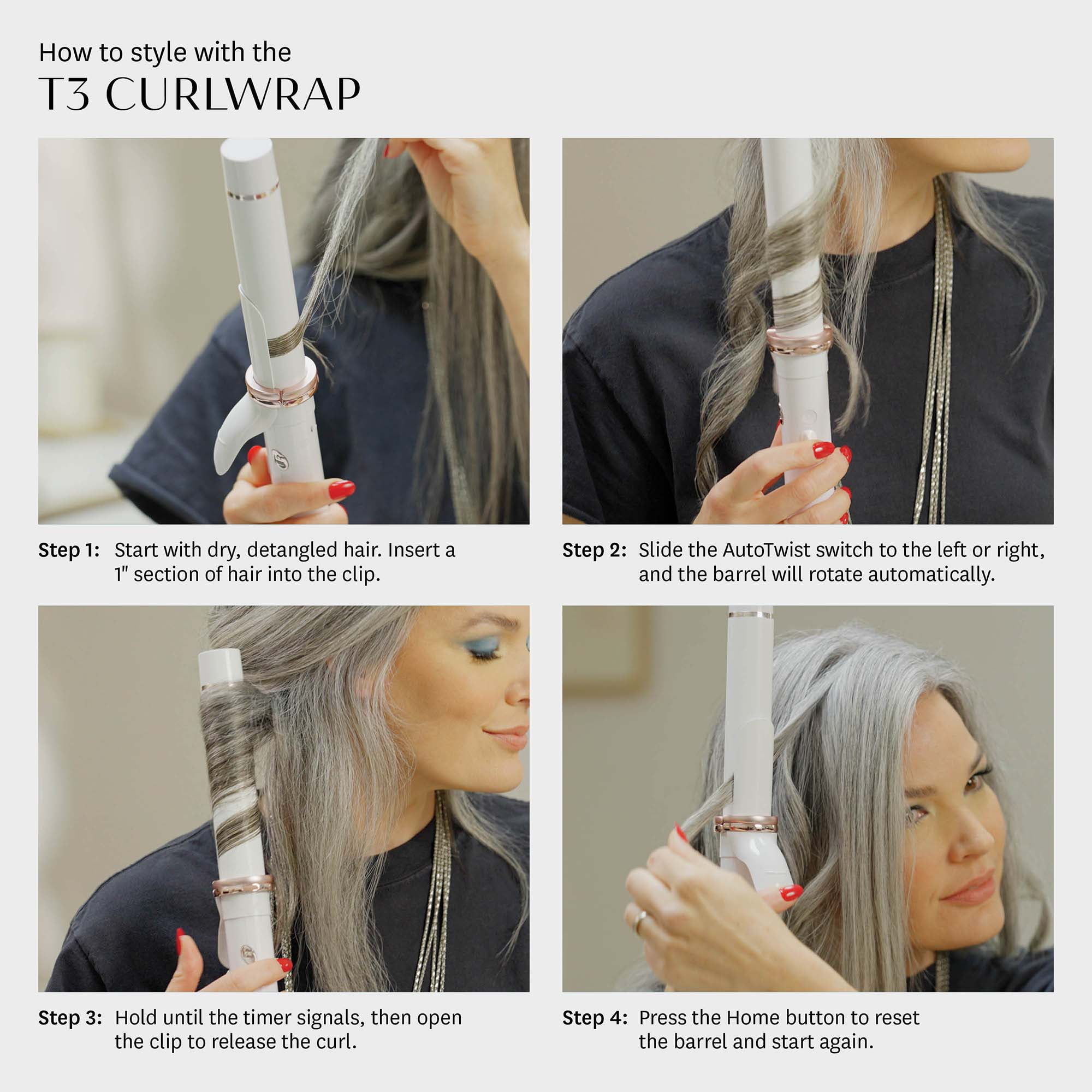 How to achieve curl perfection? Automate it. Powered by T3 AutoTwist Technology, the T3 CurlWrap automatic rotating curling iron features a 1.25″ self-rotating barrel to cut styling time and create perfect curls and waves. Choose from 9 heat levels, 2 SmartCurl timer settings, and 2 barrel rotation speeds to customize temperature and timing for your hair. Then secure a section of hair and press to wrap. The two-way AutoTwist switch steers effortless barrel rotation, and the SmartCurl timer will let you know when it’s time to release and start again. Activate Training Mode to test barrel speed and direction without using heat. Digital T3 SinglePass® Technology powers 9 precise heat settings for lasting results in just one pass, and a powerful negative ion generator smooths frizz and locks in shine. A custom-designed clip features the optimal length to keep hair secure without tangles or snags, and a long CeraGloss™ ceramic barrel delivers easy styling on all hair lengths. Other features include: Auto world voltage; 8ft., 360° Professional swivel cord; 2-Year warranty.