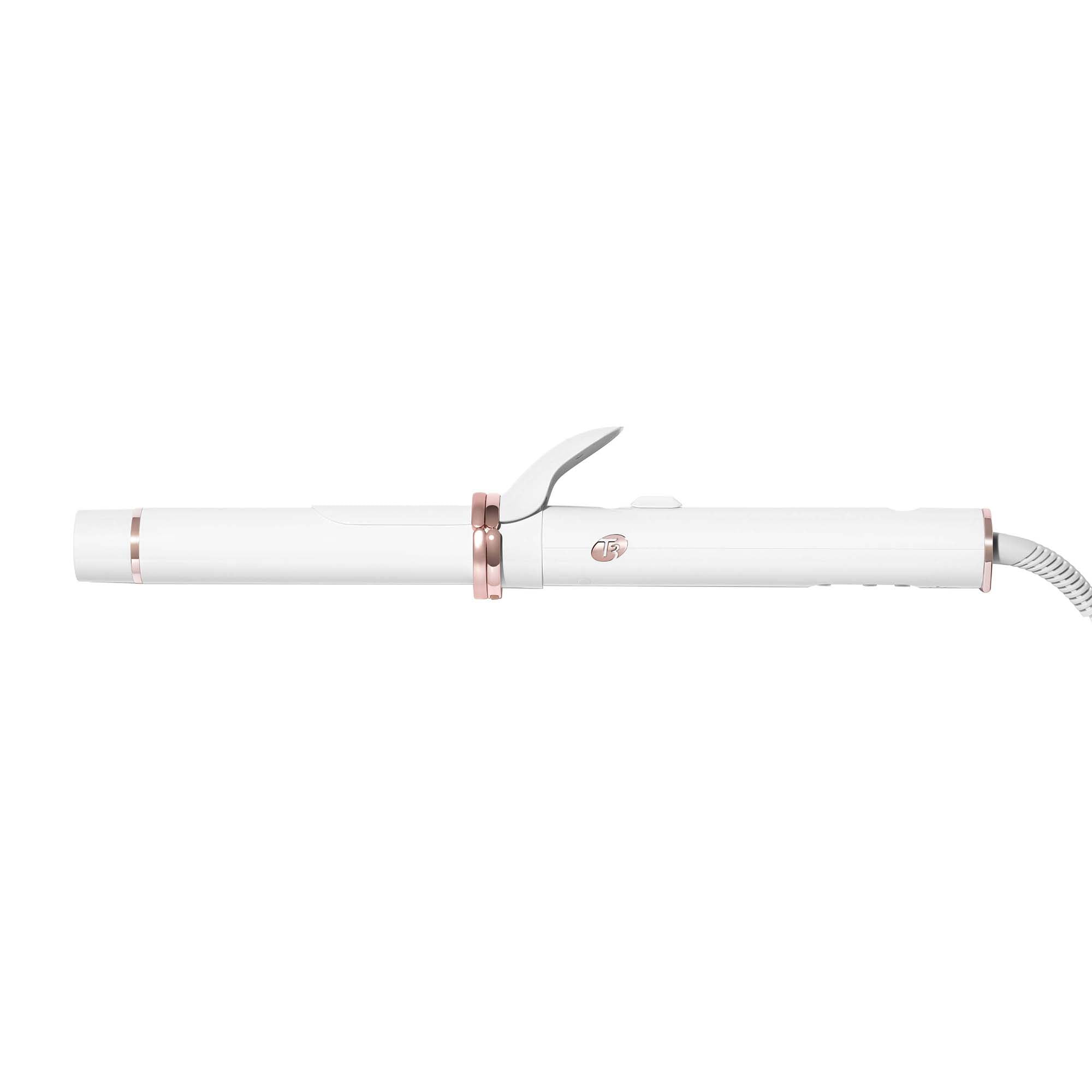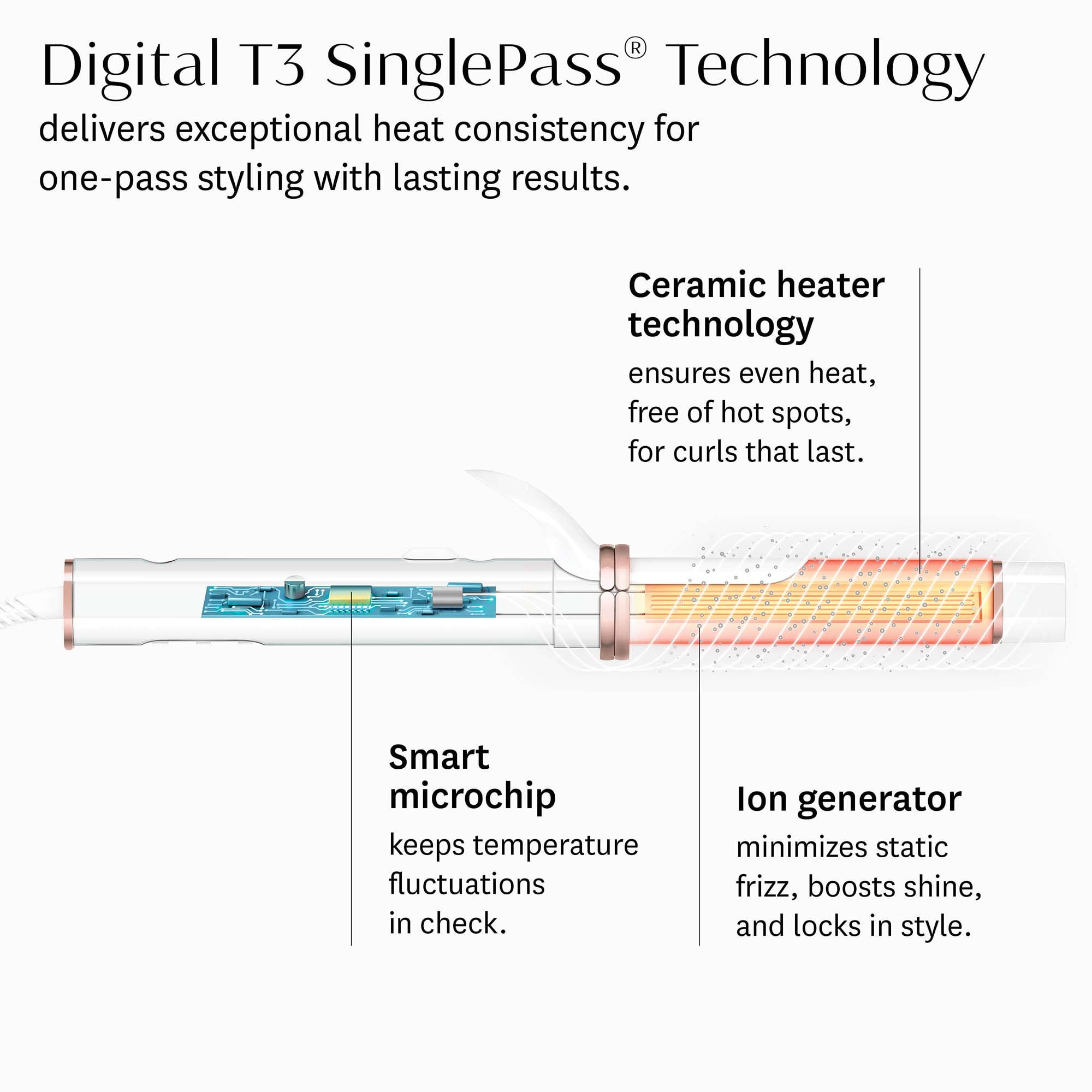 T3 AutoTwist Technology: Powers an automated, self-rotating barrel for effortless styling with flawless results. Sensory feedback: Guides your styling experience with gentle sounds and vibrations. Digital T3 SinglePass® Technology: Ensures exceptional heat consistency for one-pass styling with lasting results. Smart microchip: Digitally controls heat settings to keep temperature fluctuations in check. Ceramic heater technology: Ensures even heat, free of hot spots, for lasting results. 9 heat settings: Deliver precise heat for every hair type and texture. Ion generator: Minimizes static frizz, boosts shine, and locks in style.