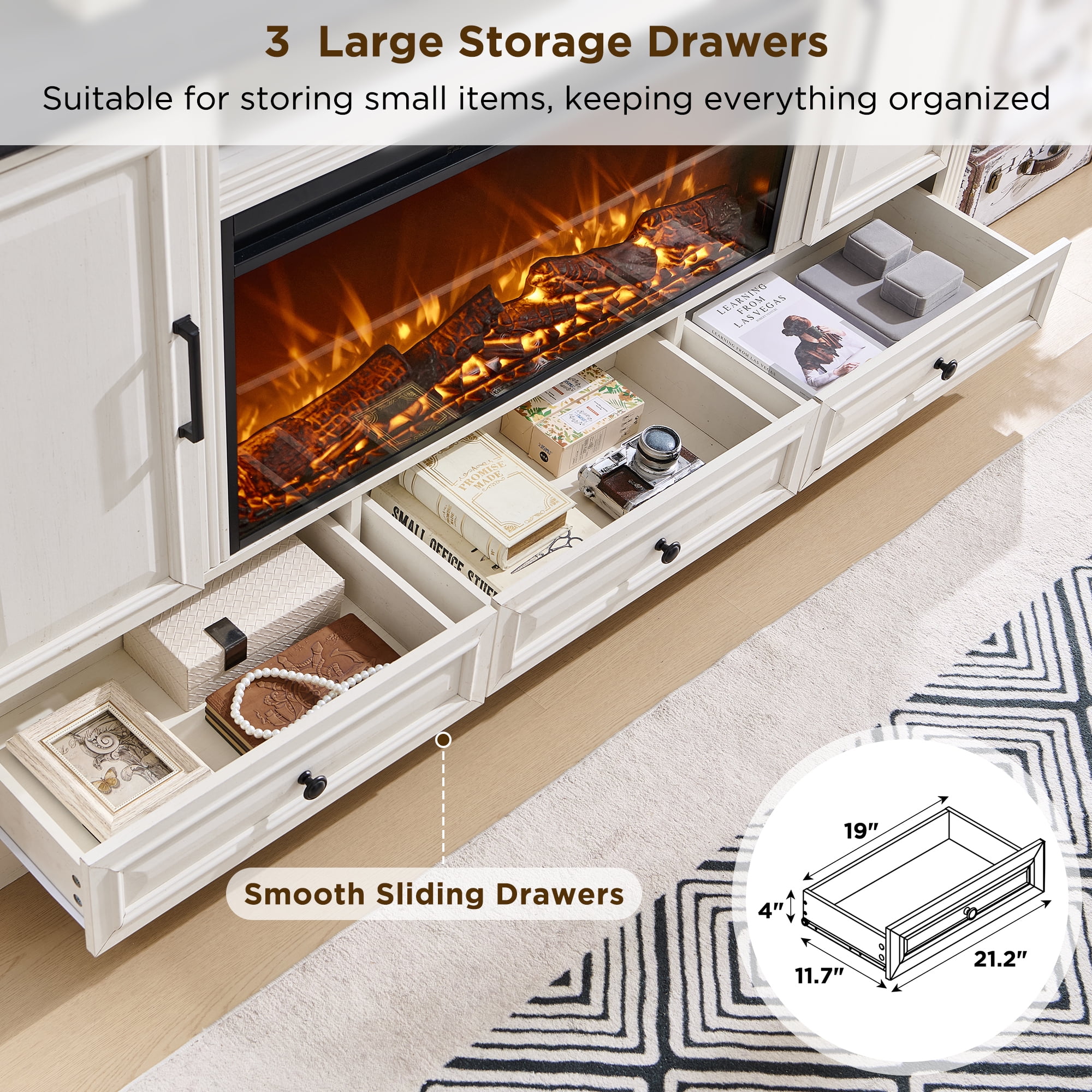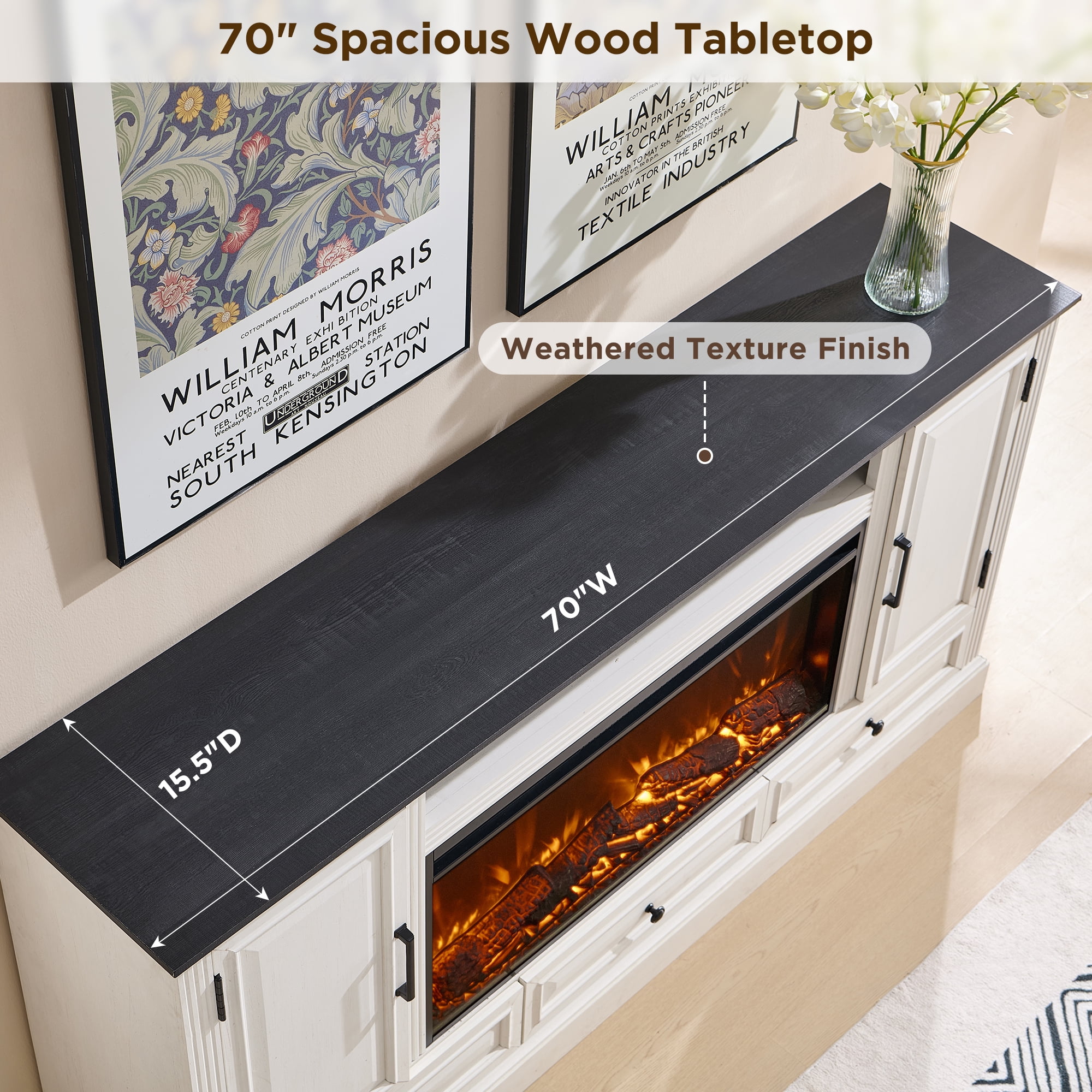 T4TREAM Farmhouse 70″ Fireplace TV Stand for TVs up to 80″, Entertainment Center W/36″ Electric Fireplace Highboy Media Console with Large Storage Cabinets and Drawers for Living Room, Antique White