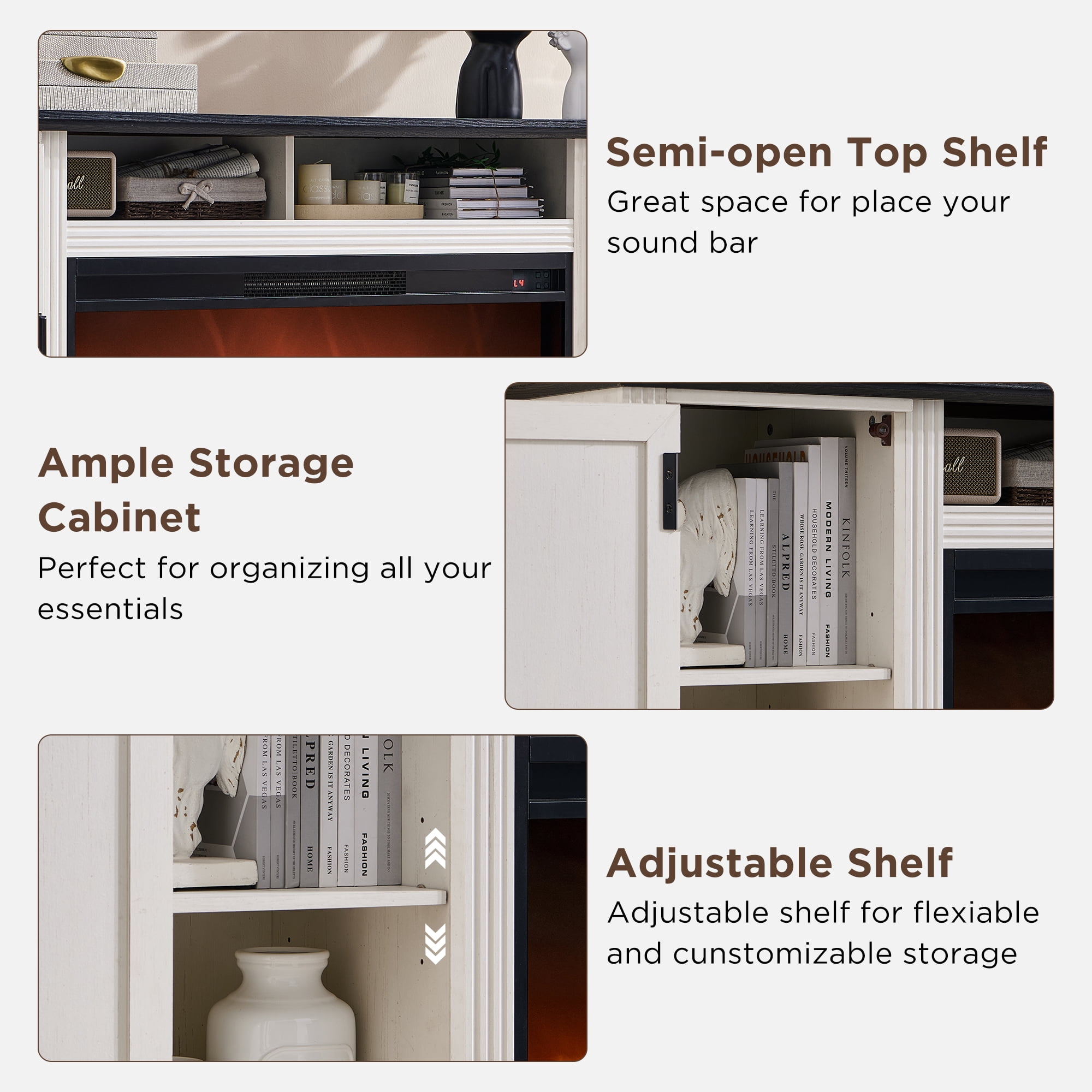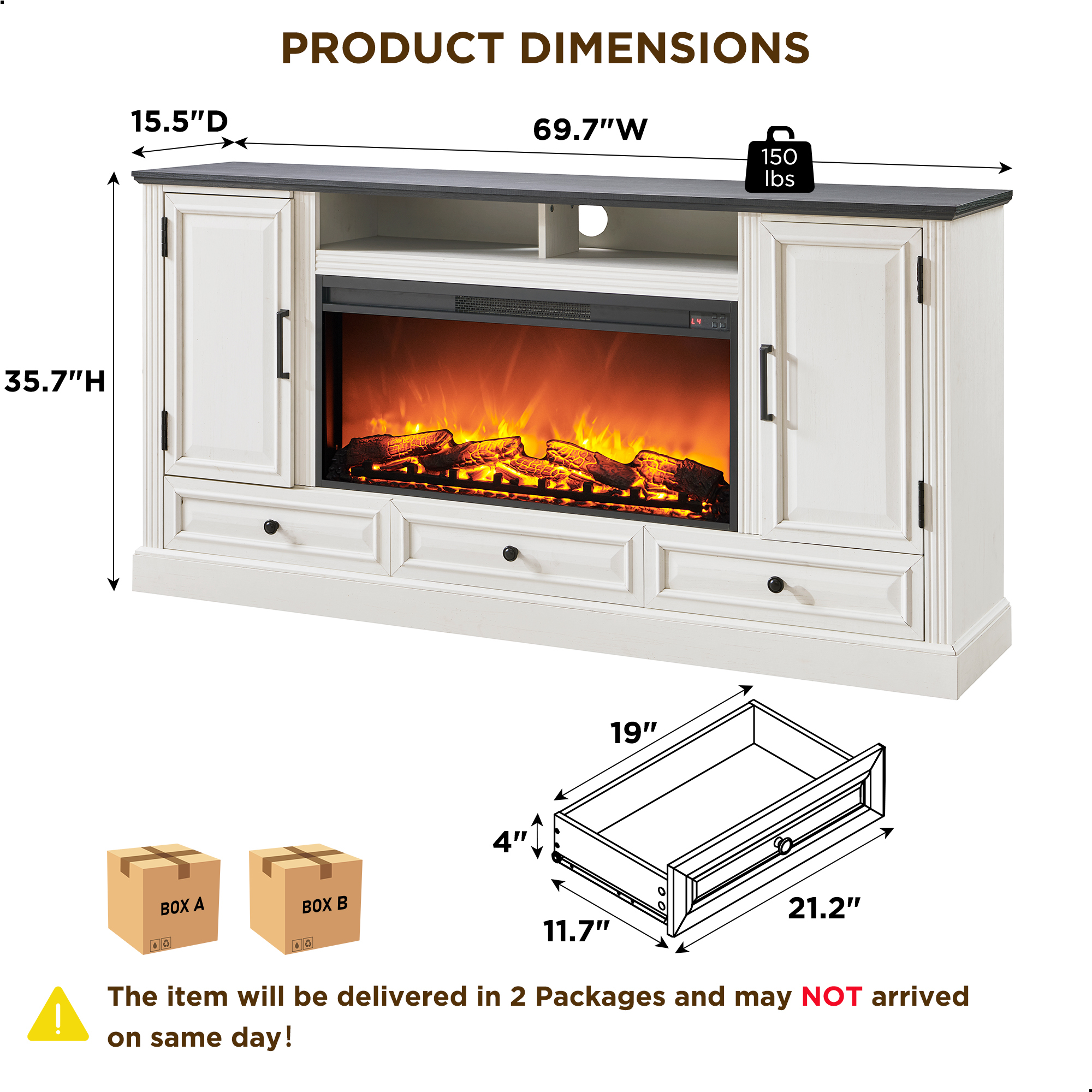 Product Overview 36-Inch Remote Control Electric Fireplace Features a realistic 3D dynamic flame effect with glowing logs and smoldering embers. Includes remote control and operation panel for easy temperature adjustment (64°F to 82°F) and timer settings (1-8 hours). Offers four brightness levels for a customizable flame experience. Equipped with safety features such as automatic shut-off to prevent overheating. Farmhouse Elegance Vintage Design Dimensions: 70″ W x 35.7″ H x 15.5″ D – accommodates TVs up to 80″. Showcases charming sliding barn doors and vintage metal accents for a rustic appeal. Features a unique weathered oak finish with natural texture variations. Available in multiple color options to complement various living room styles. Durable Construction Crafted from high-quality MDF and reinforced particleboard with a laminated finish. Solid 1-inch thick tabletop supports up to 150 lbs for stability. Includes a reinforced base with bracing and beveled edges, ensuring long-lasting durability. Versatile Storage and Cable Management Offers generous storage options including three spacious drawers and two side cabinets with adjustable shelves. Semi-open compartments with a 50 lb. capacity, and adjustable shelves in cabinets (30 lb. each) for customizable organization. Features three pre-drilled holes for efficient cable management, keeping your space tidy. Smooth sliding barn doors provide easy access to stored items. Easy Assembly and Customer Support Comes with clear, step-by-step assembly instructions and labeled parts for effortless setup. Extra hardware provided for your convenience and peace of mind. Includes a 30-day return window and warranty, backed by dedicated customer support for any inquiries. 36-Inch Remote Control Electric Fireplace Features a realistic 3D dynamic flame effect with glowing logs and smoldering embers. Includes remote control and operation panel for easy temperature adjustment (64°F to 82°F) and timer settings (1-8 hours). Offers four brightness levels for a customizable flame experience. Equipped with safety features such as automatic shut-off to prevent overheating. Features a realistic 3D dynamic flame effect with glowing logs and smoldering embers. Includes remote control and operation panel for easy temperature adjustment (64°F to 82°F) and timer settings (1-8 hours). Offers four brightness levels for a customizable flame experience. Equipped with safety features such as automatic shut-off to prevent overheating. Farmhouse Elegance Vintage Design Dimensions: 70″ W x 35.7″ H x 15.5″ D – accommodates TVs up to 80″. Showcases charming sliding barn doors and vintage metal accents for a rustic appeal. Features a unique weathered oak finish with natural texture variations. Available in multiple color options to complement various living room styles. Dimensions: 70″ W x 35.7″ H x 15.5″ D – accommodates TVs up to 80″. Showcases charming sliding barn doors and vintage metal accents for a rustic appeal. Features a unique weathered oak finish with natural texture variations. Available in multiple color options to complement various living room styles. Durable Construction Crafted from high-quality MDF and reinforced particleboard with a laminated finish. Solid 1-inch thick tabletop supports up to 150 lbs for stability. Includes a reinforced base with bracing and beveled edges, ensuring long-lasting durability. Crafted from high-quality MDF and reinforced particleboard with a laminated finish. Solid 1-inch thick tabletop supports up to 150 lbs for stability. Includes a reinforced base with bracing and beveled edges, ensuring long-lasting durability. Versatile Storage and Cable Management Offers generous storage options including three spacious drawers and two side cabinets with adjustable shelves. Semi-open compartments with a 50 lb. capacity, and adjustable shelves in cabinets (30 lb. each) for customizable organization. Features three pre-drilled holes for efficient cable management, keeping your space tidy. Smooth sliding barn doors provide easy access to stored items. Offers generous storage options including three spacious drawers and two side cabinets with adjustable shelves. Semi-open compartments with a 50 lb. capacity, and adjustable shelves in cabinets (30 lb. each) for customizable organization. Features three pre-drilled holes for efficient cable management, keeping your space tidy. Smooth sliding barn doors provide easy access to stored items. Easy Assembly and Customer Support Comes with clear, step-by-step assembly instructions and labeled parts for effortless setup. Extra hardware provided for your convenience and peace of mind. Includes a 30-day return window and warranty, backed by dedicated customer support for any inquiries. Comes with clear, step-by-step assembly instructions and labeled parts for effortless setup. Extra hardware provided for your convenience and peace of mind. Includes a 30-day return window and warranty, backed by dedicated customer support for any inquiries. Specifications Style: Farmhouse Material: MDF and Reinforced Particleboard Product Dimensions: 70″ W x 35.7″ H x 15.5″ D Overall Weight: 145 lbs Room Type: Living Room Recommended Use: TV Stand, Fireplace Entertainment Center Flame/Ember Bed : Realistic 3D dynamic flame effect Heating Capacity: 5000 BTU, efficiently heats up to 400 sq. ft. Top Shelf Dimensions: 70″ wide Tabletop Weight Capacity: Up to 150 lbs Style: Farmhouse Material: MDF and Reinforced Particleboard Product Dimensions: 70″ W x 35.7″ H x 15.5″ D Overall Weight: 145 lbs Room Type: Living Room Recommended Use: TV Stand, Fireplace Entertainment Center Flame/Ember Bed : Realistic 3D dynamic flame effect Heating Capacity: 5000 BTU, efficiently heats up to 400 sq. ft. Top Shelf Dimensions: 70″ wide Tabletop Weight Capacity: Up to 150 lbs Features Remote control operation Timer settings (1-8 hours) Adjustable shelves Cable management cutouts Classic sli