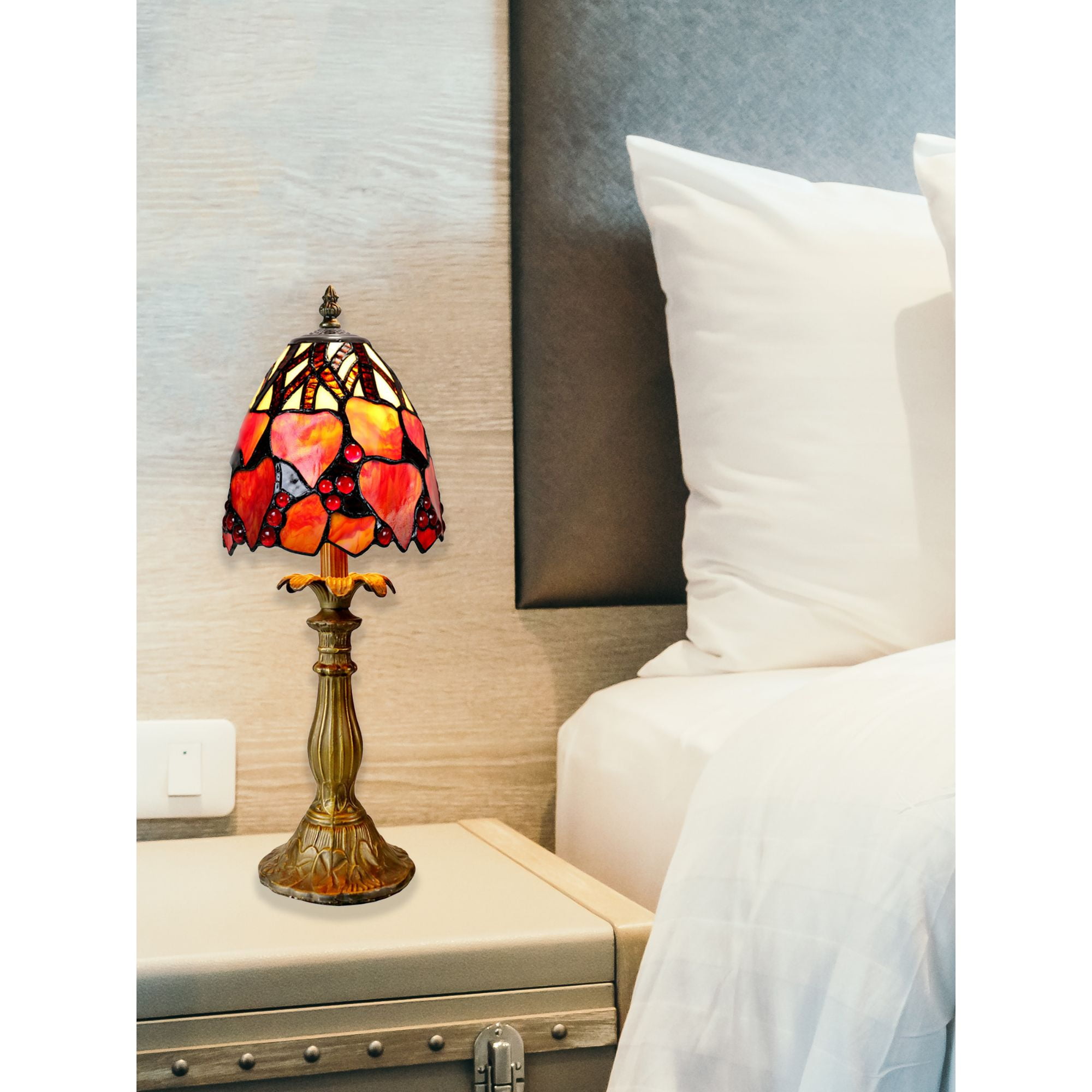 Our bright Estelle Tiffany Accent Lamp adds a dynamic pop of color to any room in your home or office. The neat fixture features a deep dome shade that is crafted of art glass pieces depicting a vibrant fruit tree with brown branches set against a white background. Red art glass gems are nestled amidst red and orange leaves that will glow warmly when Estelle is illuminated. Each glass piece is hand rolled and copper foiled using the same technique first developed by L.C. Tiffany in the late Nineteenth century; please allow for small variations in color as a result. The tree trunk style base is finished in Antique Bronze and features a frond detailed candle cup just below the shade. A perfect size to add eye catching color to a curio shelf, occasional table or vanity, our Estelle Tiffany Accent Lamp will provide you with years of artistically functional lighting.