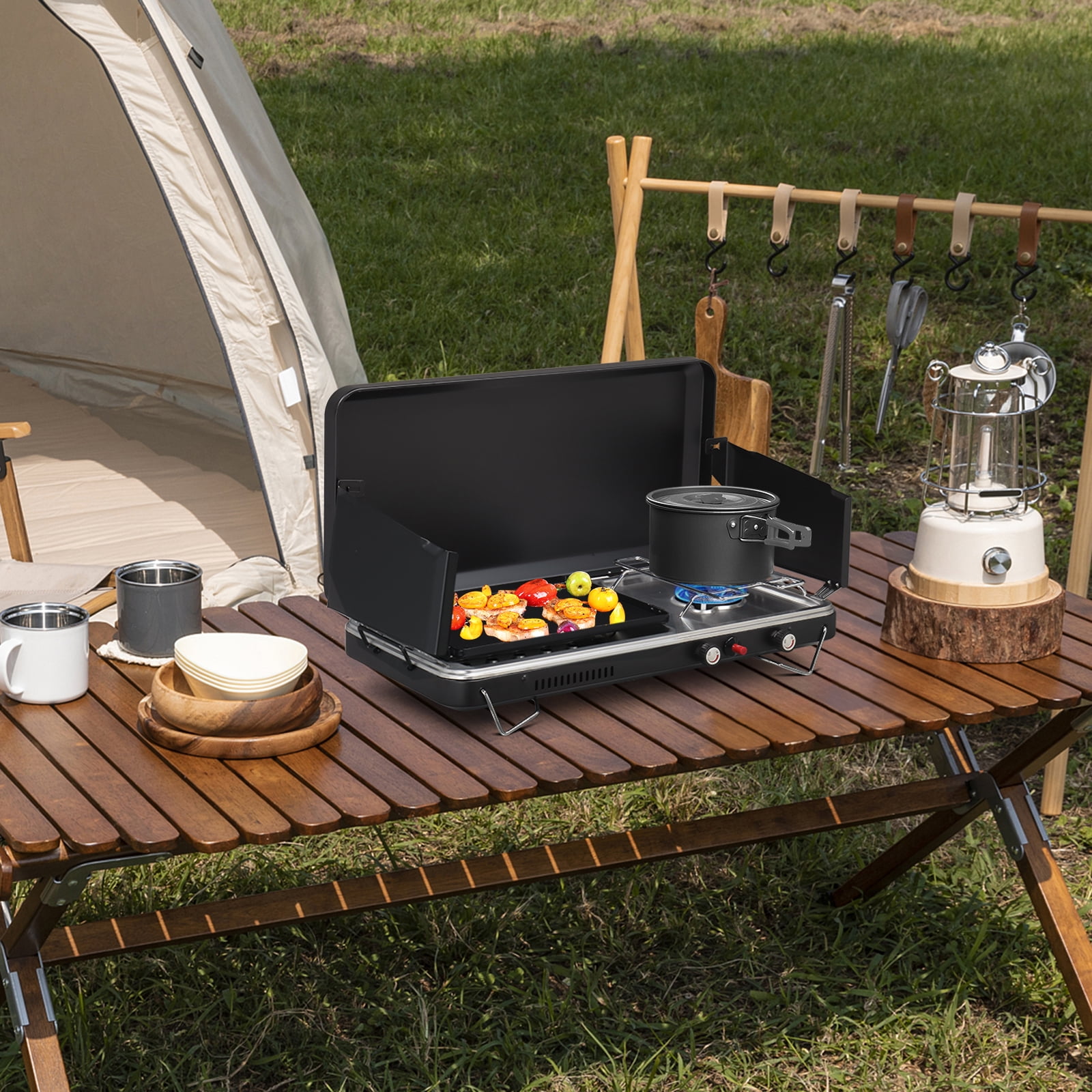 Tabletop 2-in-1 Camping Griddle/Stove Propane Stove Camping Portable Griddle Burner w/ Windpanel