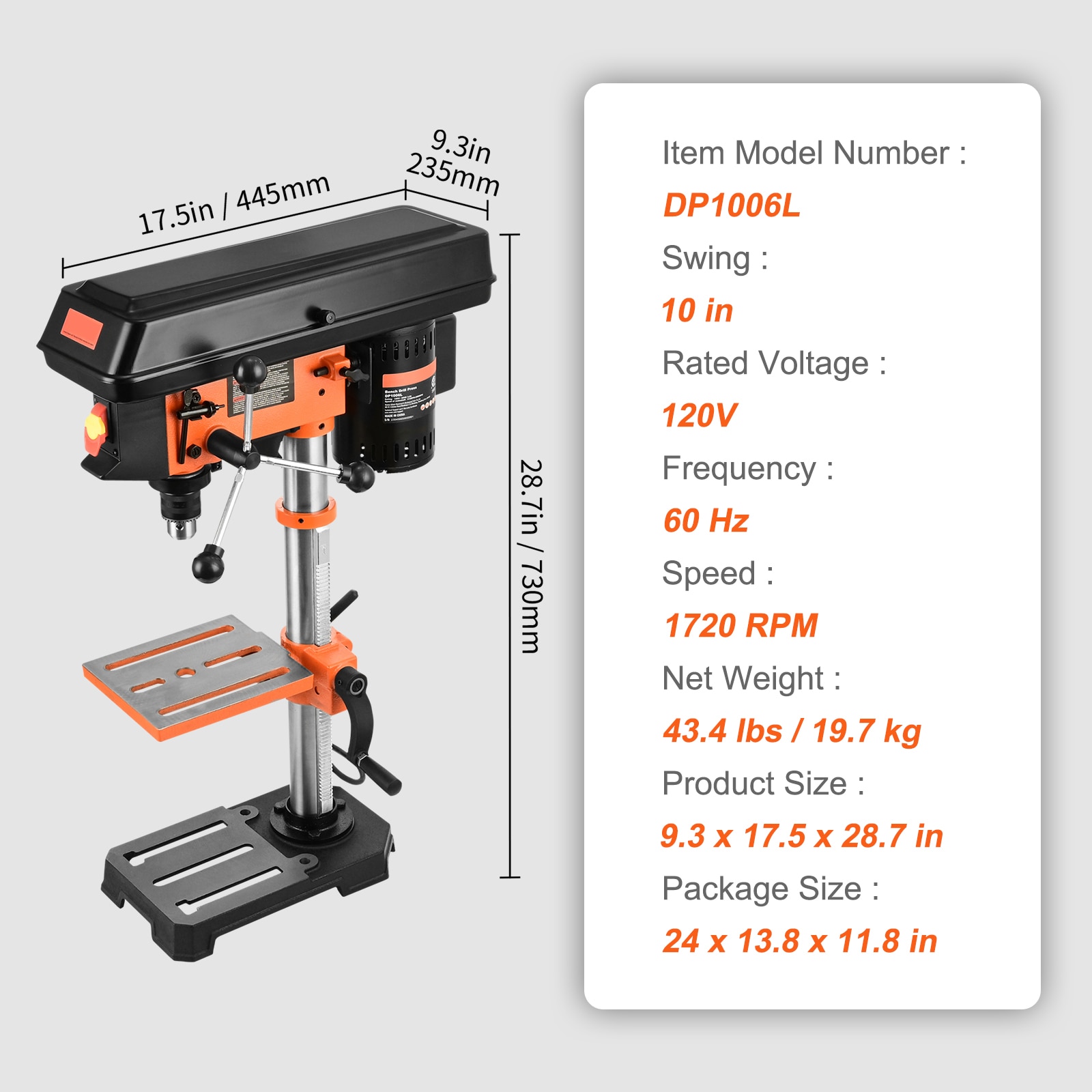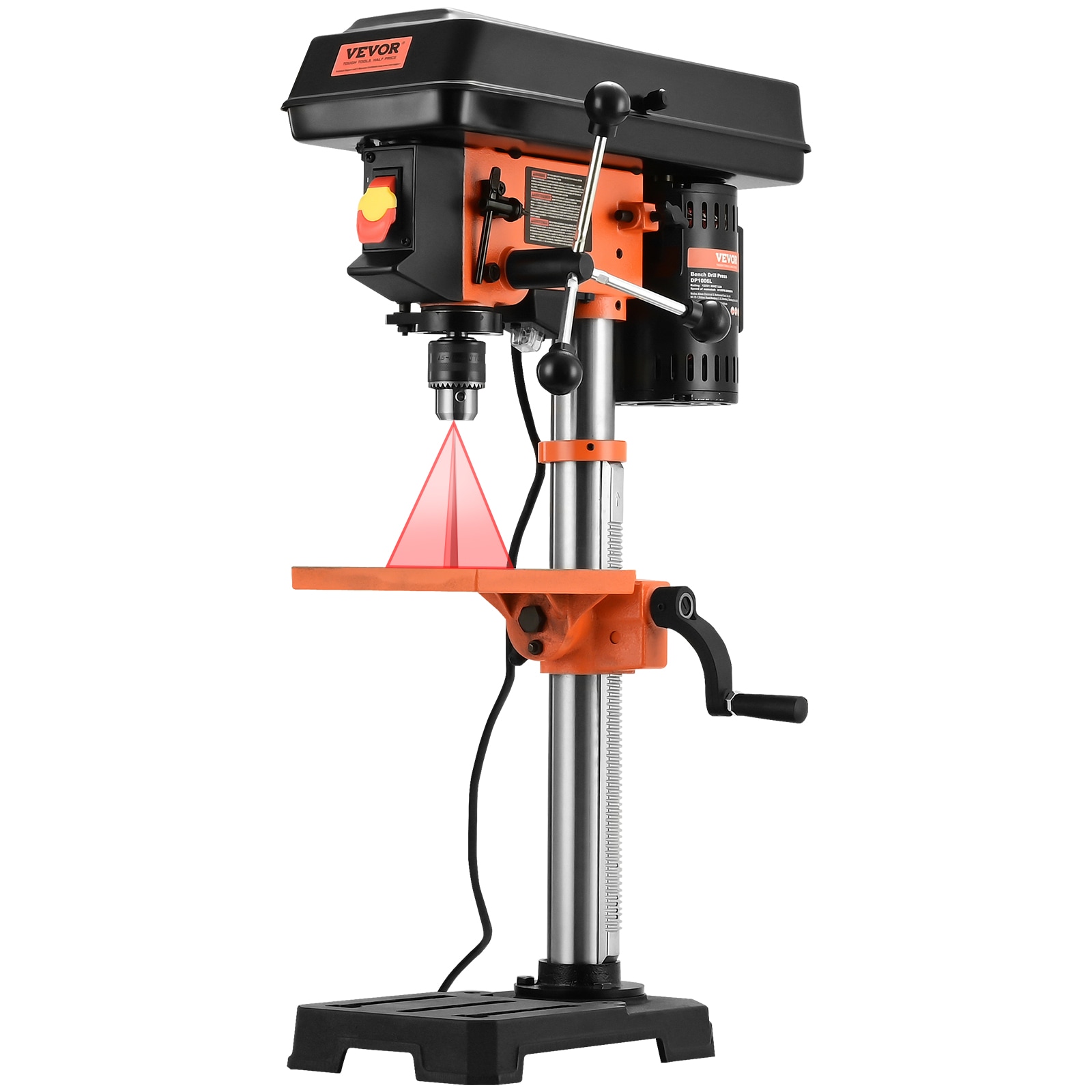 VEVOR 10-Inch Benchtop Drill Press: VEVOR 10-Inch benchtop drill press comes with a 5-speed adjustment and a powerful 3.2A induction motor to give you constant power to drill through wood and metal; Perfect for wood studios and labs, and can support your DIY creations and machining;; [Package Content] 2 x Hex Wrenches; 1 x Table Assembly; 1 x Base; 1 x Column Assembly; 1 x Table Crank Handle; 3 x M8*16 Hex Bolts; 3 x Feed Handles; 1 x Worm Gear; 1 x Table Lock Handle; 1 x Chuck; 1 x Chuck Key; 2 x AA Batteries
