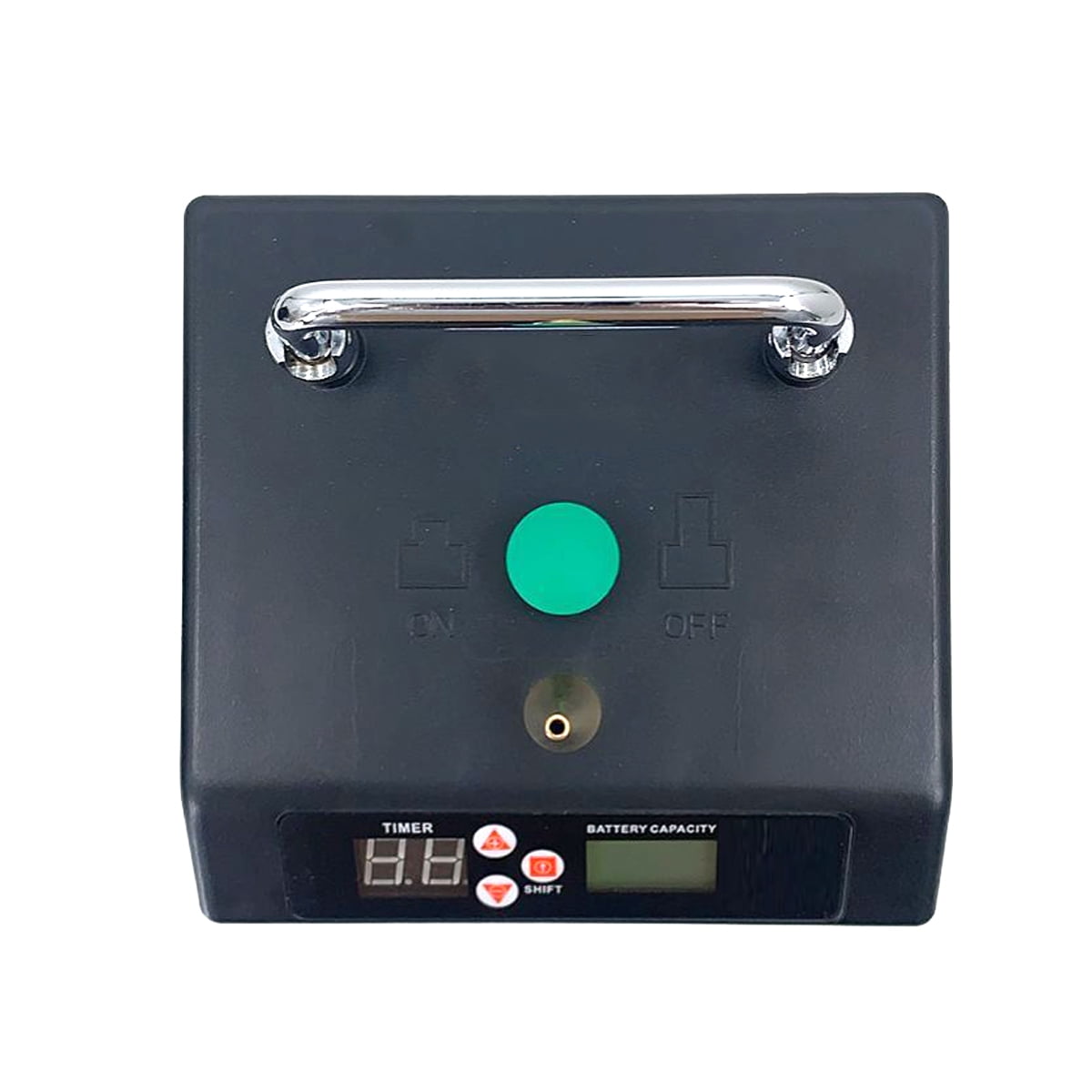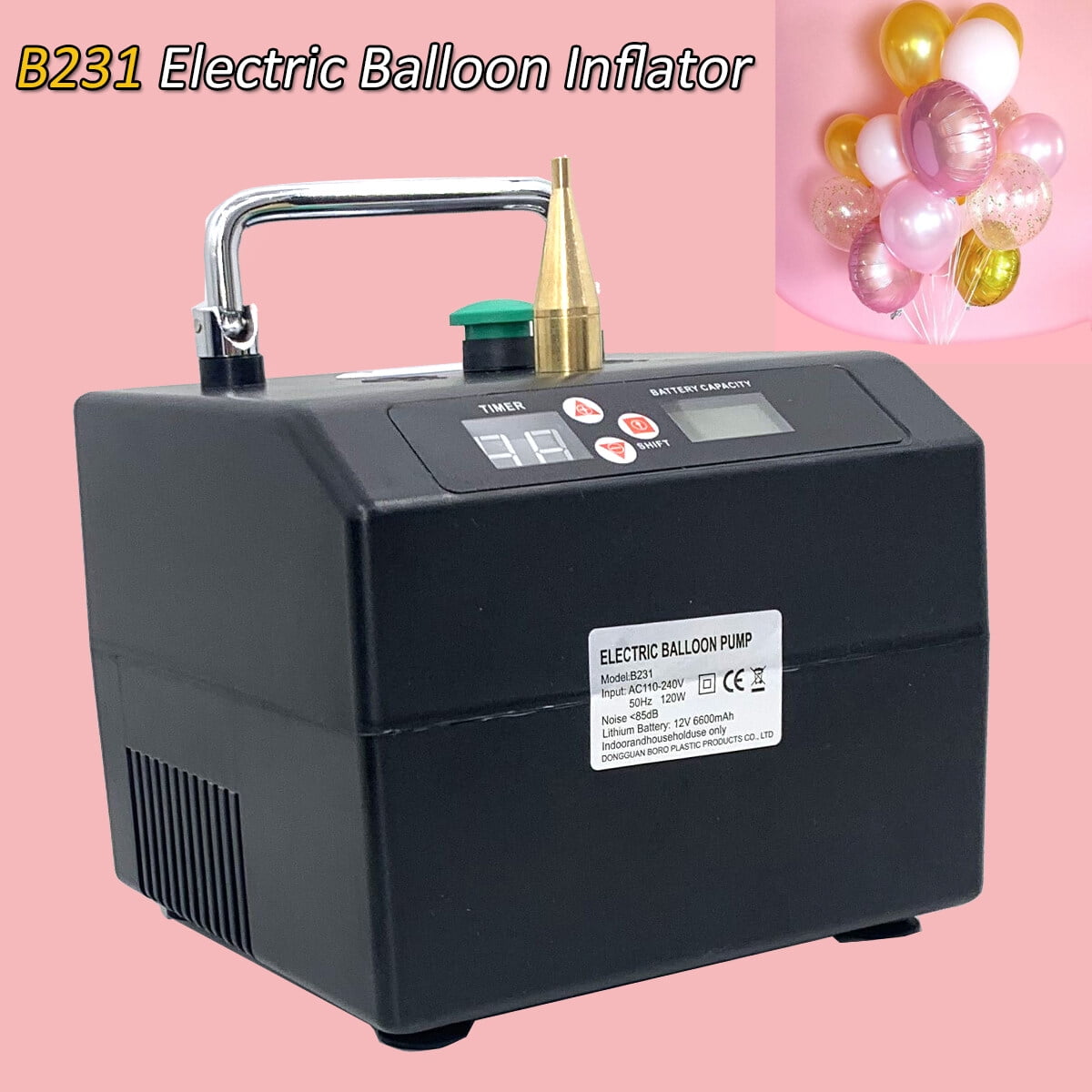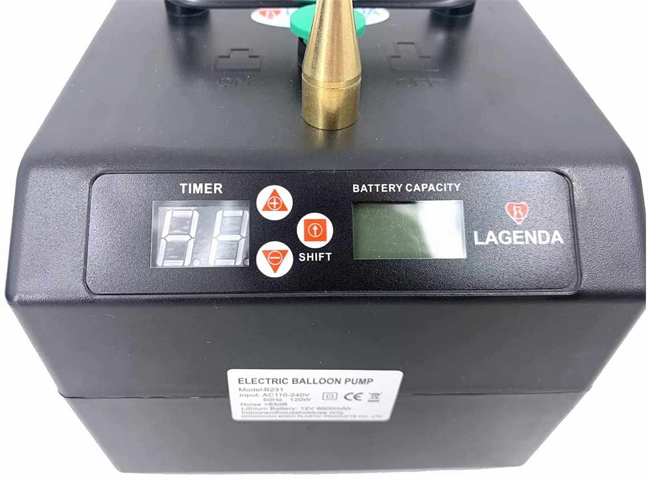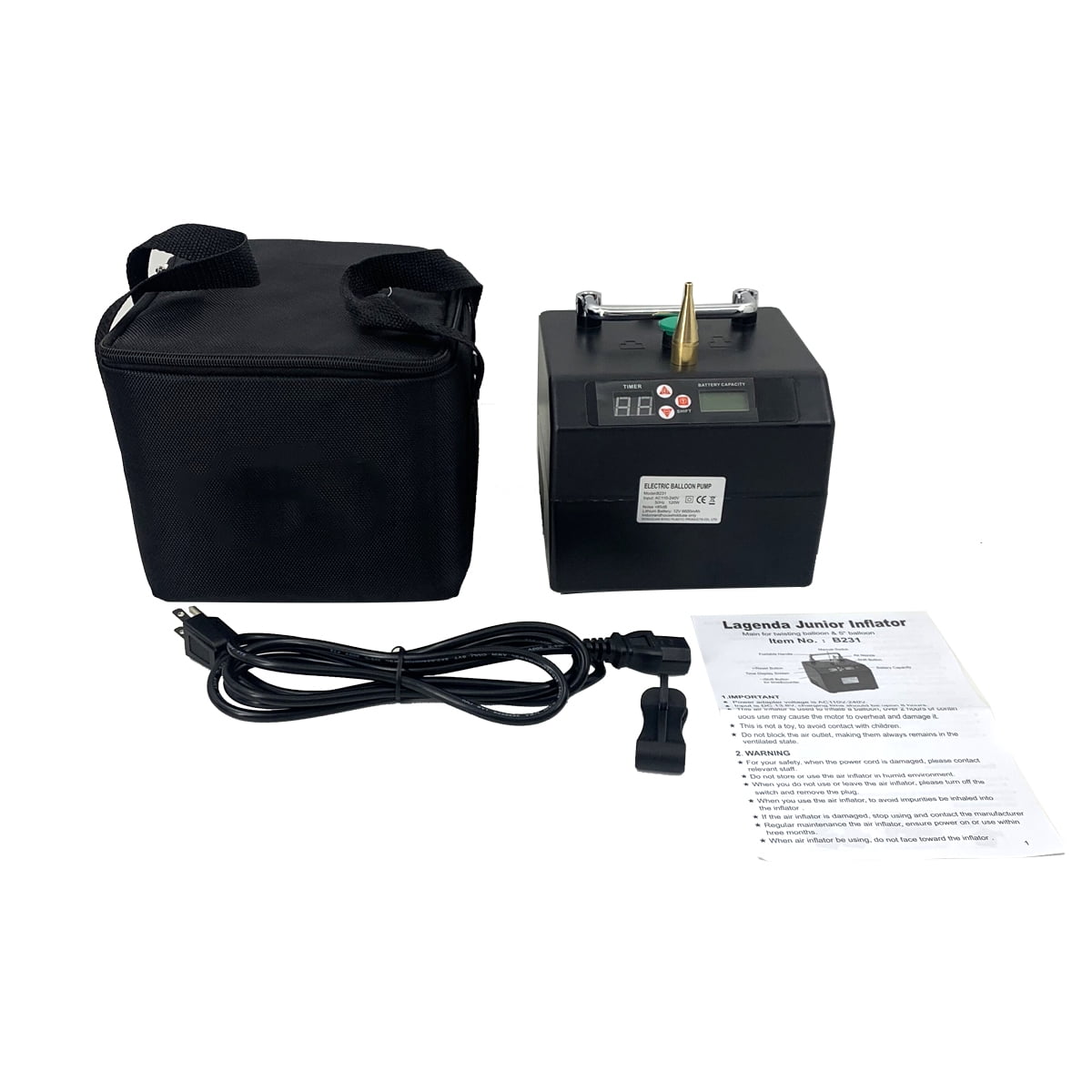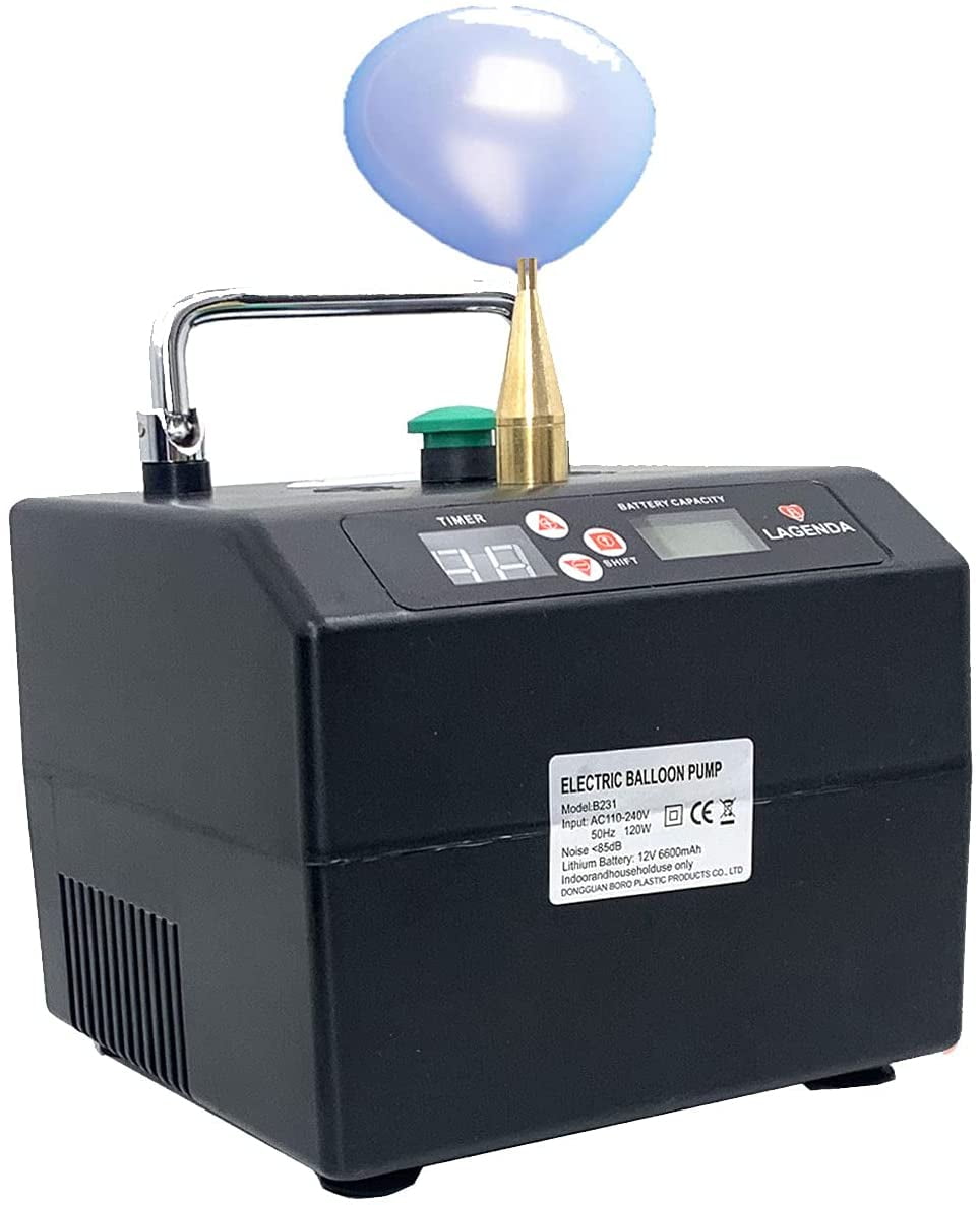 Product Description Introduction: This Electric Balloon Inflator perfectly sizes non-round balloons as well as smaller round and heart balloons. Timing function and power display screen. Easily create a warm atmosphere. This balloon inflator commonly used in some activities/festive/party/celebration/decoration. Features: It easily inflates double-stuffed balloons. It accurately sizes 231 and other non-round balloons. It can powered by a battery or plugged in. Built-in rechargeable lithium battery for easy carrying and long time use. If you connect two machines one will ?control? the other, so you can size two balloons simultaneously! 2 kinds of inflatable mode: 1. Manual mode: Press and hold the switch to inflate, Release the switch to stop inflate 2. Automatic mode: Press the switch to inflate, automatic stop to inflate arrival to timed It can be timed, Time adjustment range is: 0.1 ~9.9 seconds . Filling a balloon needs 1.3 seconds. The high quality brass nozzle is sturdy and capable of inflating balloons of different sizes. It can inflate the standard sized 260 animal balloons, the smaller 160 pencil balloons, or even the much larger 350 balloons. Because of it’s powerful motor, it is also able to inflate double-stuffed balloons for those wishing to create custom colors or designs out of their latex. Specifications: Material: ABS Color: Black Input: AC 110V/50Hz 120W Range of time: 0.1-9.9 secs. Modeling Balloon inflator: For 160/260 and 5 inch balloon Product Size: 14 x 14 x 17 cm / 5.5*5.5*6.7 inch Net Weight: 2.4 kg Package Includes: 1 x Electric Balloon Pump 1 x Power cable 1 x User Manual 1 x Carry bag