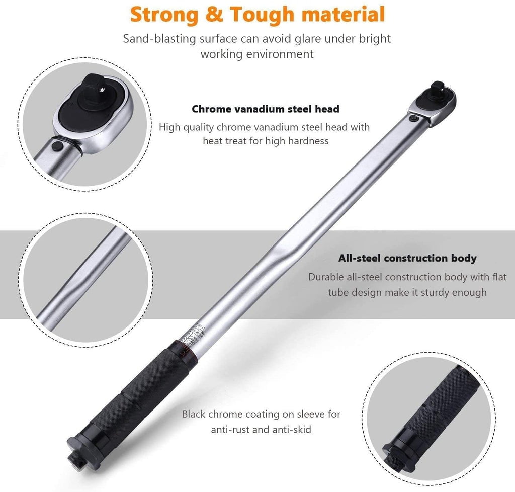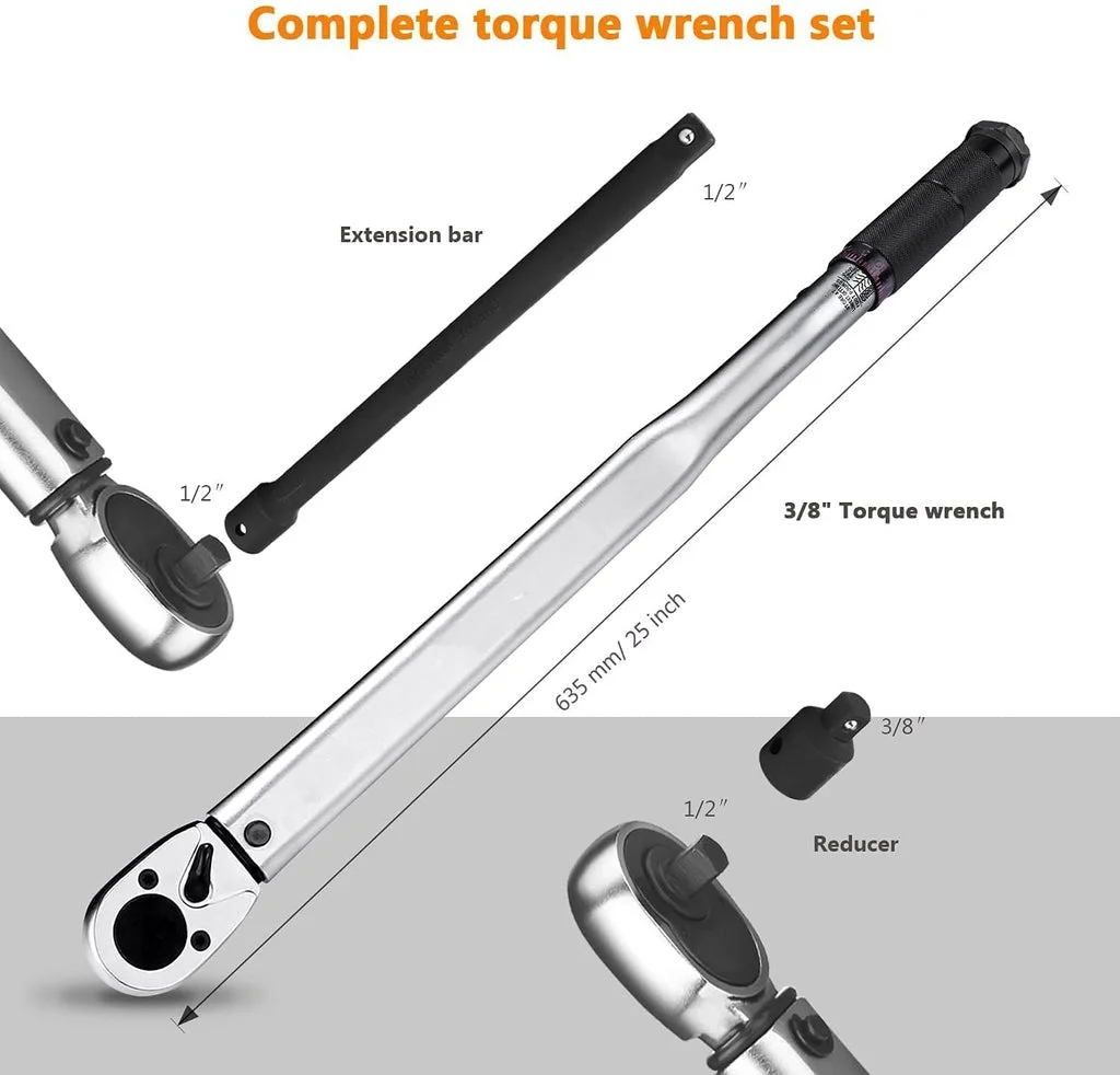 ãAccuracyãEach torque wrench passed the calibration according to DIN-ISO-6789(international standard) within +/- 4%. ãHigh QualityãAll steel construction make it lightweight and compact,laser engraving dual-range scale improves numeral clarity, Made in Taiwan. ãClick WrenchãA click, which can also be felt by the operator through the grip, warns when the required torque is reached. ãReversible RatchetãClockwise & Counter-clockwise suitable for restricted spaces,measures torque in clockwise direction. ãUpgraded AccessoriesãA good all around wrench come with 1/2”Extension Bar and 3/8″ Reducer.